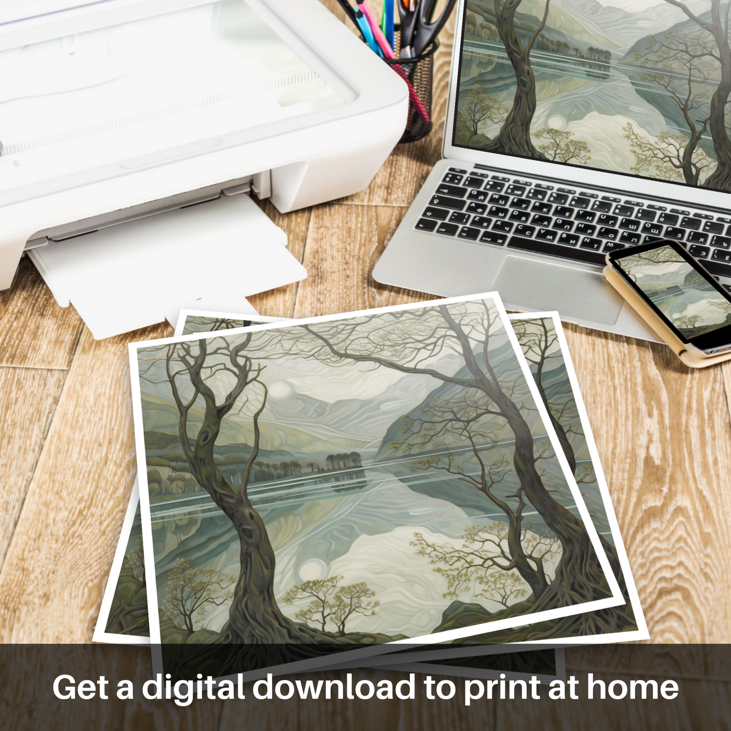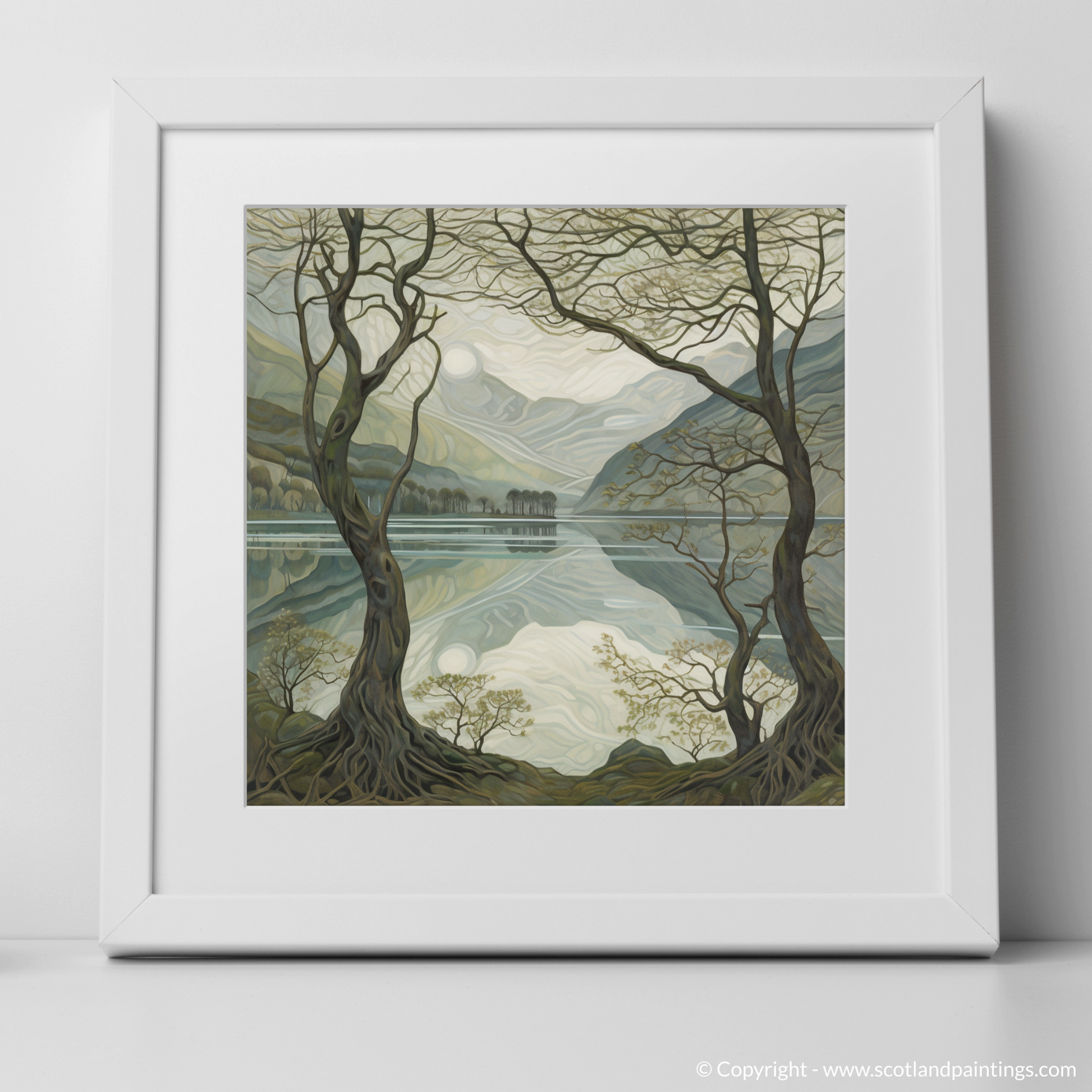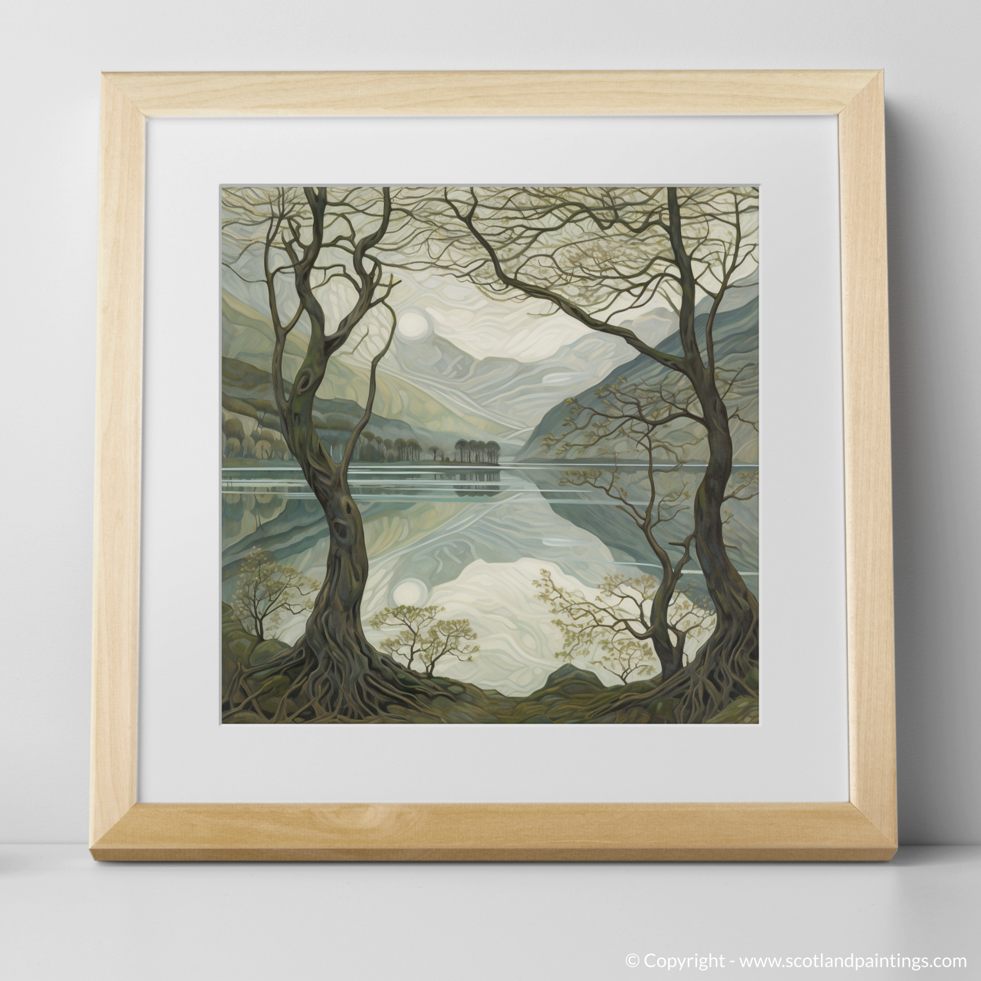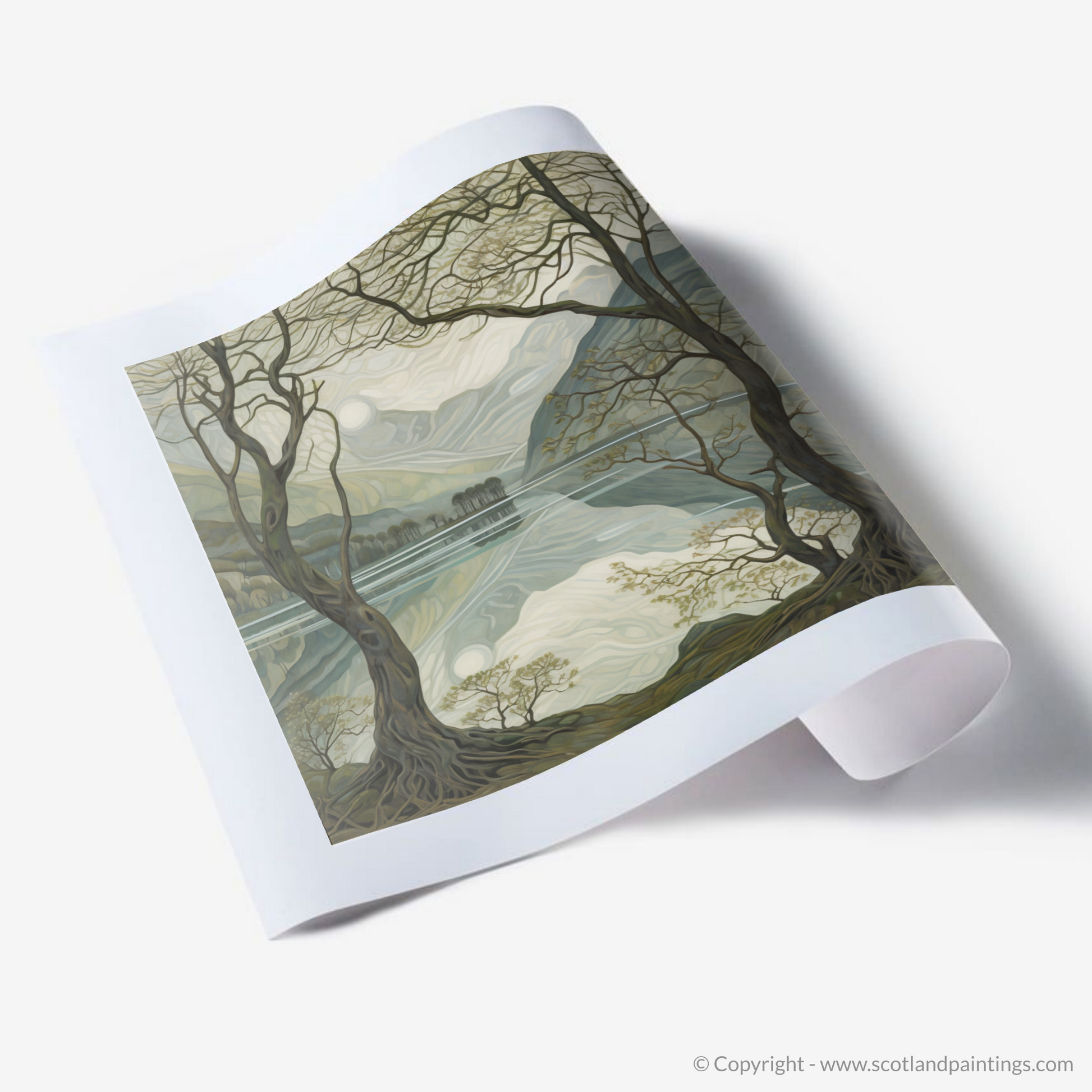 Envelop your senses with the tranquil beauty of this exquisite homage to Loch Voil, a gem cradled in the Scottish Highlands. The serene composition invites the viewer to step into a bygone era where the elegance of Art Nouveau converges with the timeless allure of nature.