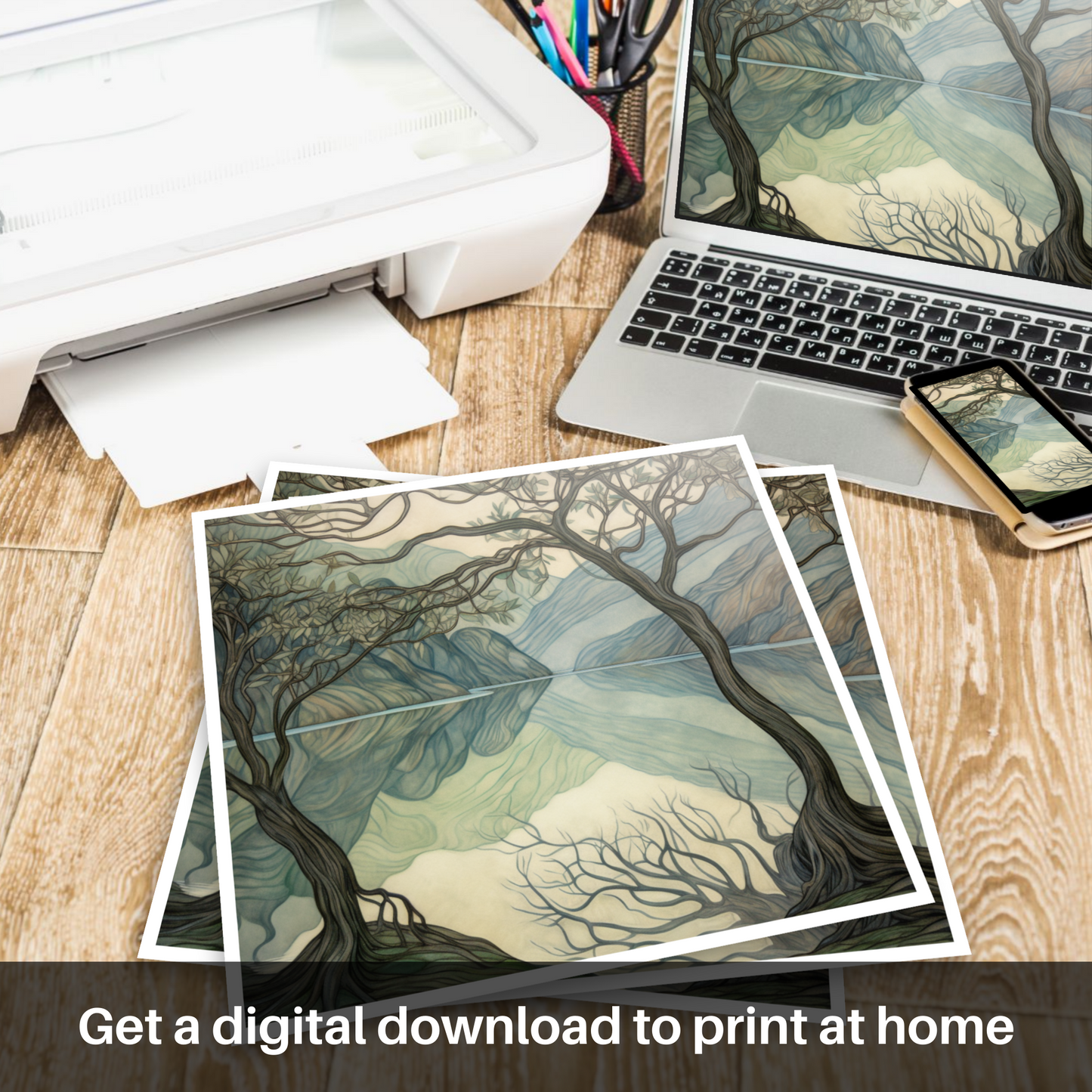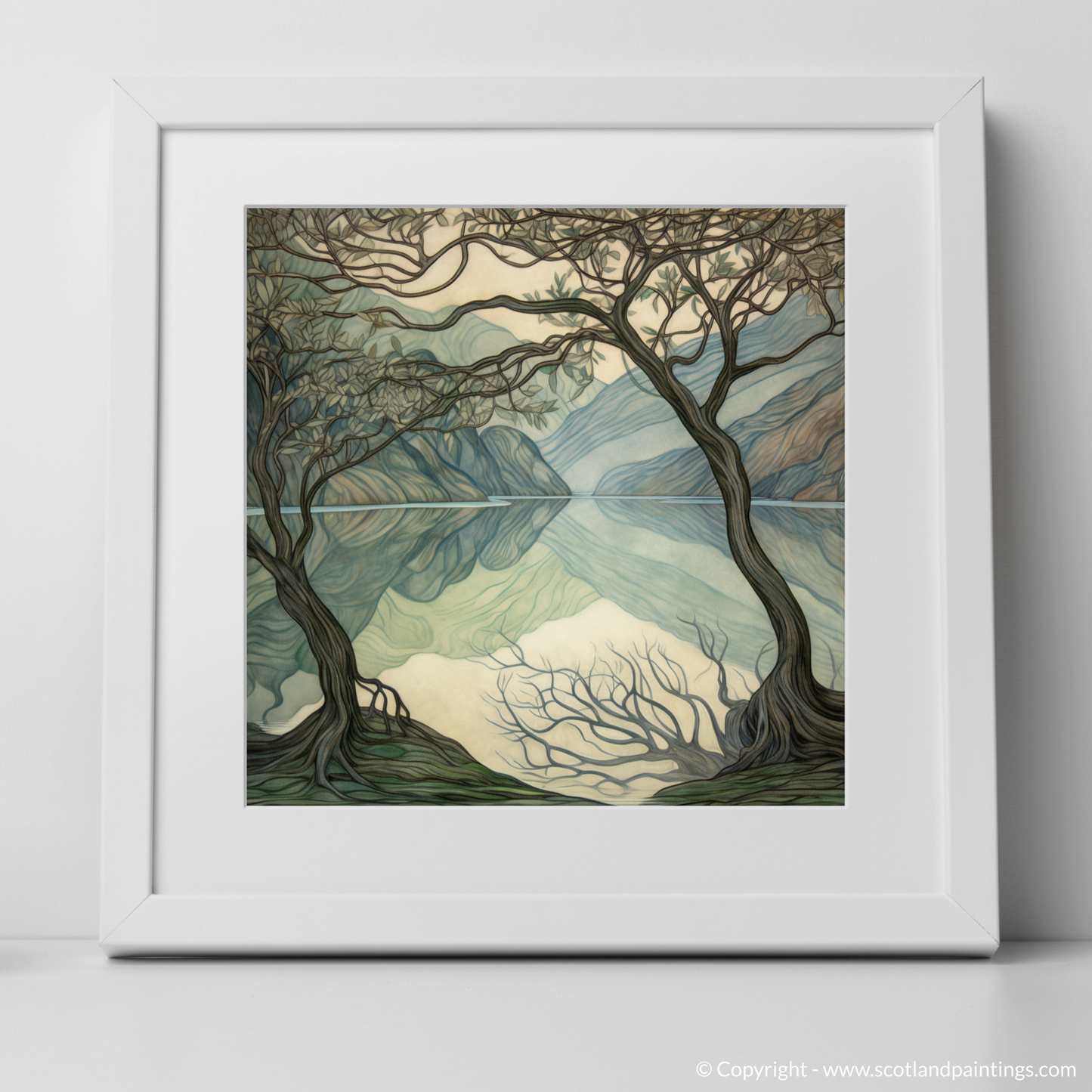 The ornate trees in the foreground stand as sentinels, their trunks dark and sturdy amidst the tender dance of leaves and twigs. The mirrored reflection on the water's surface creates a dream-like symmetry, adding to the print's otherworldly charm. This beautiful tribute to both the Art Nouveau movement and the majestic Loch Voil is a timeless addition to any collection, mesmerising viewers with its intricate details and soothing palette.