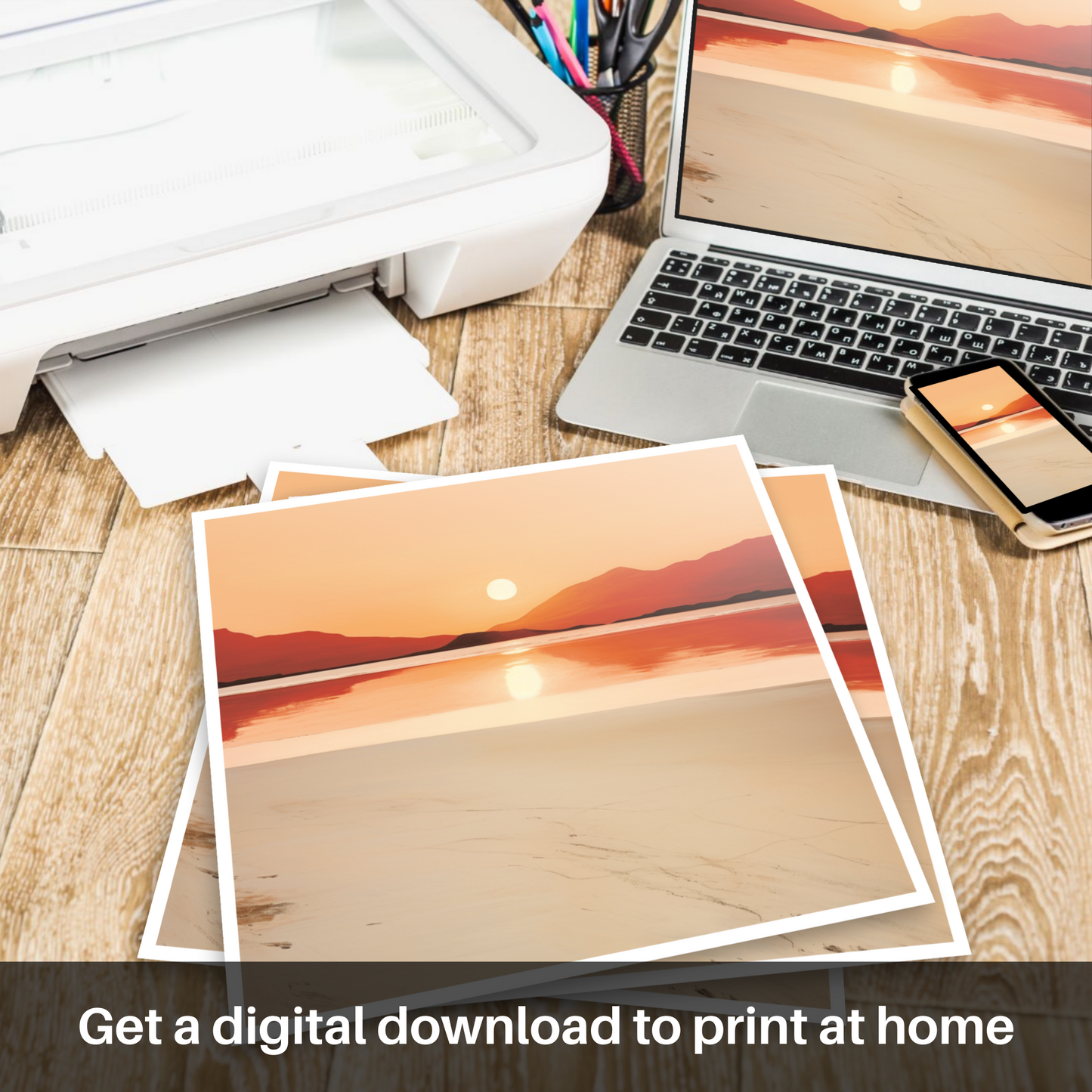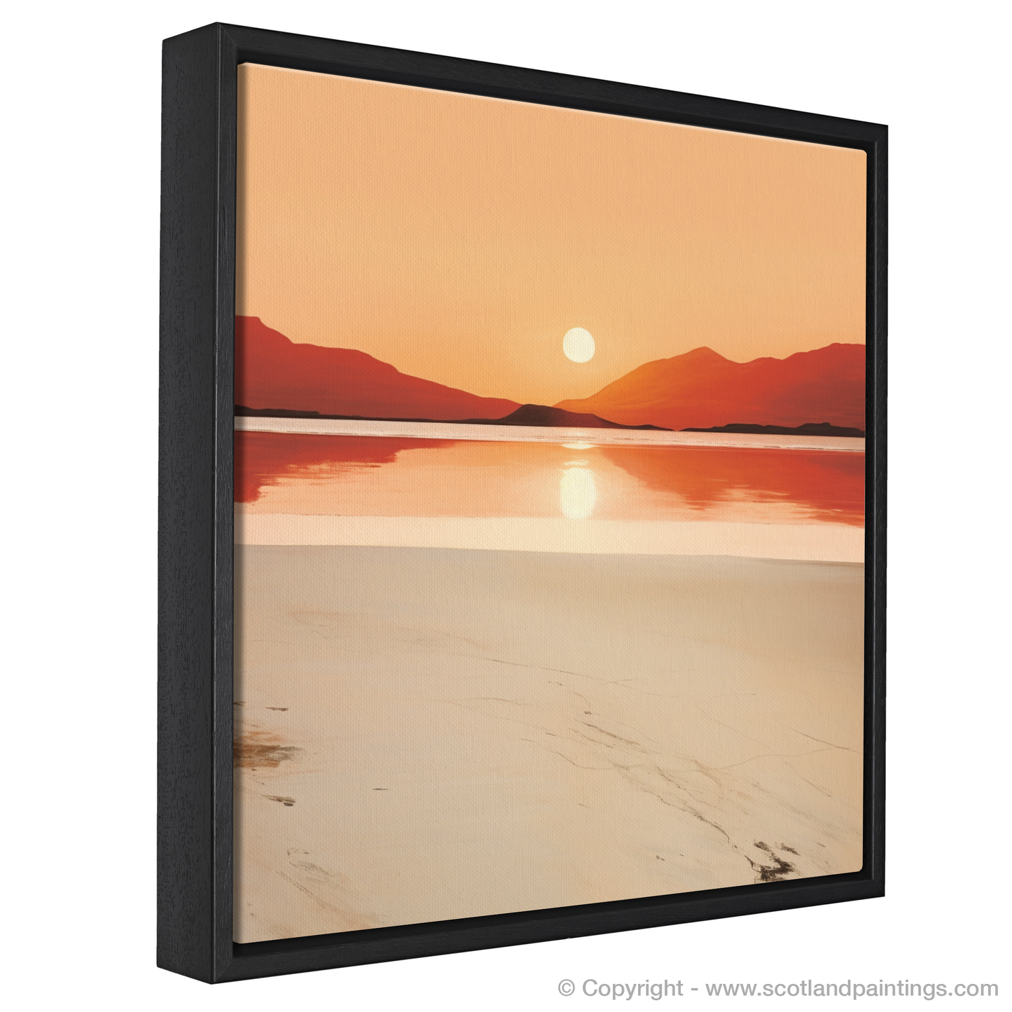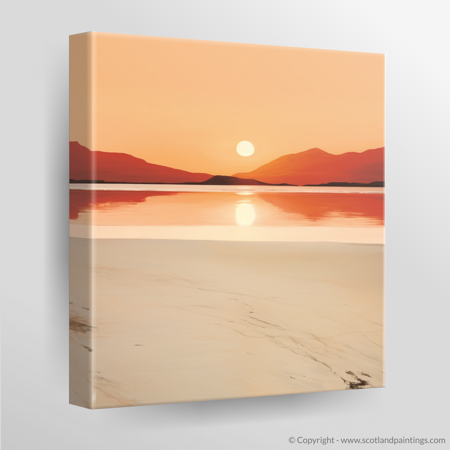 The print invites the viewer to experience the mirrored calm of the waters below, where the sun's orb casts its shimmering reflection across the still surface. The beach in the foreground is depicted with minimal detail, allowing the natural patterns of the sand to whisper tales of the gentle tide’s retreat.