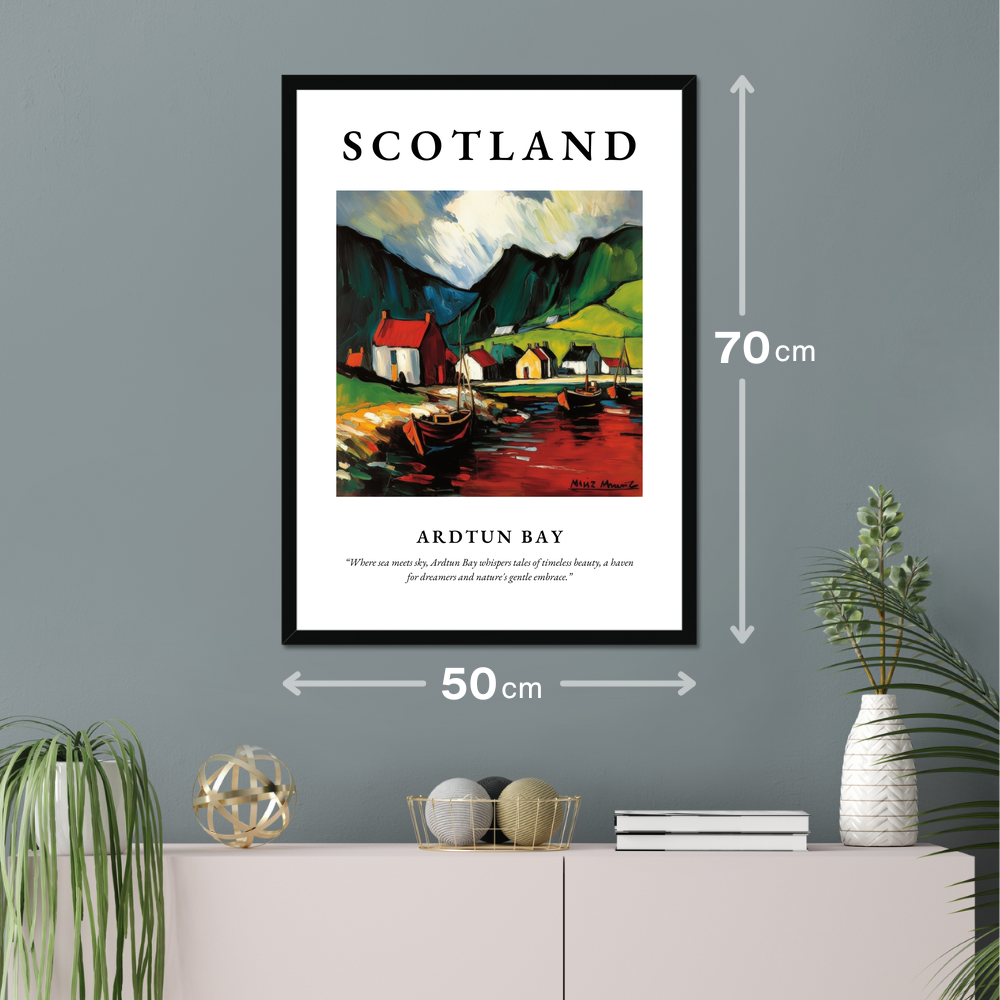 Dive into the enchanting allure of the Scottish coastline with our exquisite framed poster print, capturing the mesmerising beauty of Ardtun Bay. Measuring an impressive 50cm x 70cm, this poster commands attention, making it a perfect centrepiece for any room. Available in understated black, sleek white, or a charming natural wood-effect frame, its bold presence echoes the wild spirit of Scotland.