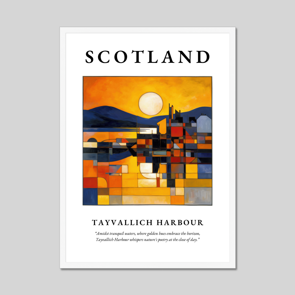 The poster draws your eye with the bold lettering of "SCOTLAND," heralding a journey into the abstract beauty of Tayvallich Harbour. The painting below captures the tranquil allure of this scenic Scottish harbour with bold colours and dynamic geometric shapes. Sunlit reflections dance upon the water, merging with the vibrant horizon in a harmonious abstraction that whispers nature's poetry just as the day closes.