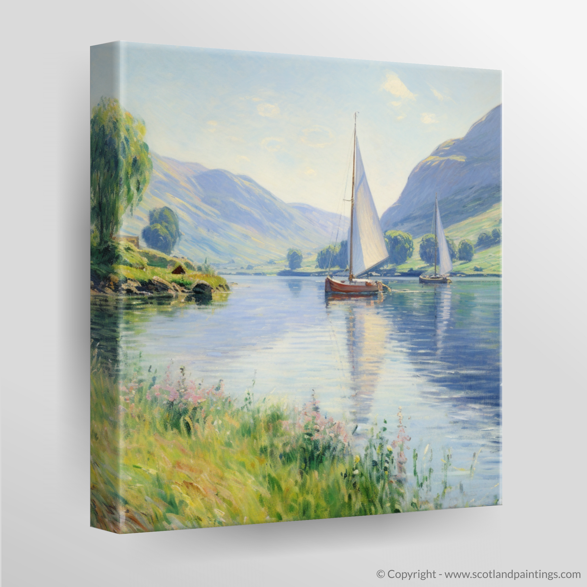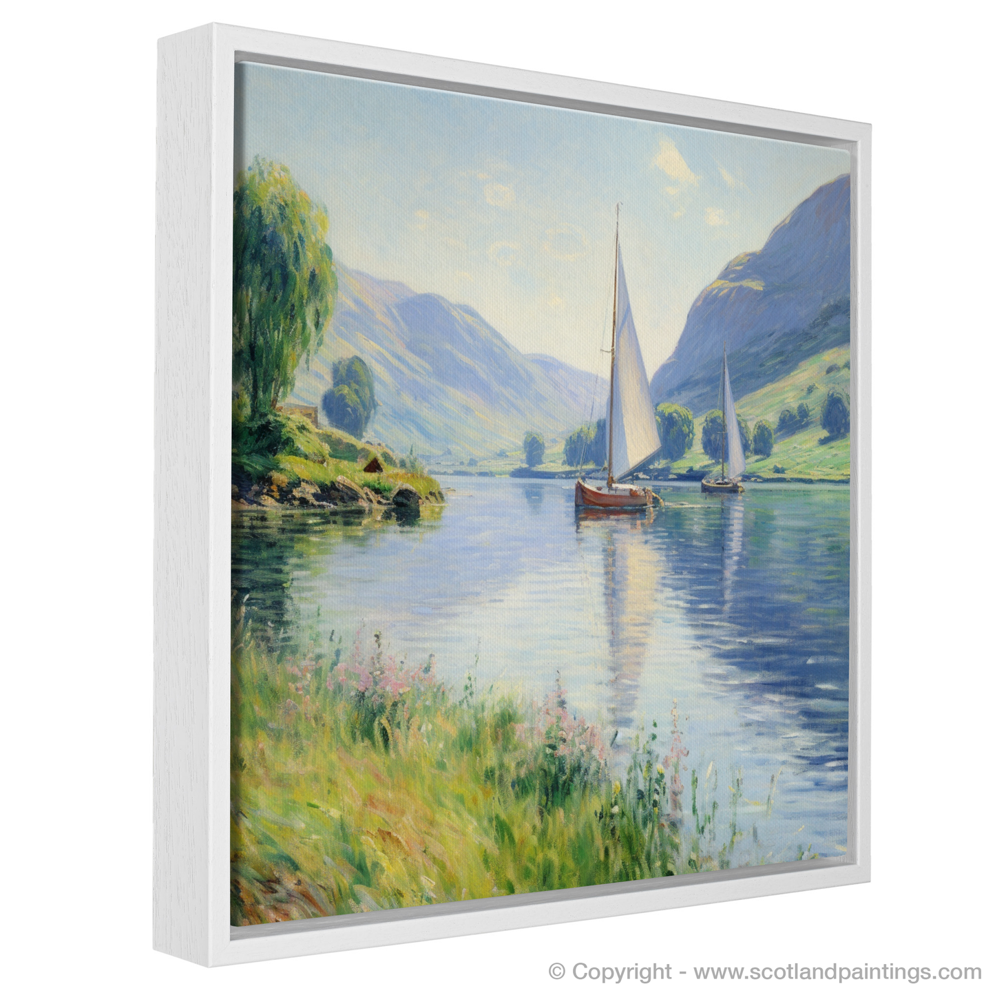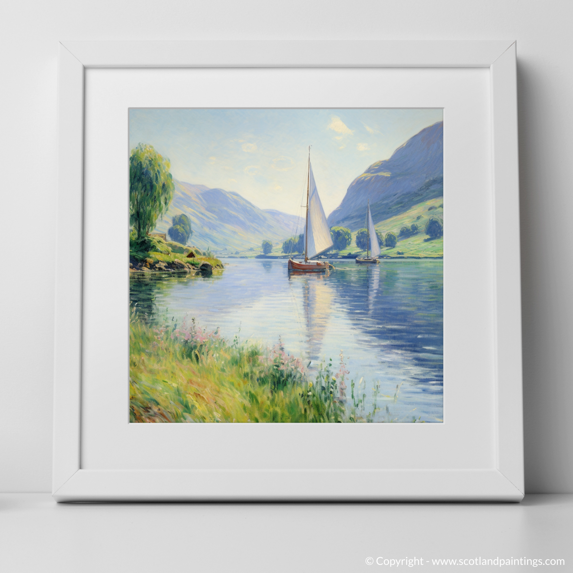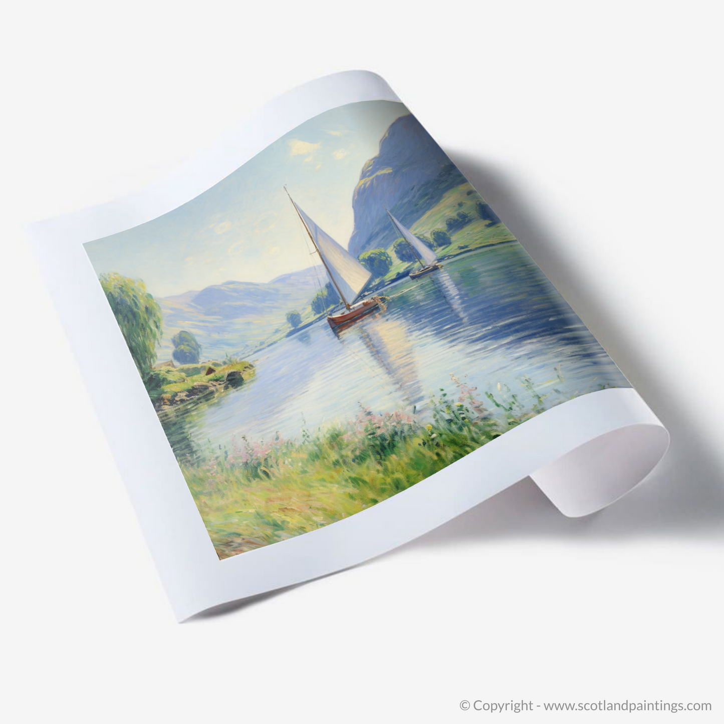 In this idyllic portrayal, two sailboats bask in the warmth of a sun-dappled afternoon, their sails full and proud against the clear sky. The surrounding hills, cloaked in varying shades of green and mauve, embrace the loch, adding a majestic backdrop to the tranquil waters.