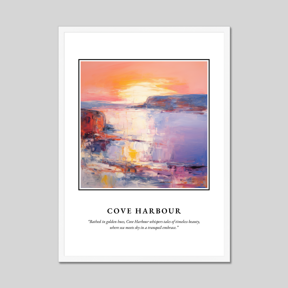 Cove Harbour, nestled on the rugged Scottish coast, tells stories of timeless beauty and maritime history. As the artwork suggests, it’s a place where natural elements come together, creating a mesmerising display of tranquillity and charm. The painted vista echoes the real-life allure of Cove Harbour, where every sunset casts a unique palette over the landscape, much like the vibrant colours in the poster.