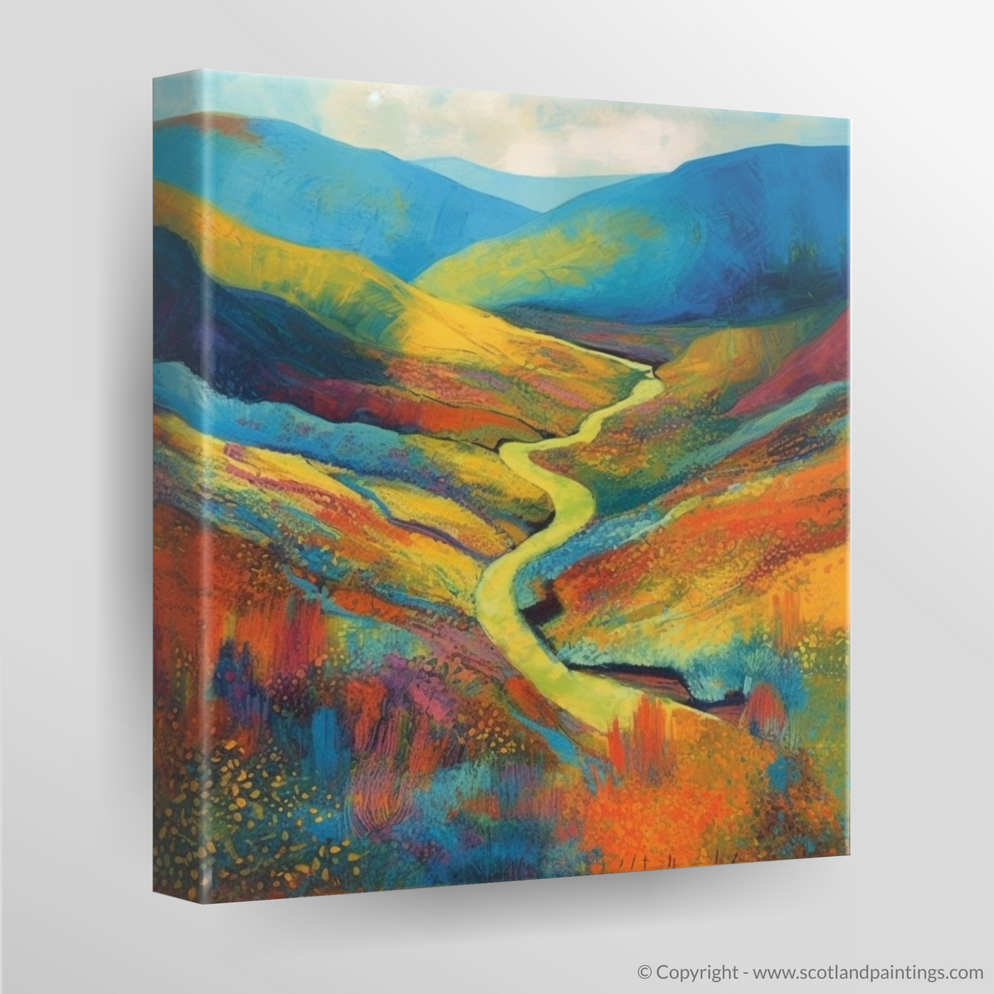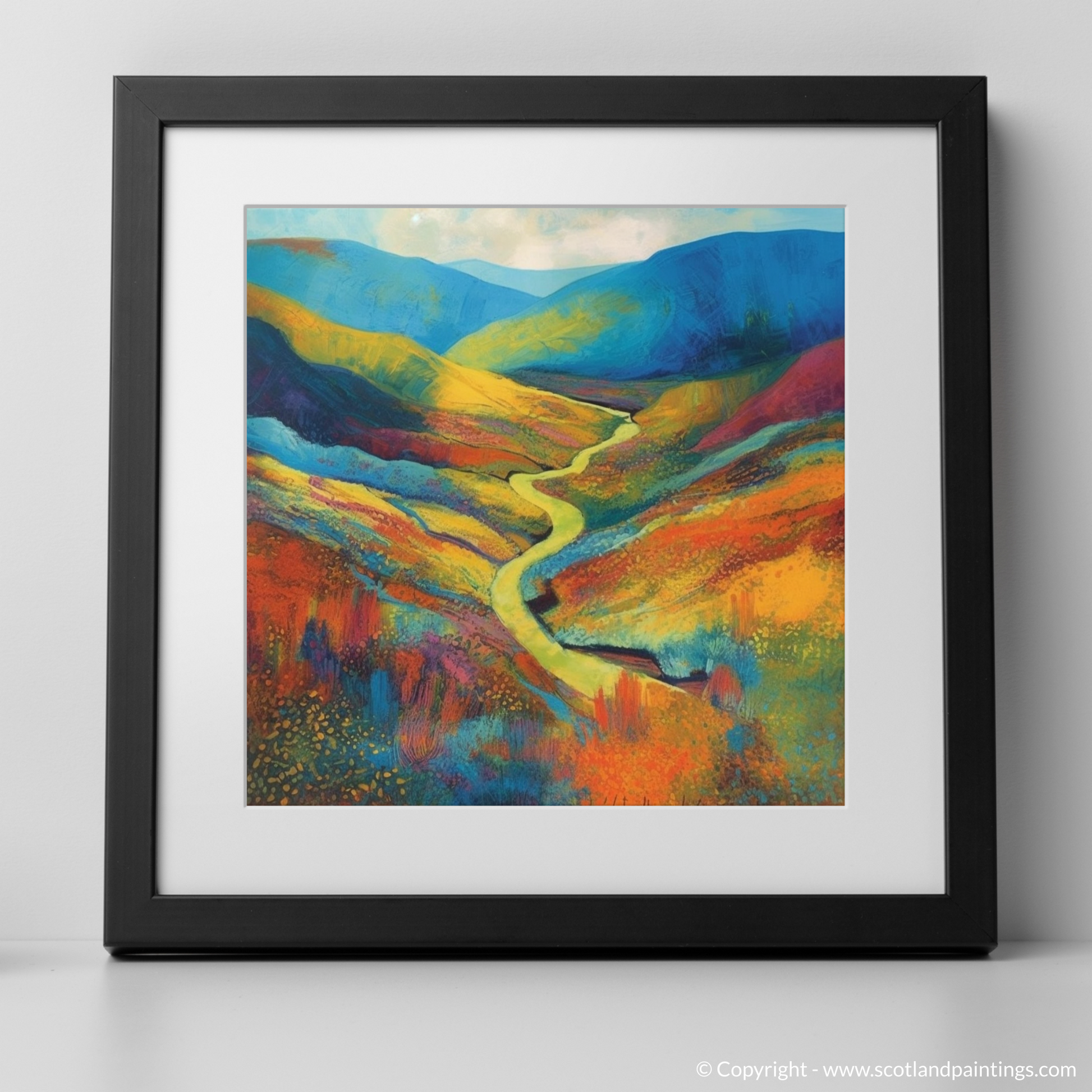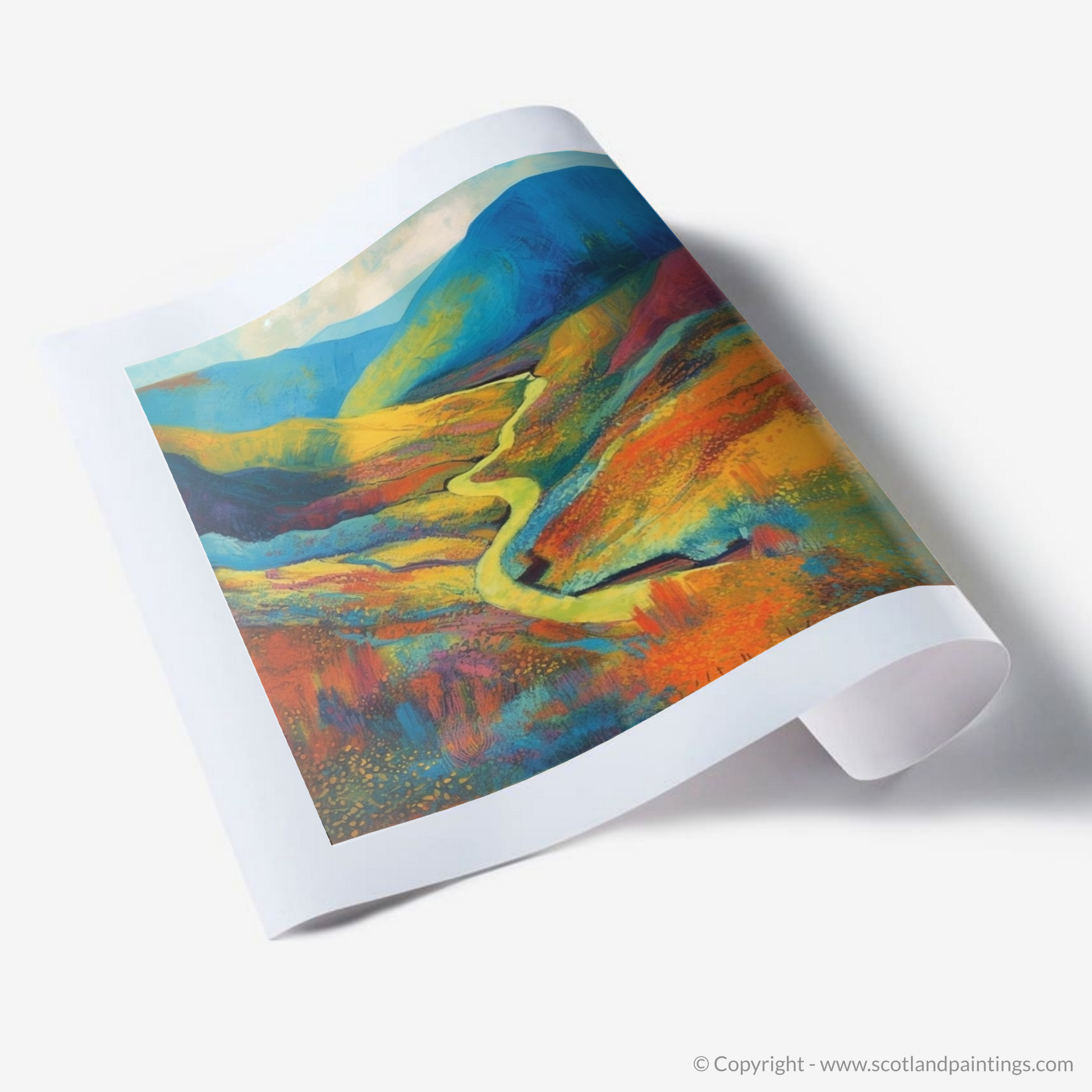 At the heart of the piece is a sinuous river, meandering gently through the fiery tones of the valley. It serves as a natural pathway, leading the viewer's eye towards the undulating hills awash with hues of cobalt and azure—a silent nod to the Scottish skies.