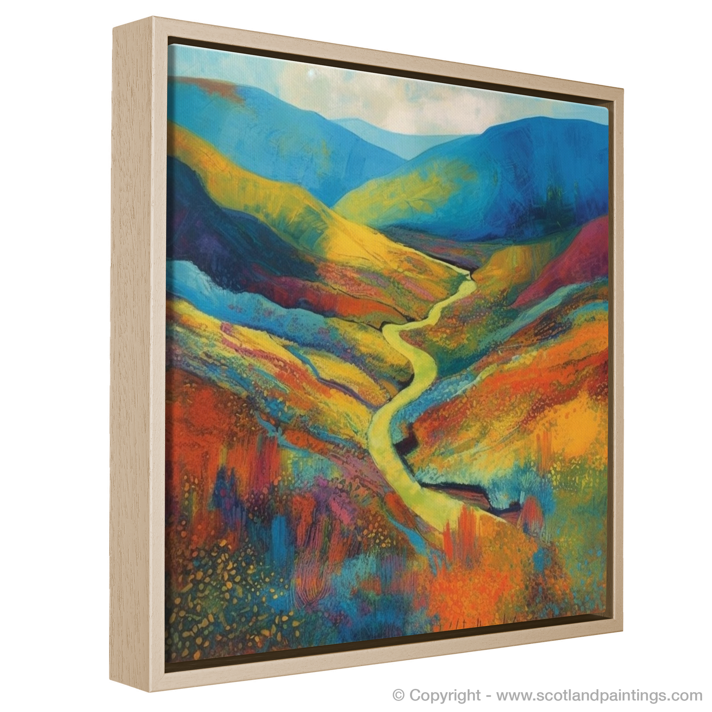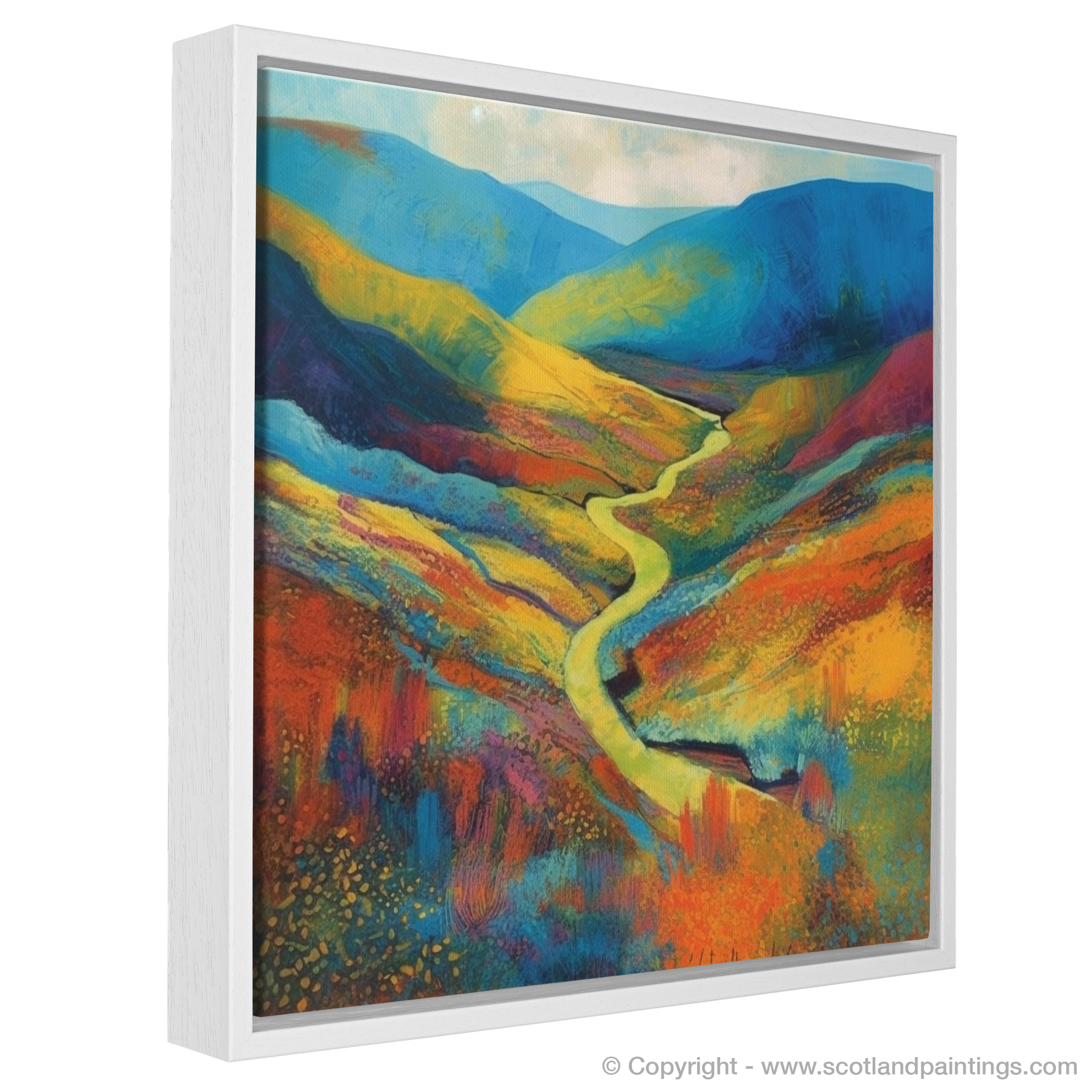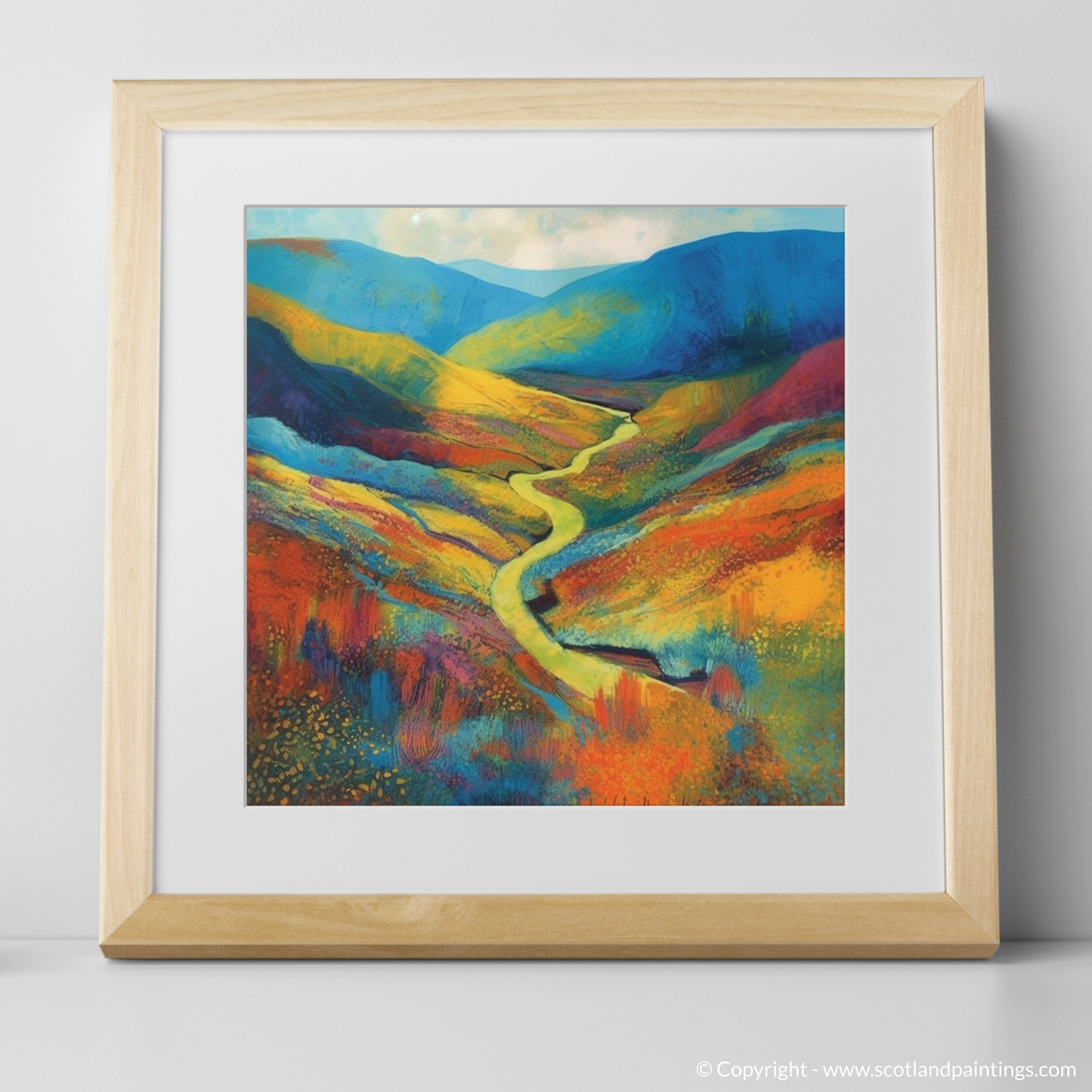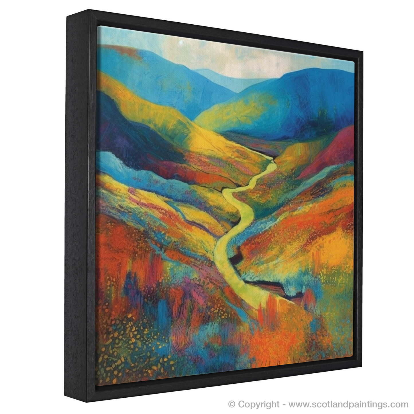 At the heart of the piece is a sinuous river, meandering gently through the fiery tones of the valley. It serves as a natural pathway, leading the viewer's eye towards the undulating hills awash with hues of cobalt and azure—a silent nod to the Scottish skies.