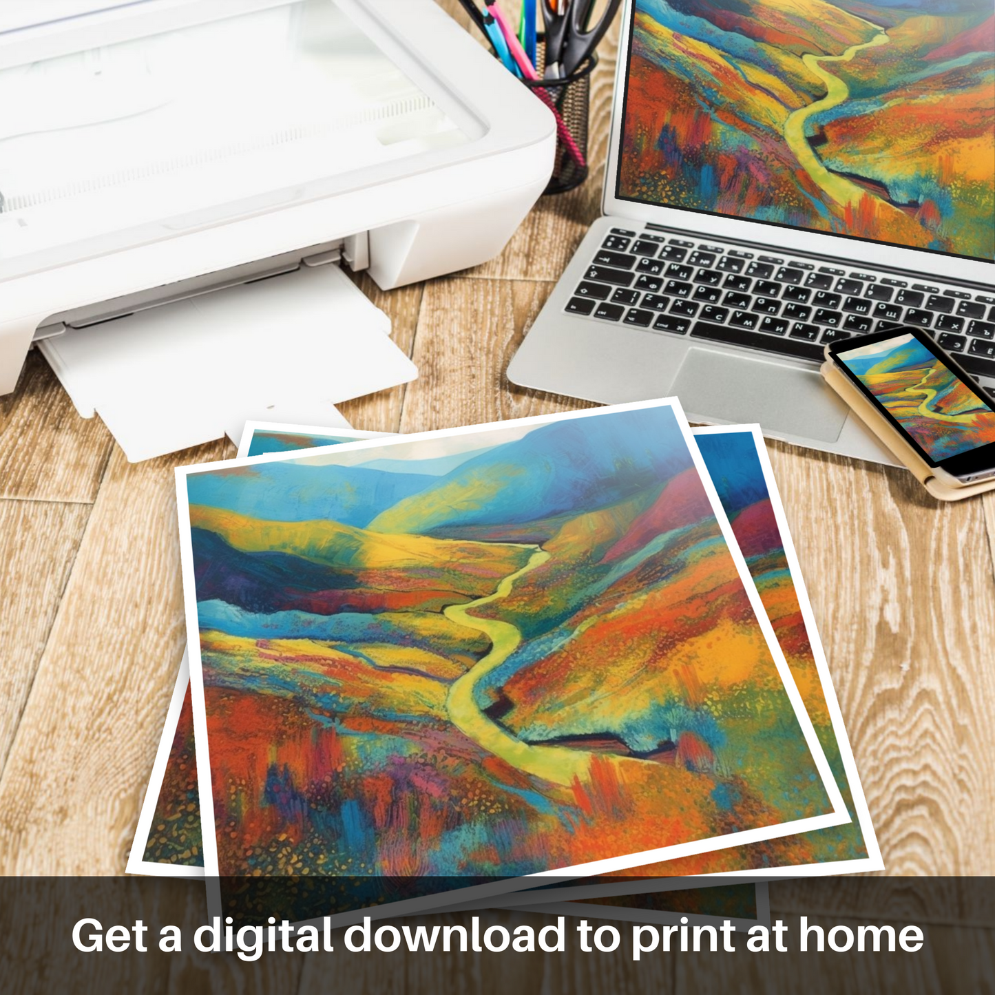 Immerse yourself in the vibrant embrace of nature with this exquisite print inspired by the raw beauty of Glen Nant National Nature Reserve. Bathed in a kaleidoscope of colours, the artwork invites you into an abstracted landscape where the boundaries between sky, water, and land blend harmoniously.