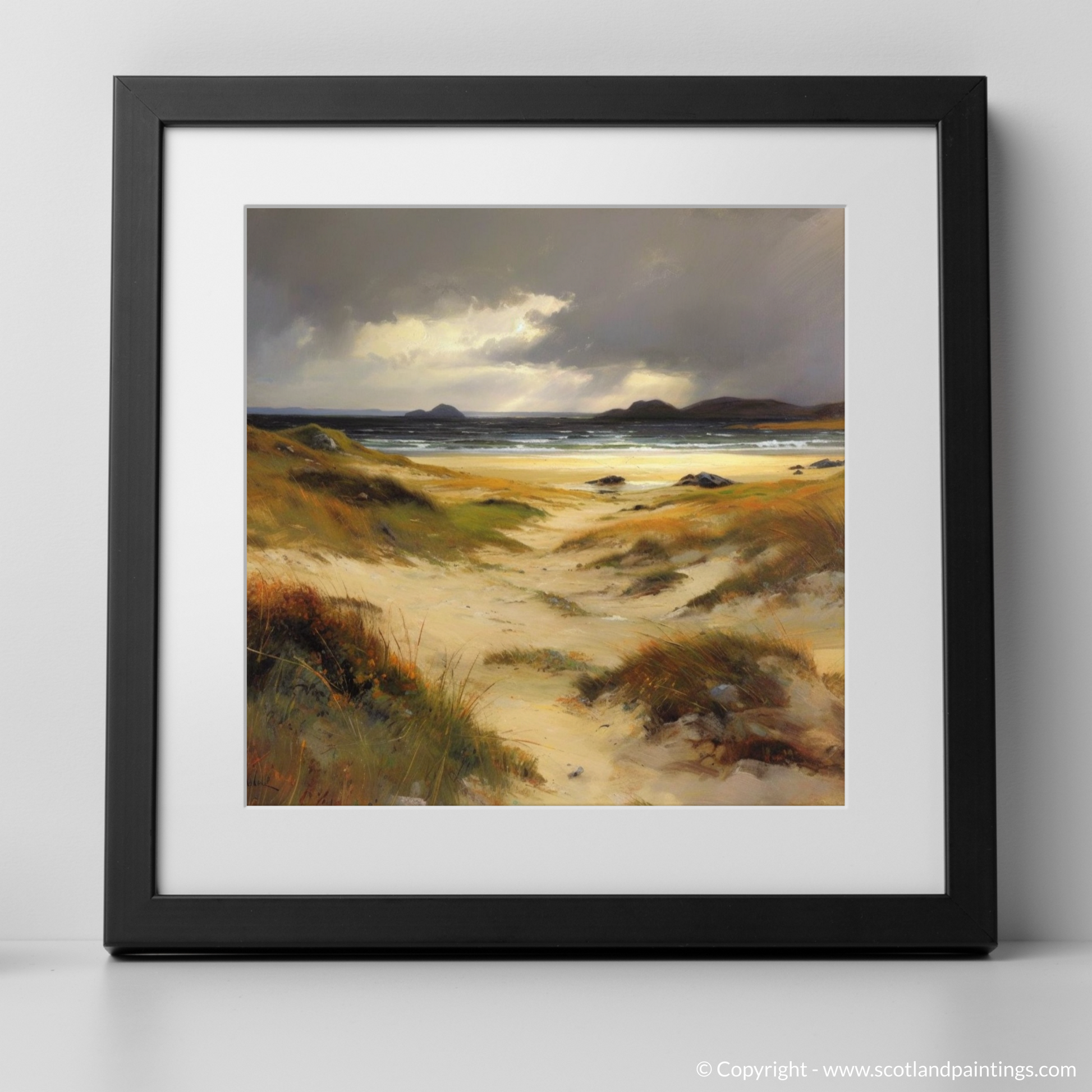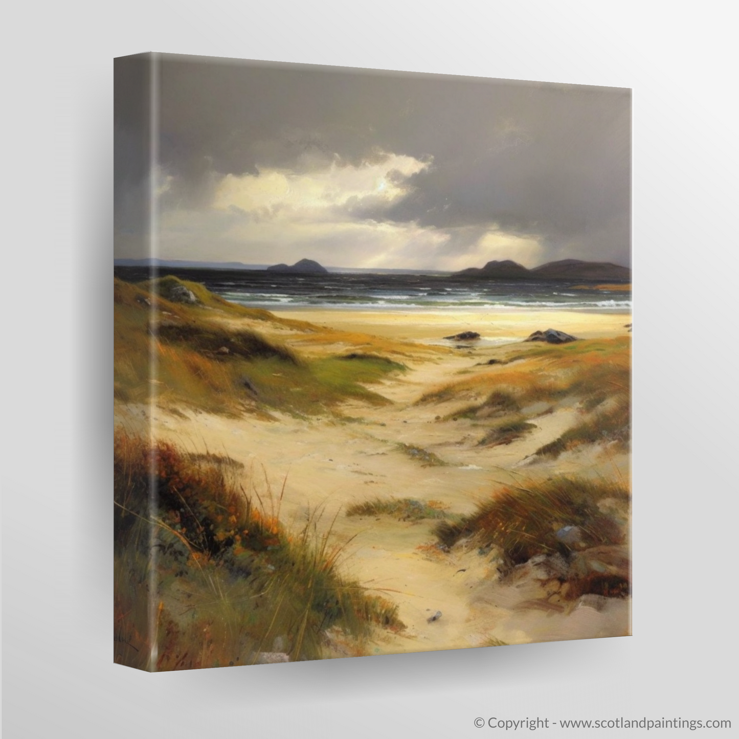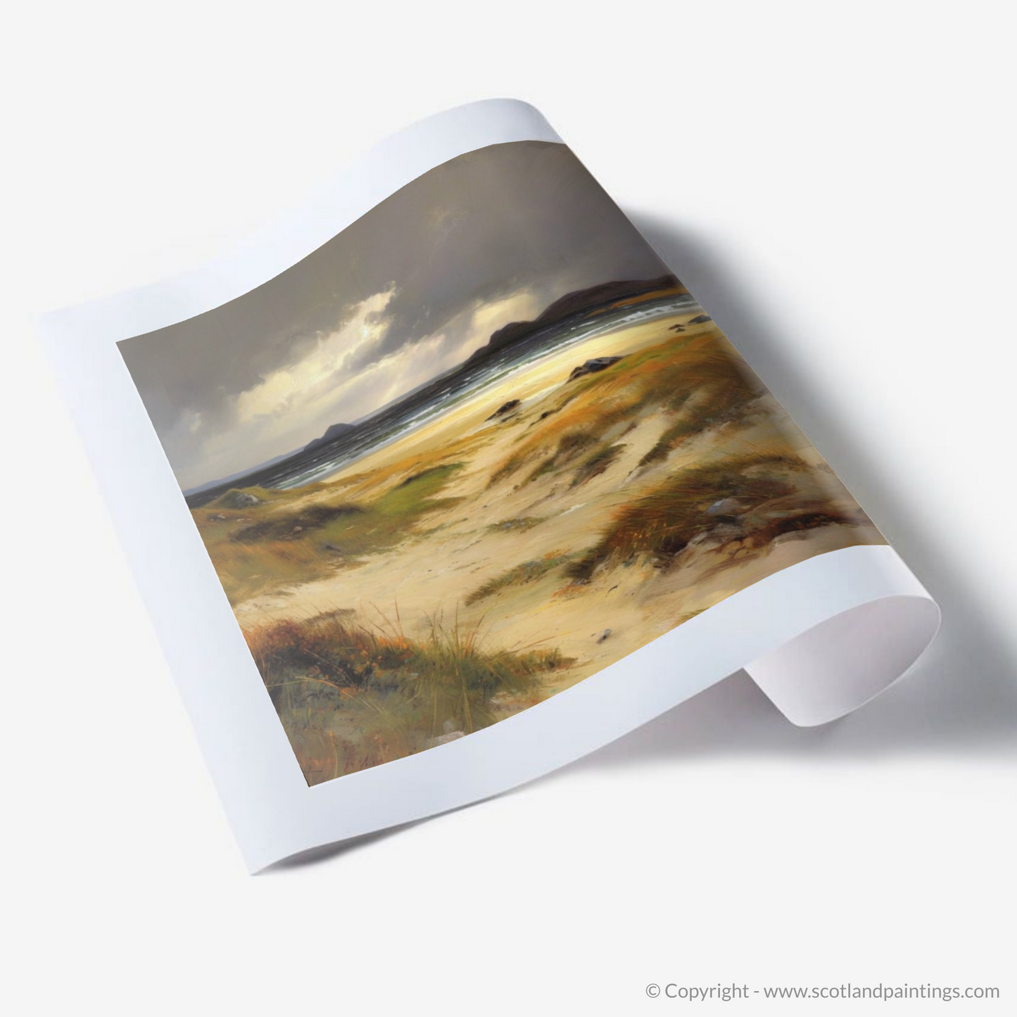 The earthly hues of the golden sands merge with the moody greys and blues of the ocean, suggesting the fleeting moments before a storm. The painting invites contemplation, with the windswept dunes leading the viewer's eye towards the distant, rugged hills silhouetted against the heavy sky. The sun peeks through the cloud cover in a dramatic display of light and shadow, bathing the scene in a contrast that highlights the extraordinary beauty of Scotland's natural landscape.