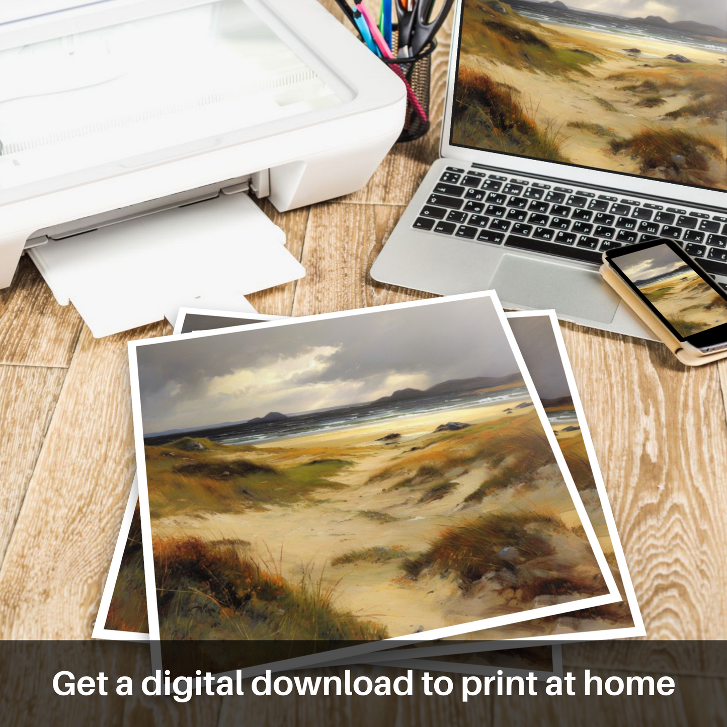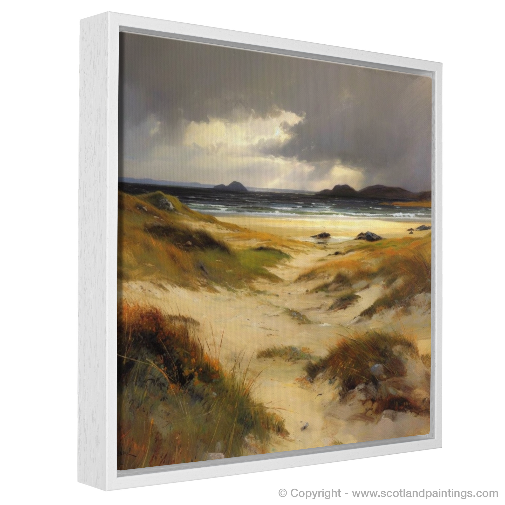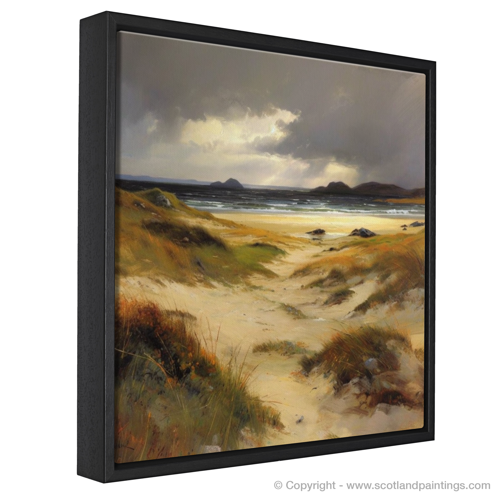 The earthly hues of the golden sands merge with the moody greys and blues of the ocean, suggesting the fleeting moments before a storm. The painting invites contemplation, with the windswept dunes leading the viewer's eye towards the distant, rugged hills silhouetted against the heavy sky. The sun peeks through the cloud cover in a dramatic display of light and shadow, bathing the scene in a contrast that highlights the extraordinary beauty of Scotland's natural landscape.