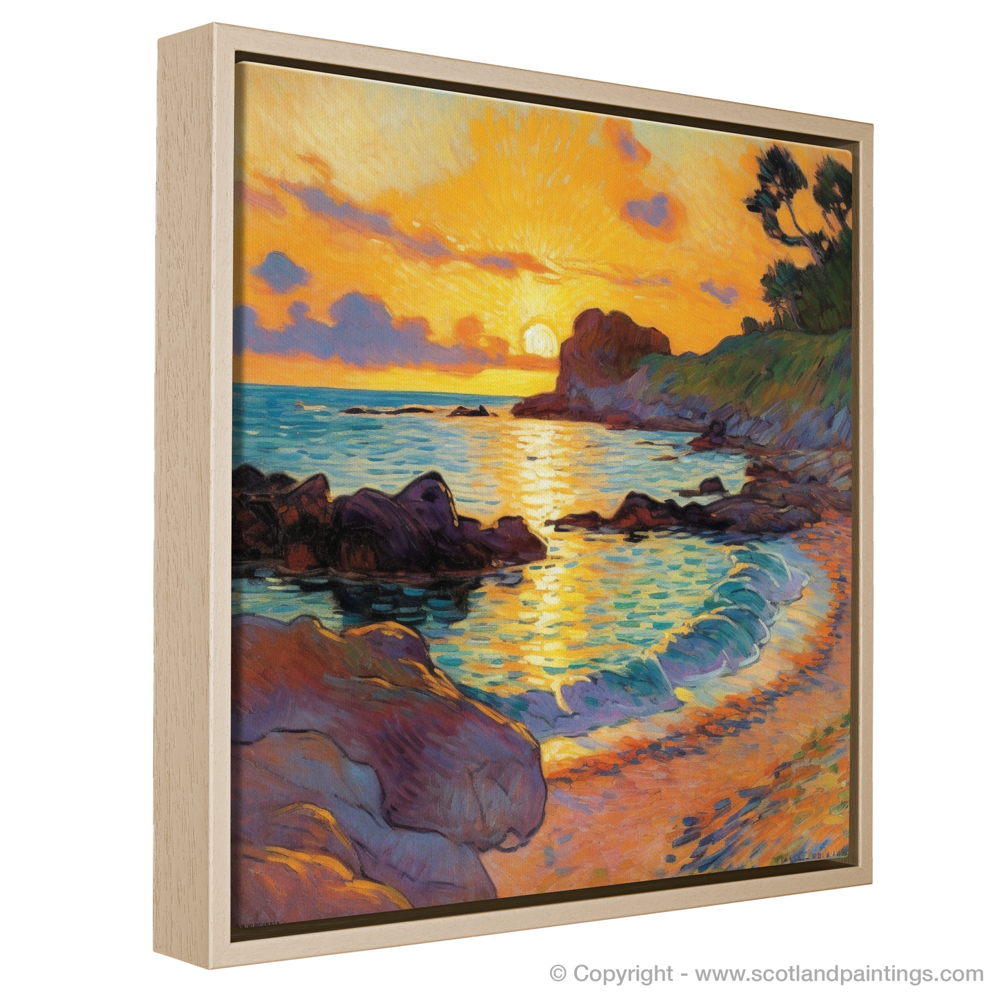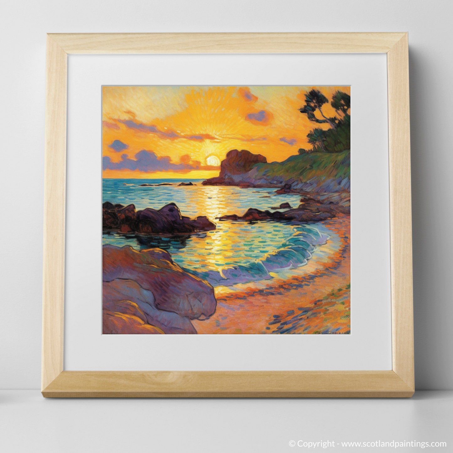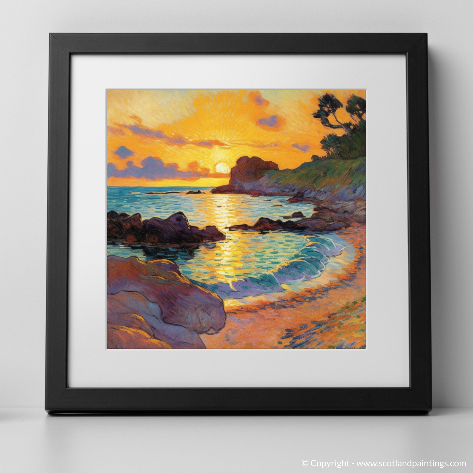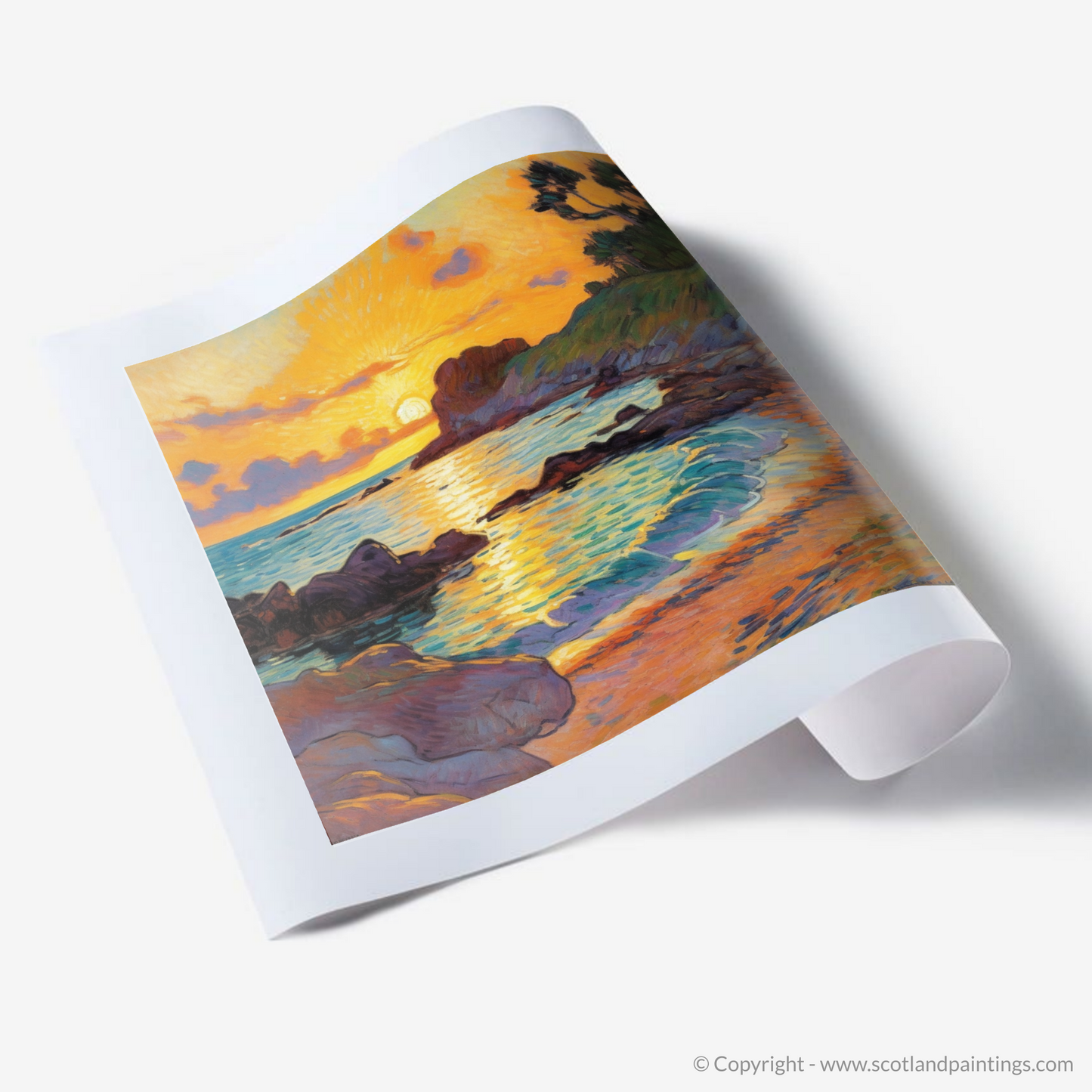 Bathed in the warm, radiant glow of the setting sun, this evocative print captures the serene beauty of Catterline Bay at the magical golden hour. Featuring a palette that dances with the vibrant hues of sunset, the artwork is a masterful rendition of the Scottish cove's tranquil waters and rugged coastline.