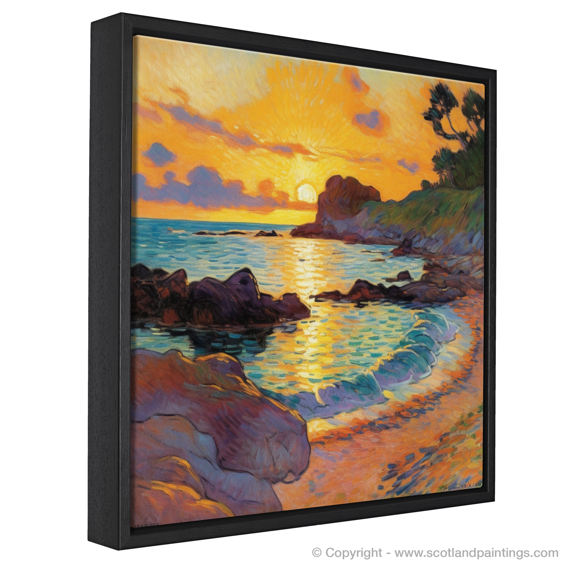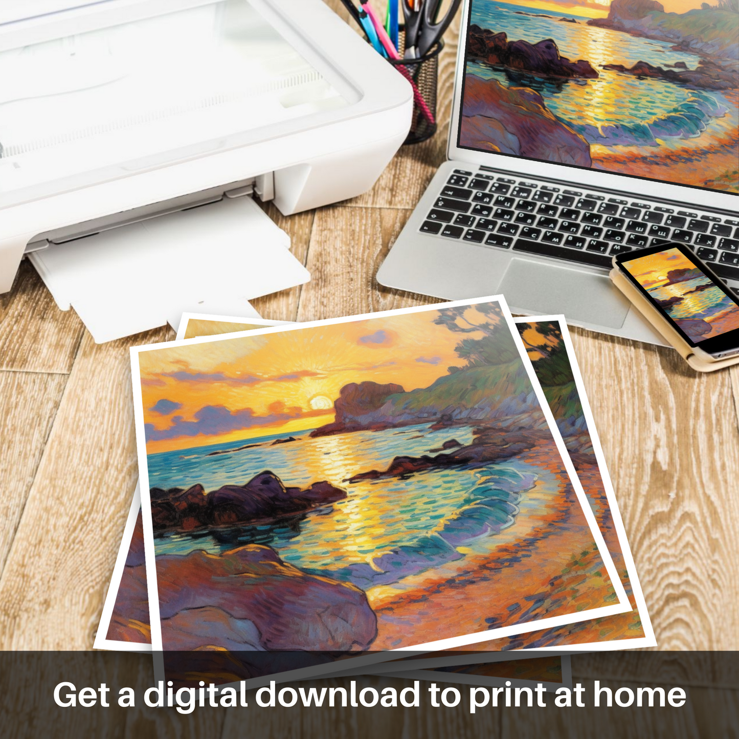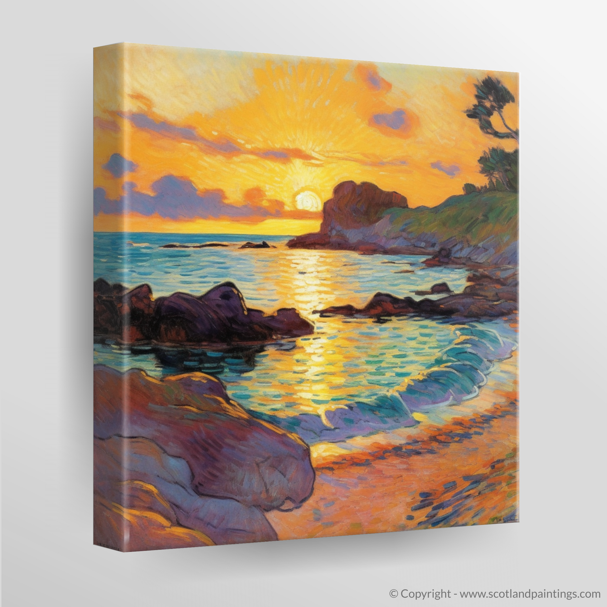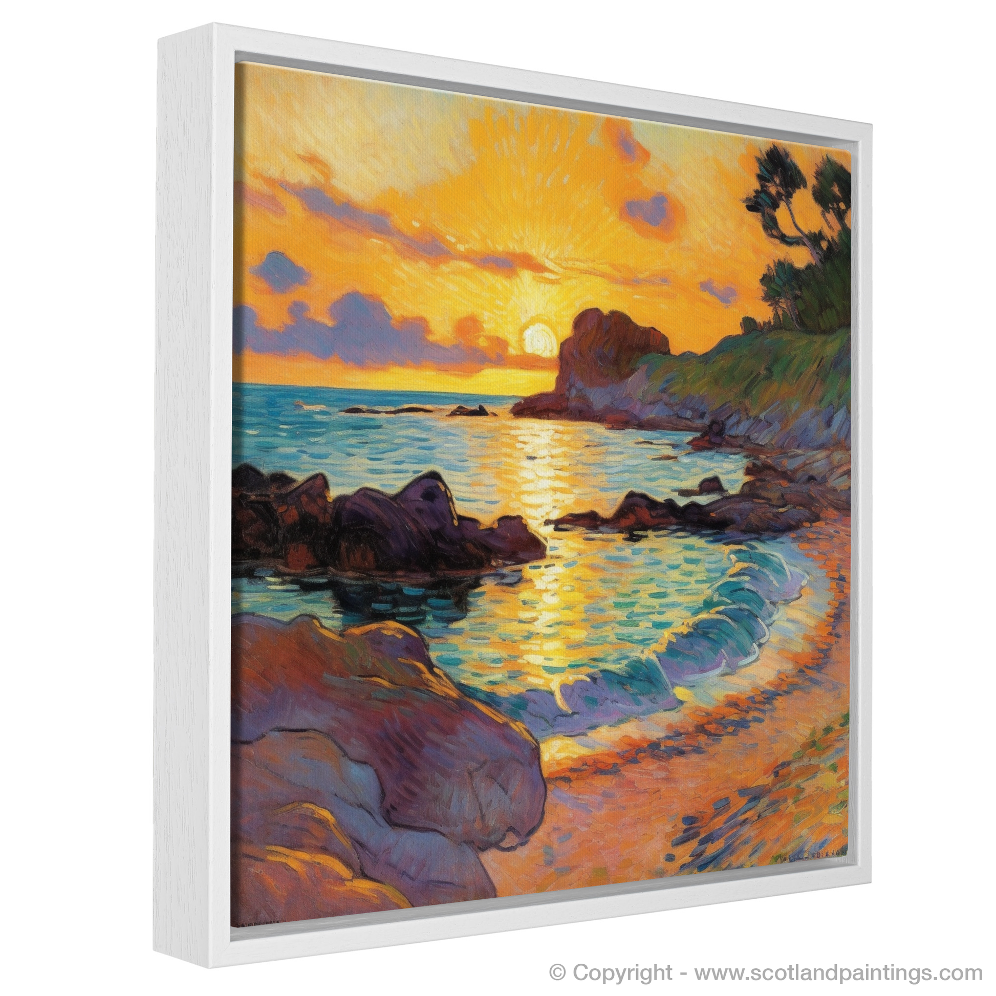 Bathed in the warm, radiant glow of the setting sun, this evocative print captures the serene beauty of Catterline Bay at the magical golden hour. Featuring a palette that dances with the vibrant hues of sunset, the artwork is a masterful rendition of the Scottish cove's tranquil waters and rugged coastline.