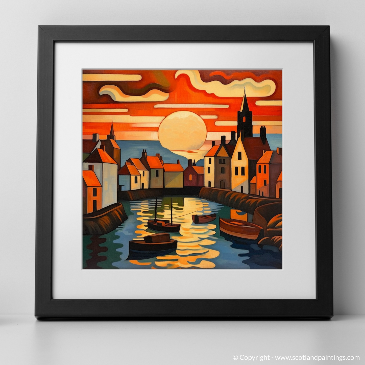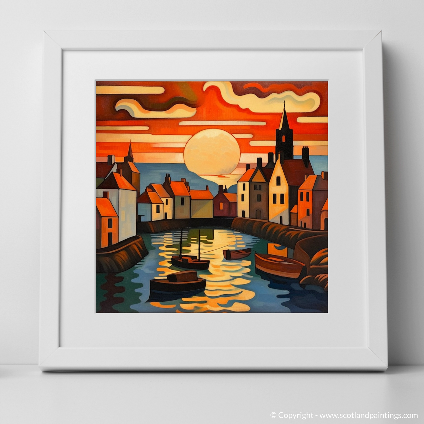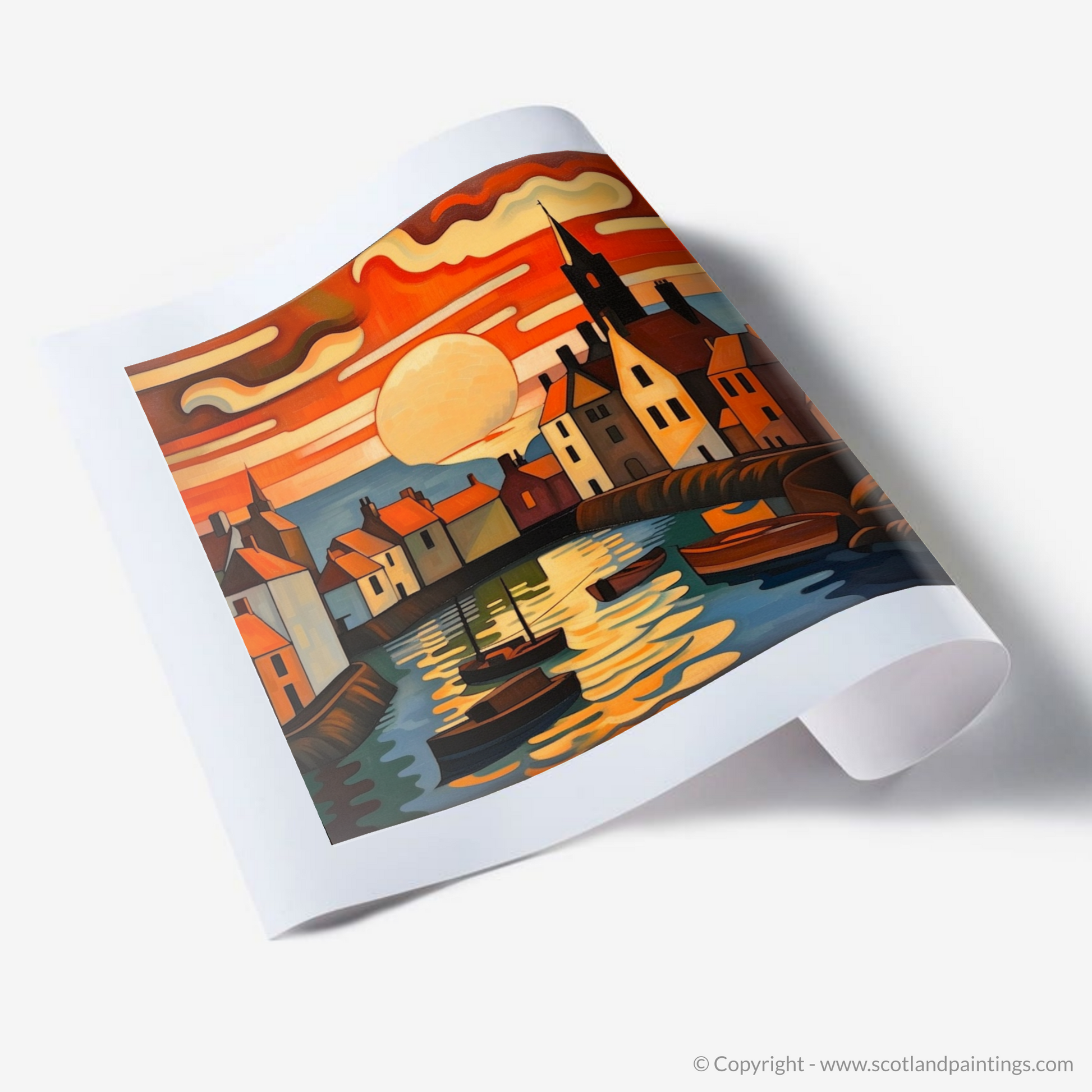 Bask in the tranquil glow of a setting sun over St Monans Harbour, as depicted in this exquisite Art Nouveau-inspired print. This piece elegantly captures the serene atmosphere of a Scottish evening, where the golden light dances on the water's surface and casts a warming hue on the quaint, gabled houses lining the harbour.