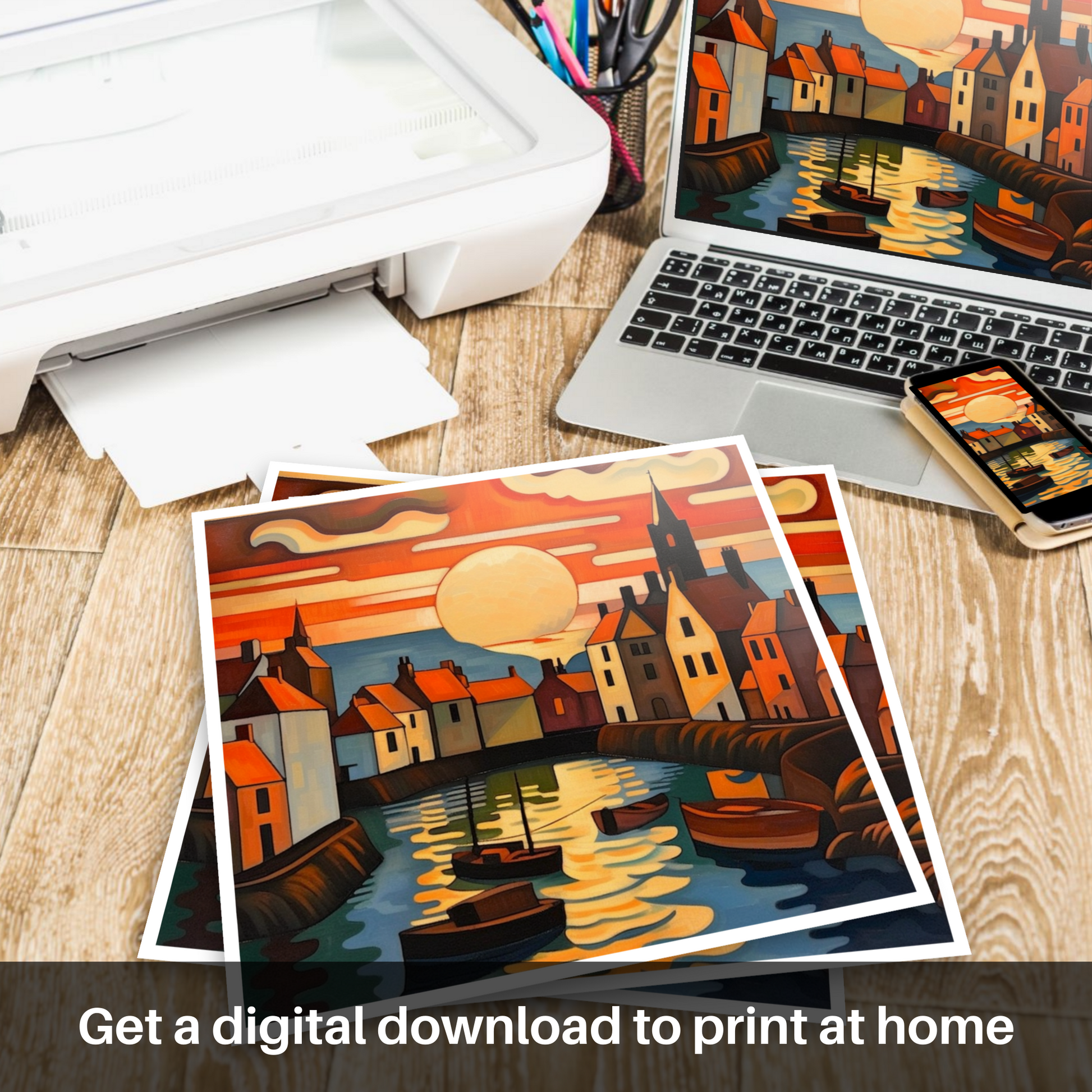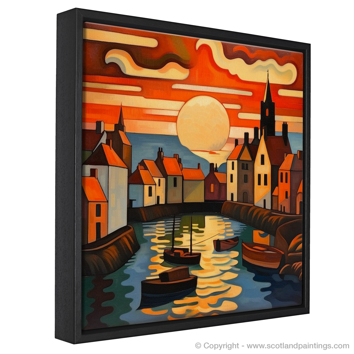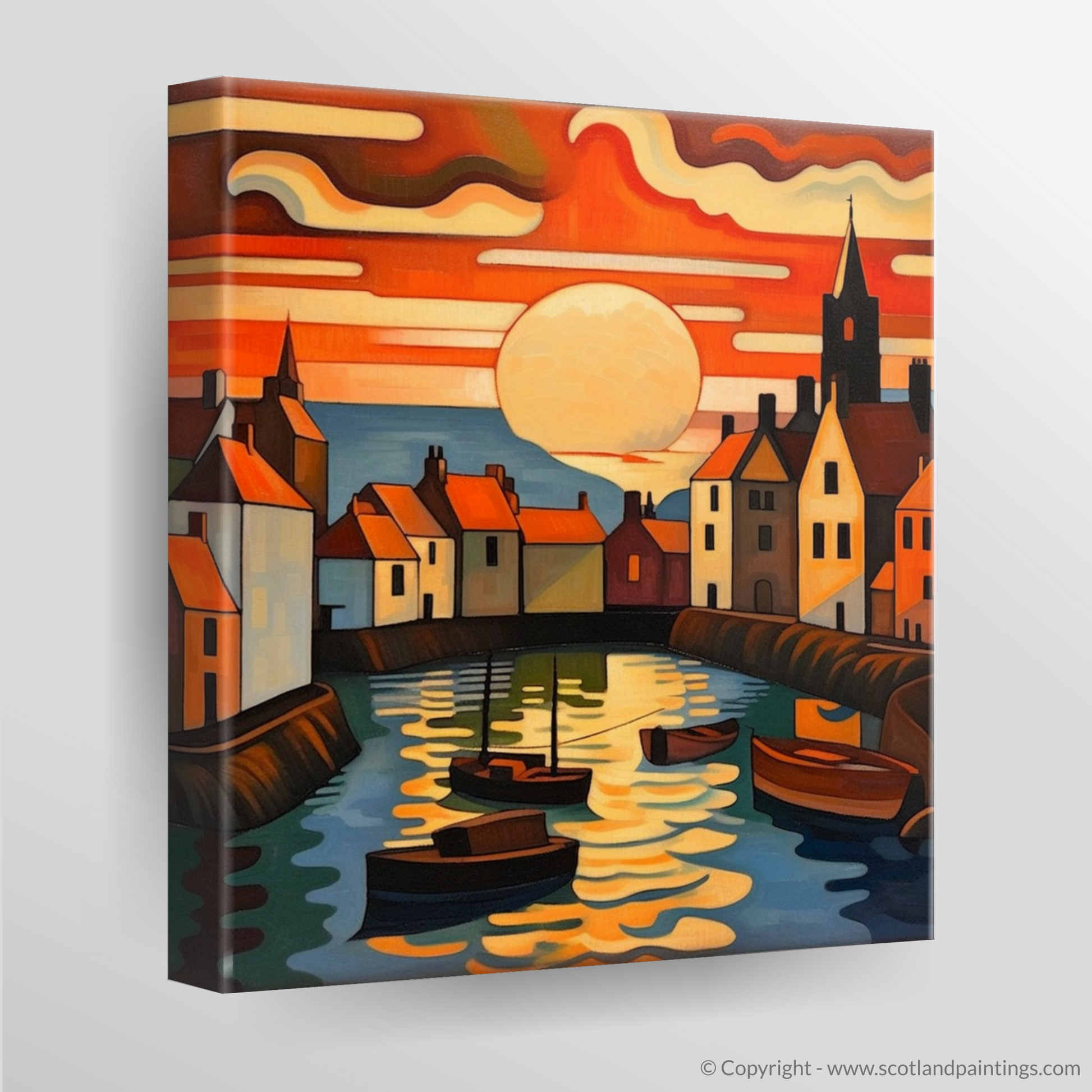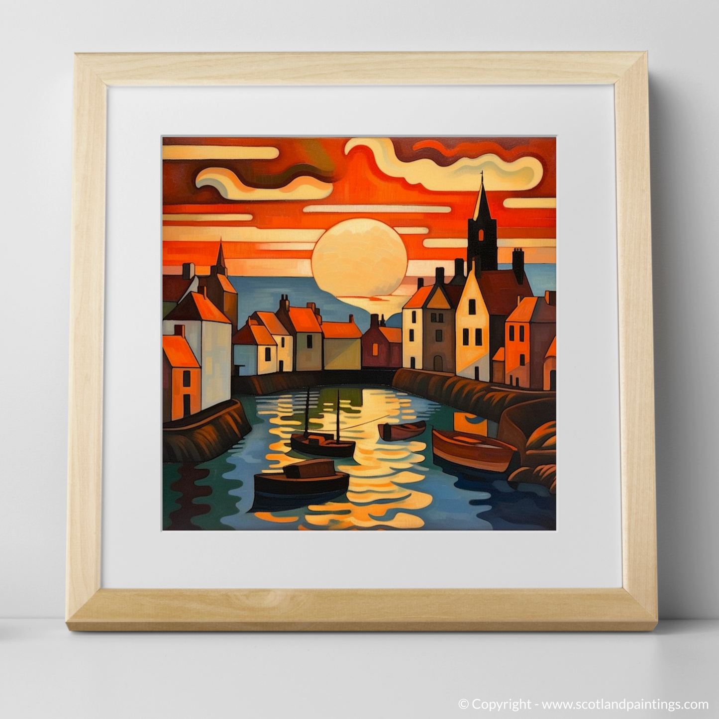 Bask in the tranquil glow of a setting sun over St Monans Harbour, as depicted in this exquisite Art Nouveau-inspired print. This piece elegantly captures the serene atmosphere of a Scottish evening, where the golden light dances on the water's surface and casts a warming hue on the quaint, gabled houses lining the harbour.