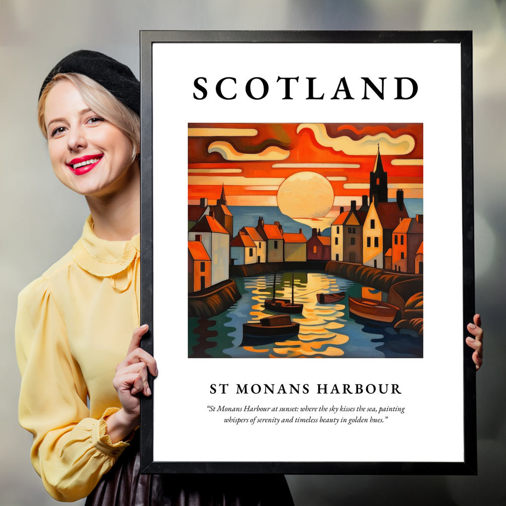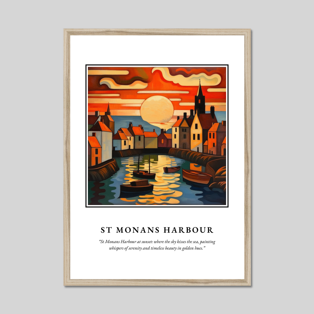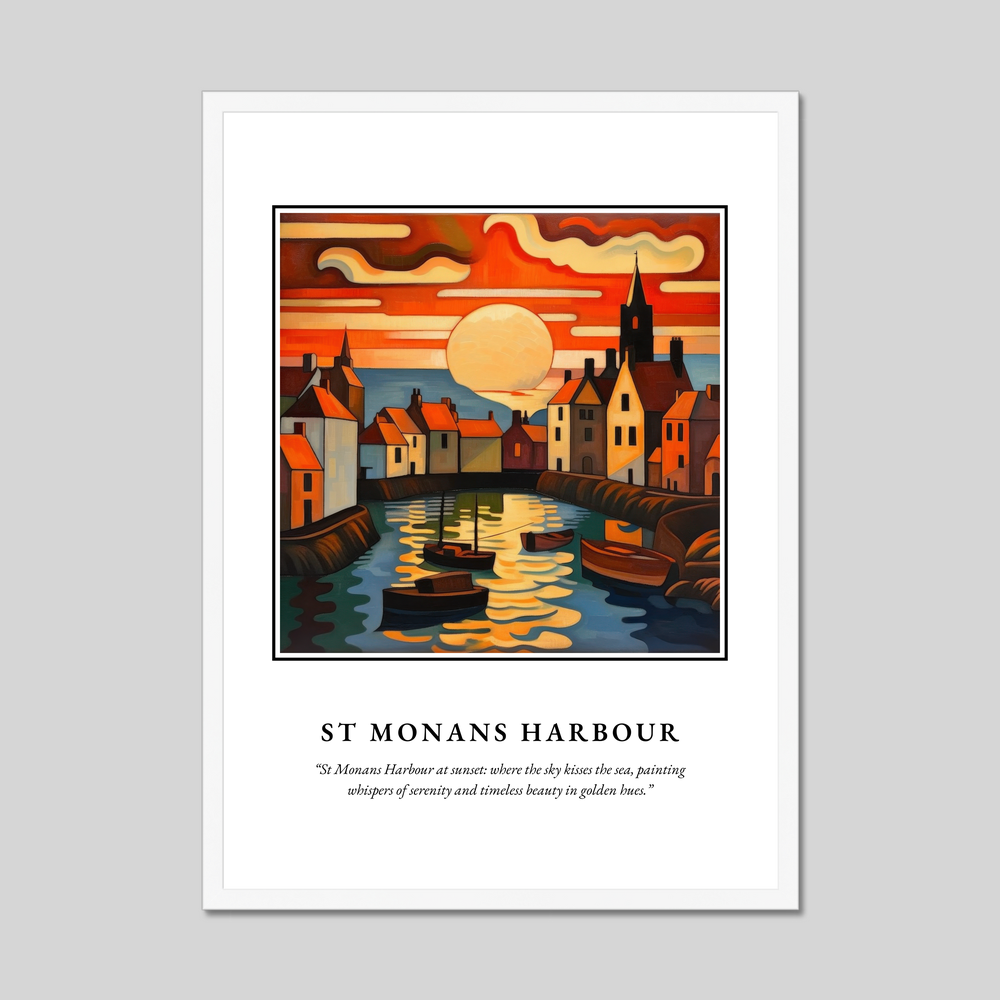 The painting of St Monans Harbour brims with life as the sunset bathes the quaint harbour in golden light. The unique Art Nouveau style brings elegance and fluidity to the architecture and boats, with the sky and sea blending seamlessly in a dance of crimson and azure. Below this visual symphony, a heartfelt quote whispers from the frame: “St Monans Harbour at sunset: where the sky kisses the sea, painting whispers of serenity and timeless beauty in golden hues.”