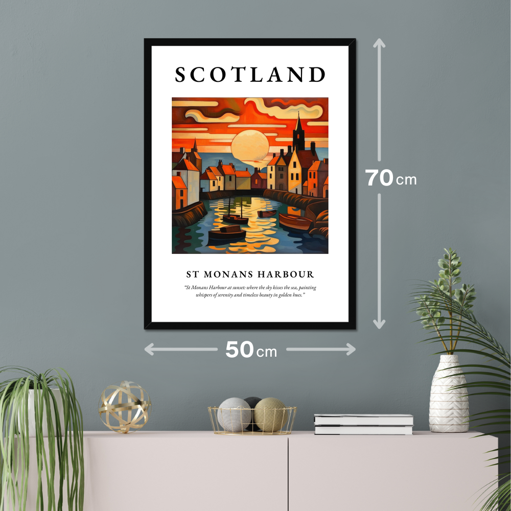 Immerse yourself in the tranquil beauty of Scotland with our exquisite framed poster print, a captivating piece from our “Scottish Harbours” collection. This 50cm x 70cm poster beautifully captures the enchantment of St Monans Harbour, presenting an Art Nouveau style painting that mesmerises with its flowing lines and vivid hues. At the top, the bold lettering of “SCOTLAND” proudly announces its heritage, setting the stage for the breathtaking scene below.