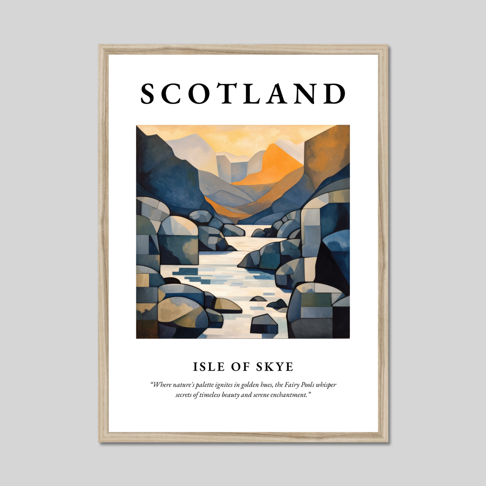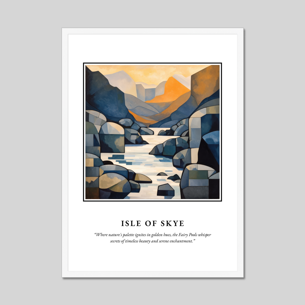 The poster's bold headline, “SCOTLAND,” captures the eye, proudly setting the stage for a mesmerising cubist painting of the Isle of Skye. The distinctive style breaks from tradition with its geometric forms and dynamic interplay of colours, depicting Skye in a series of rich blue and orange hues. Each shape and line comes together to form an abstract interpretation of the enchanting Fairy Pools, inviting you to explore its artistic depths. Below the painting, a poetic quote whispers, “Where nature's palette ignites in golden hues, the Fairy Pools whisper secrets of timeless beauty and serene enchantment.”