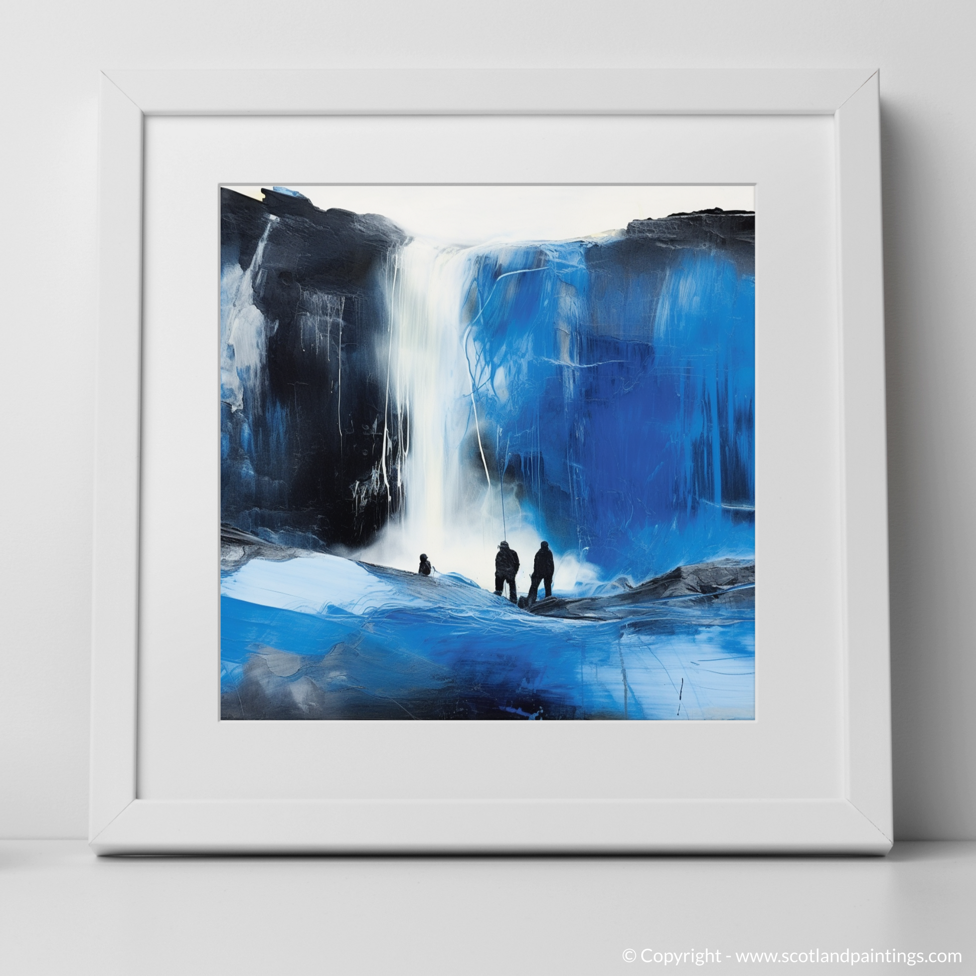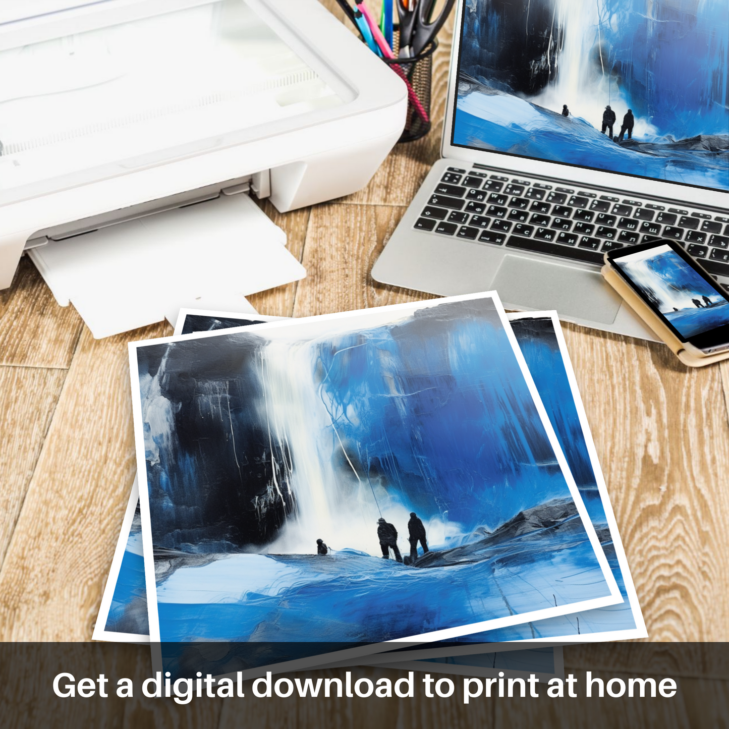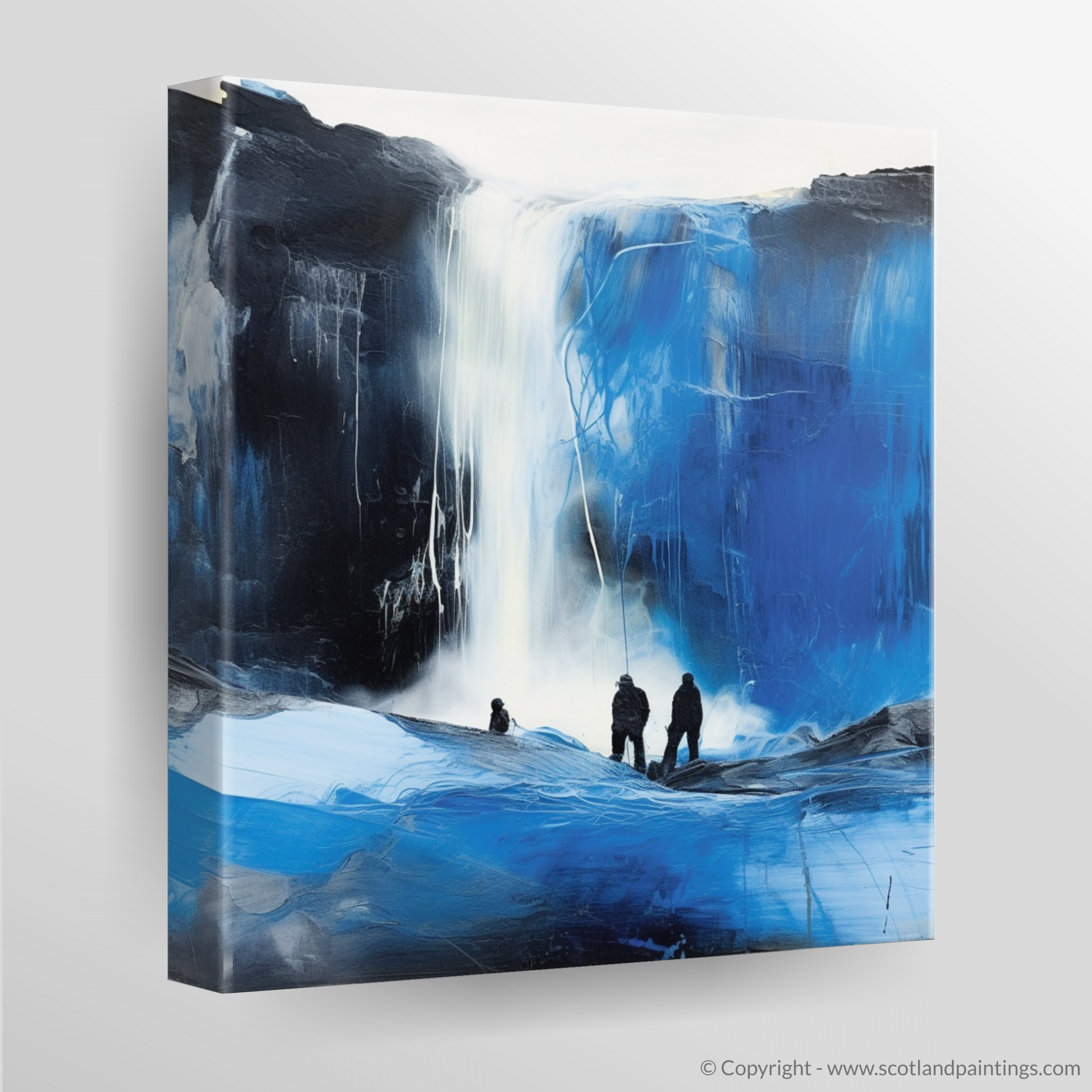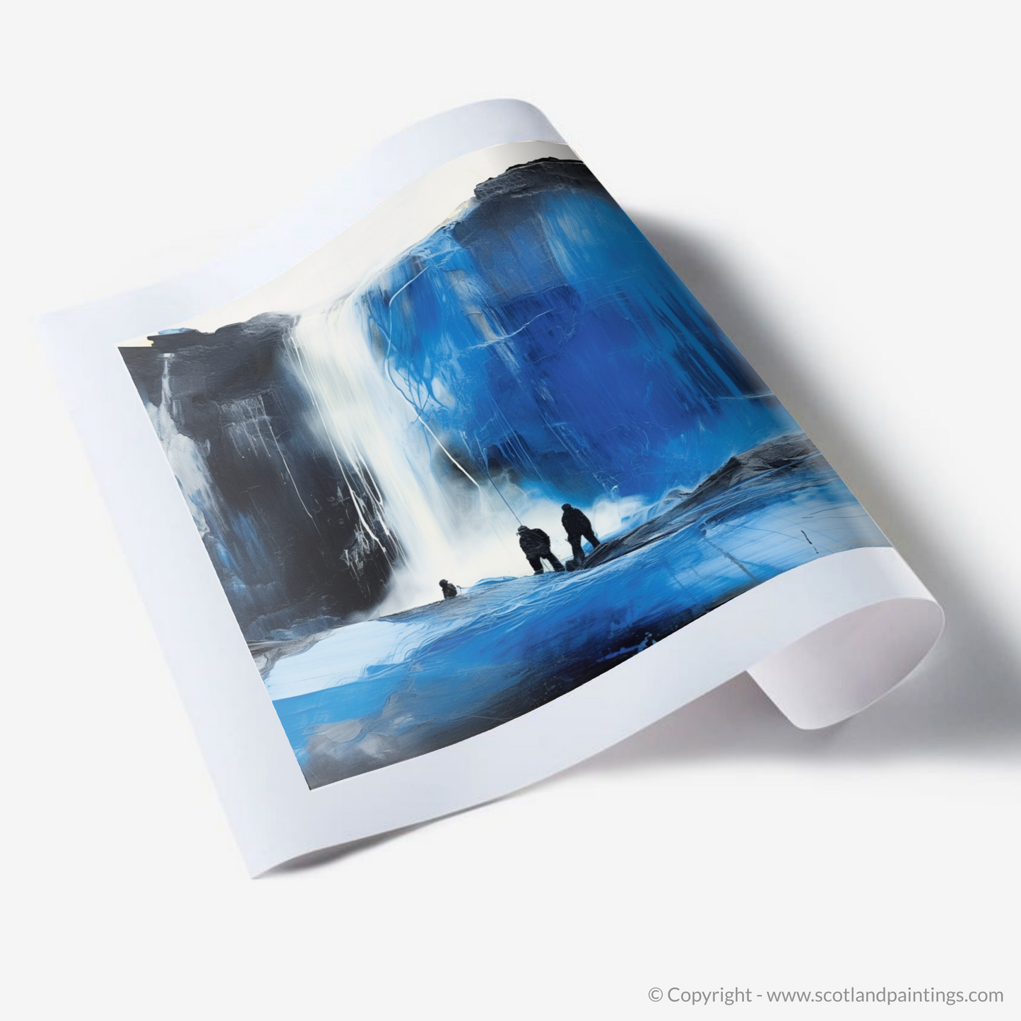 At the heart of this enigmatic piece, the contrast between the vigorous strokes of blue and the stark, eloquent white of the waterfall evokes the unique spirit of the Highlands, blurring the lines between the ephemeral and the eternal. The silhouette of hikers adds a human element, juxtaposed as small yet poignant figures amidst the vastness—a testament to the grandeur of nature and the allure of its wild, untamed beauty.