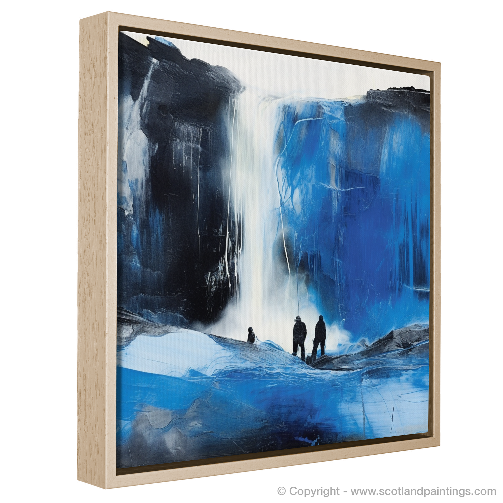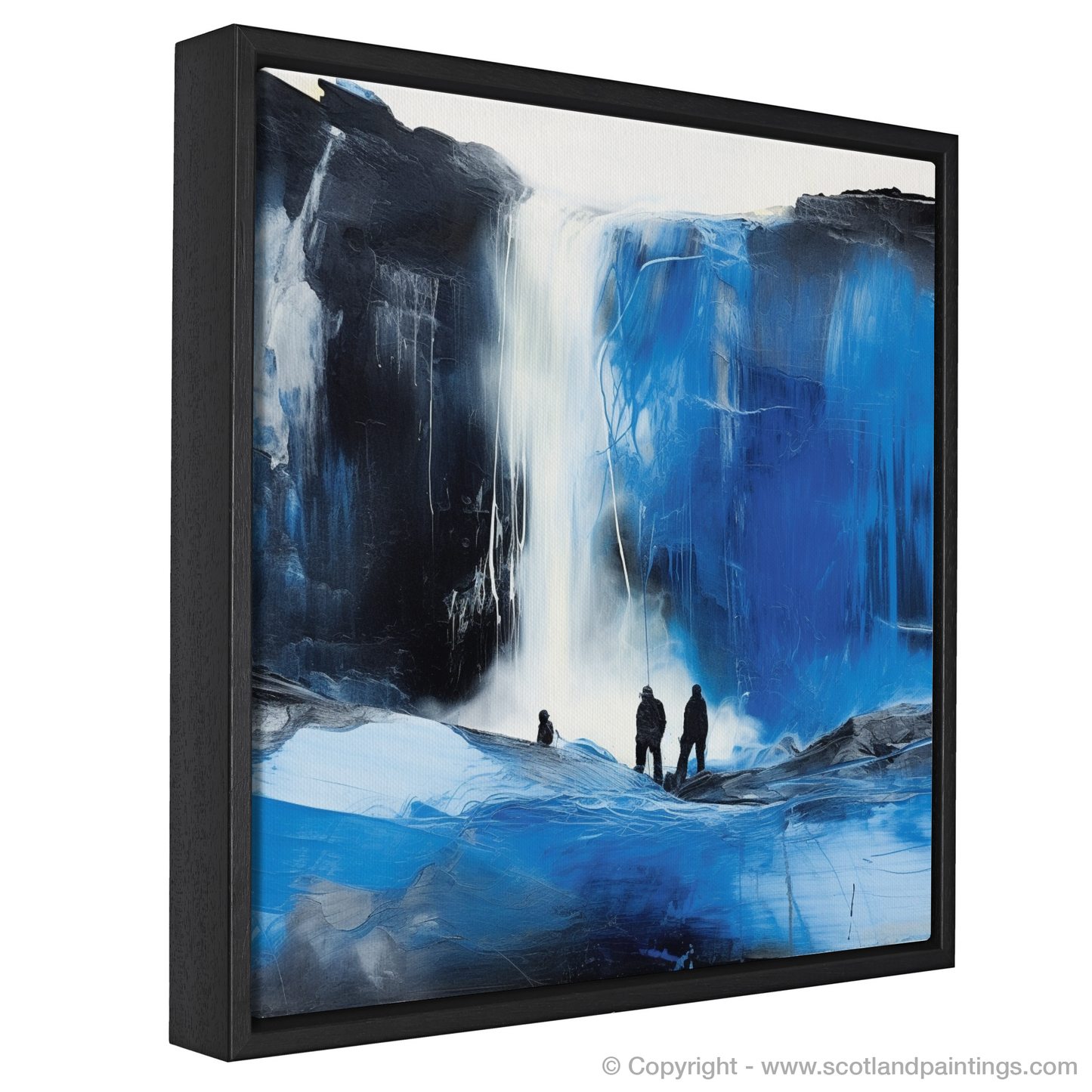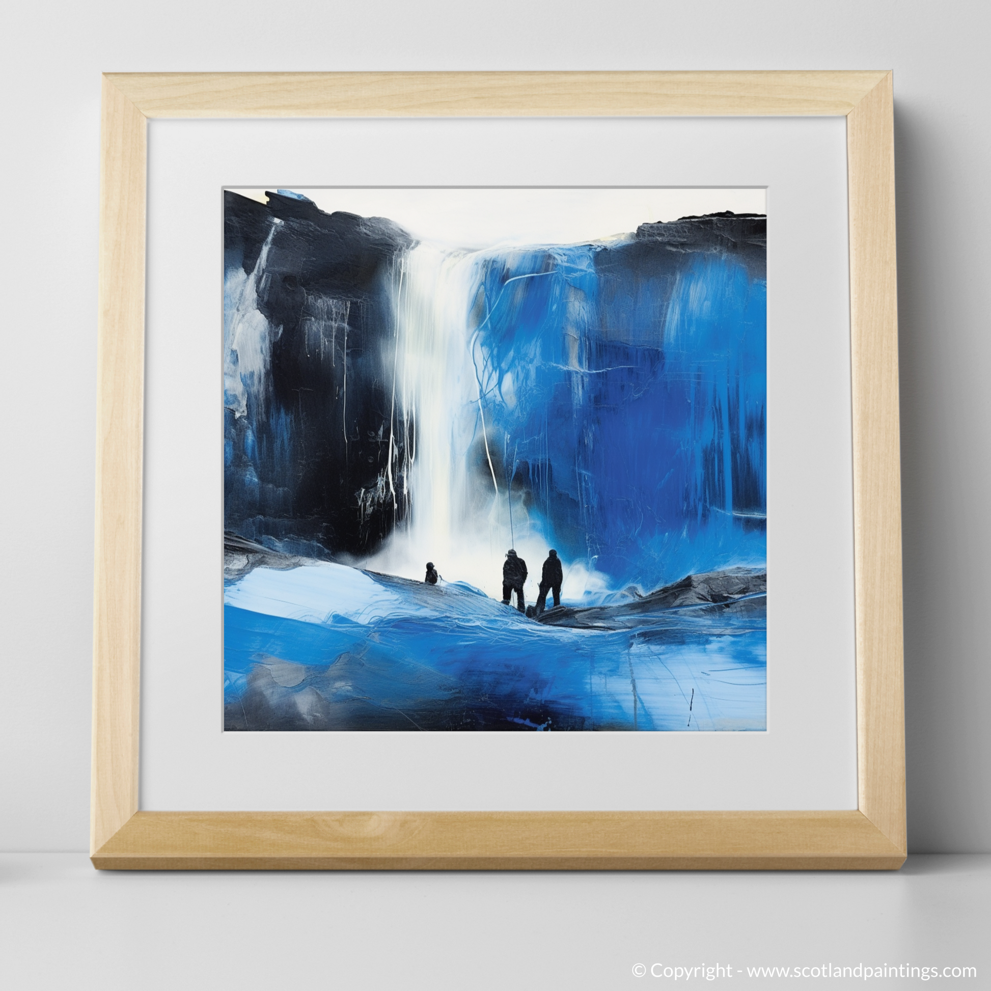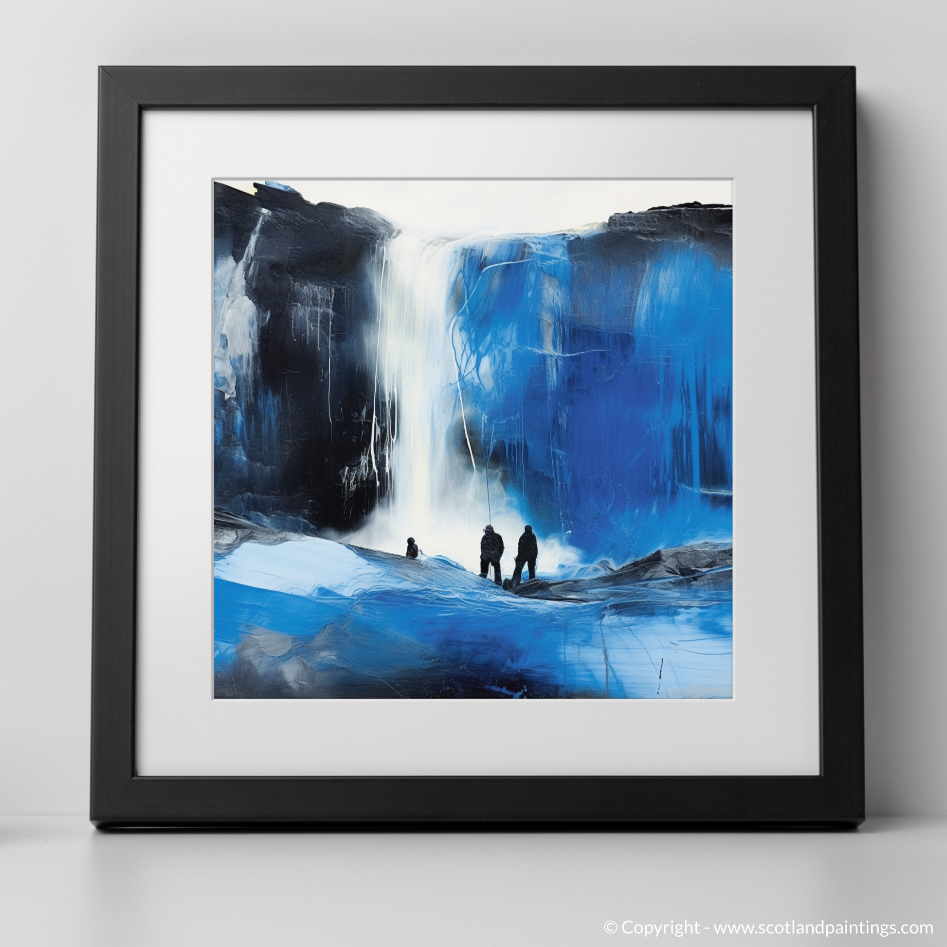 At the heart of this enigmatic piece, the contrast between the vigorous strokes of blue and the stark, eloquent white of the waterfall evokes the unique spirit of the Highlands, blurring the lines between the ephemeral and the eternal. The silhouette of hikers adds a human element, juxtaposed as small yet poignant figures amidst the vastness—a testament to the grandeur of nature and the allure of its wild, untamed beauty.
