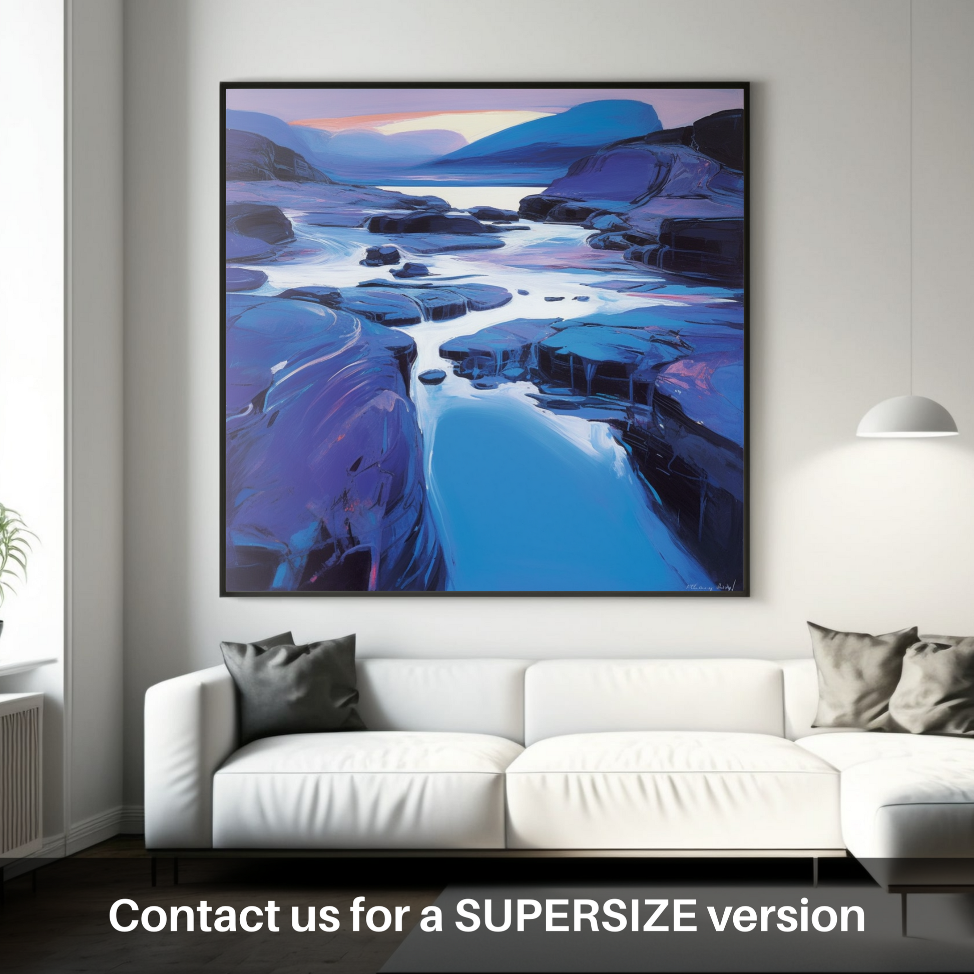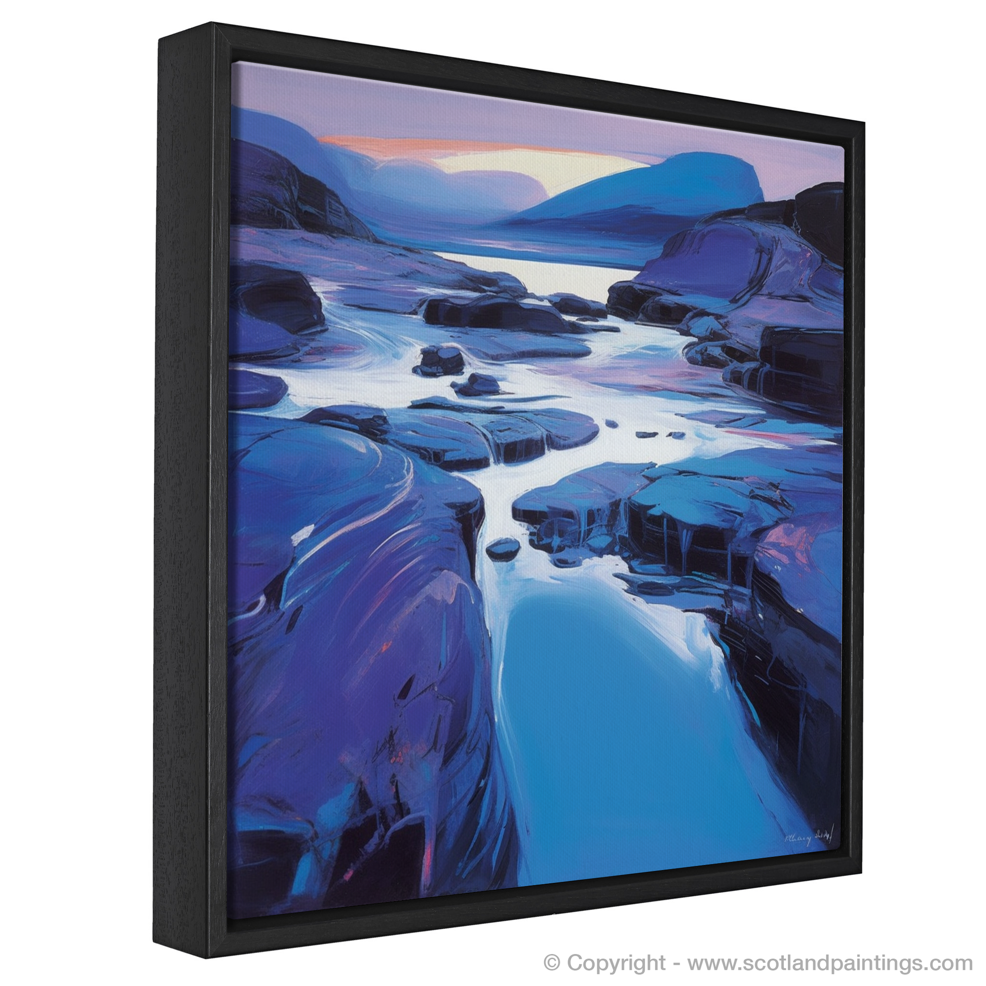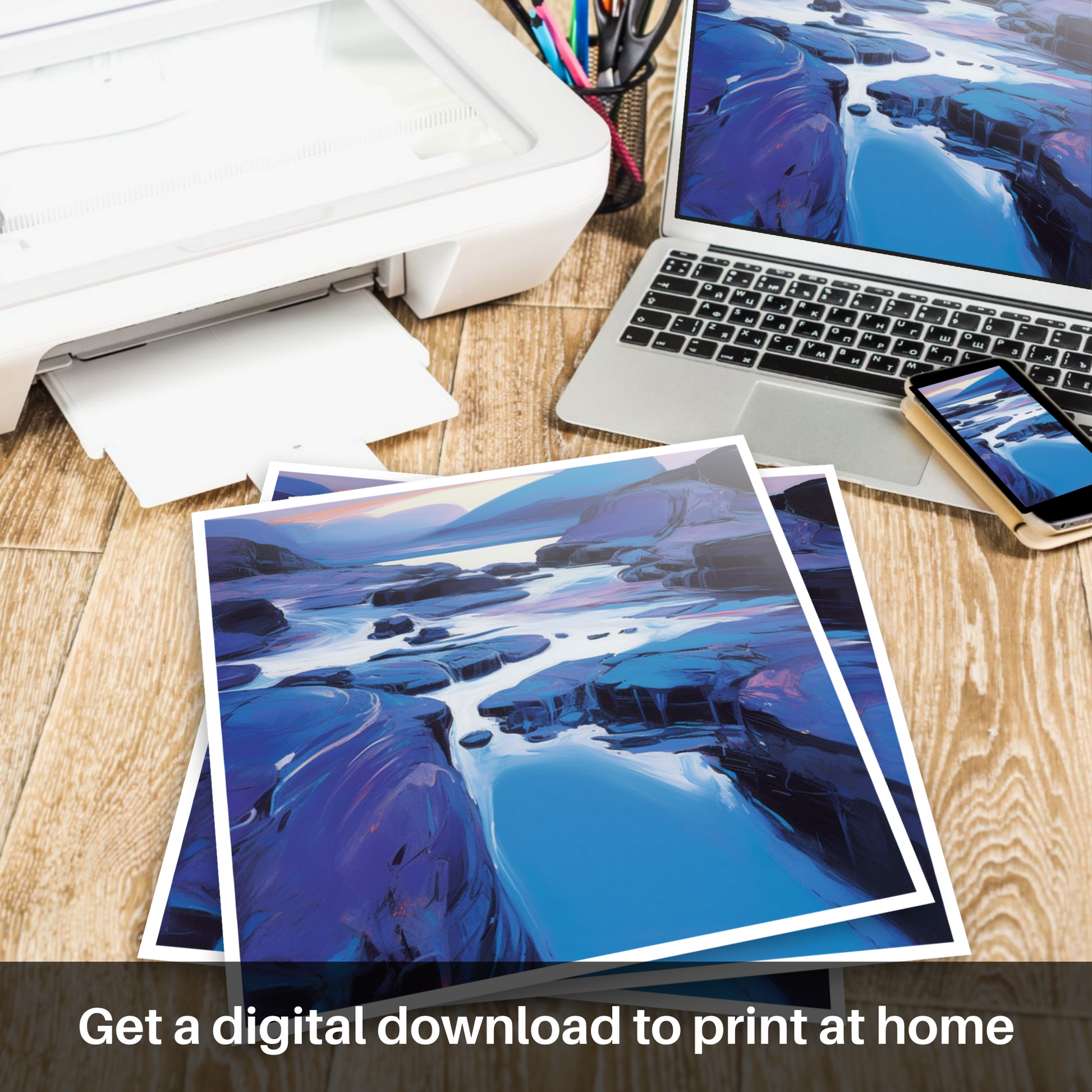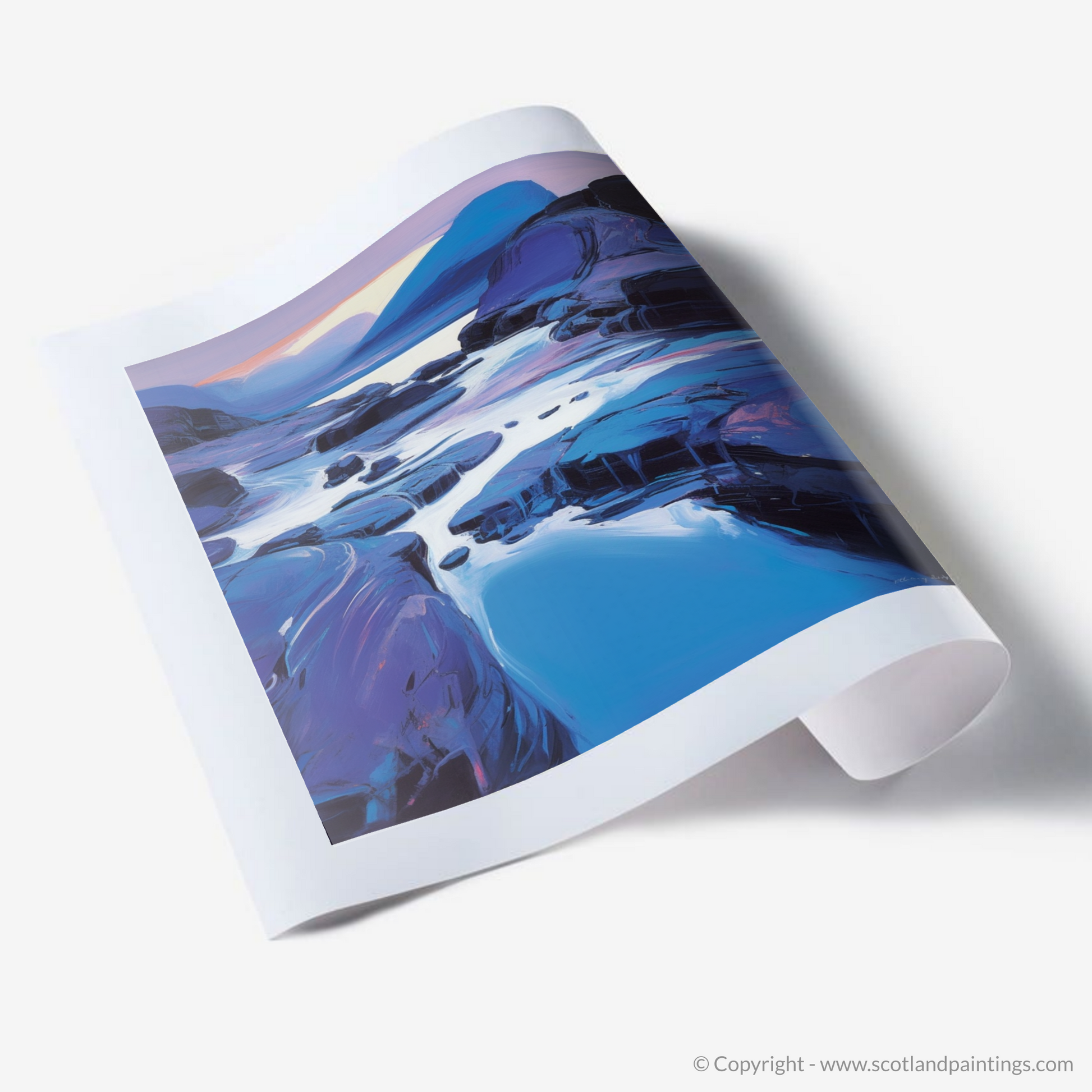 Immerse your senses in the serene beauty of the Scottish Isles with this enchanting print, capturing the mystical allure of the Isle of Skye's Fairy Pools at the tranquil transition of day to night. Swirling shades of indigo and violet dance across the canvas, reflecting the fading light of dusk, while strokes of white and ice blue suggest the gentle flow of crystal-clear waters meandering through ancient, rugged rock formations.