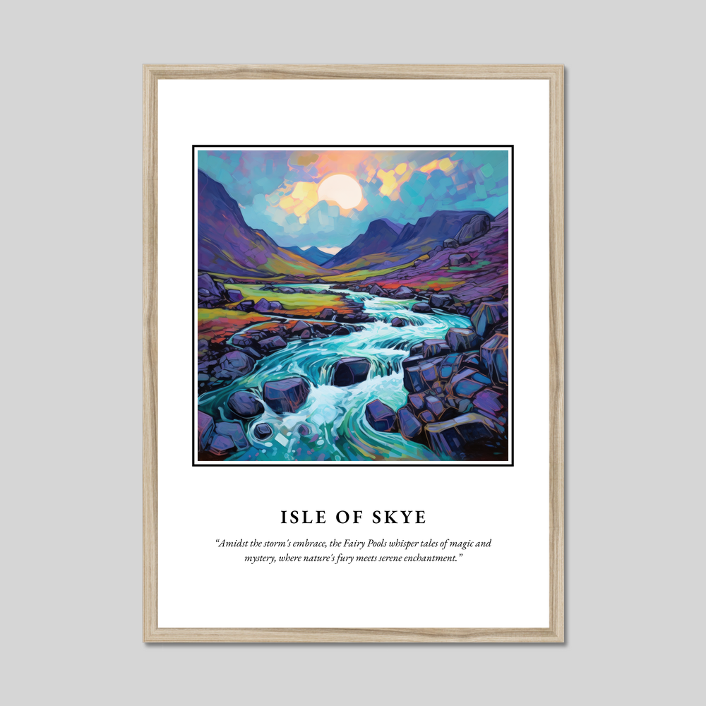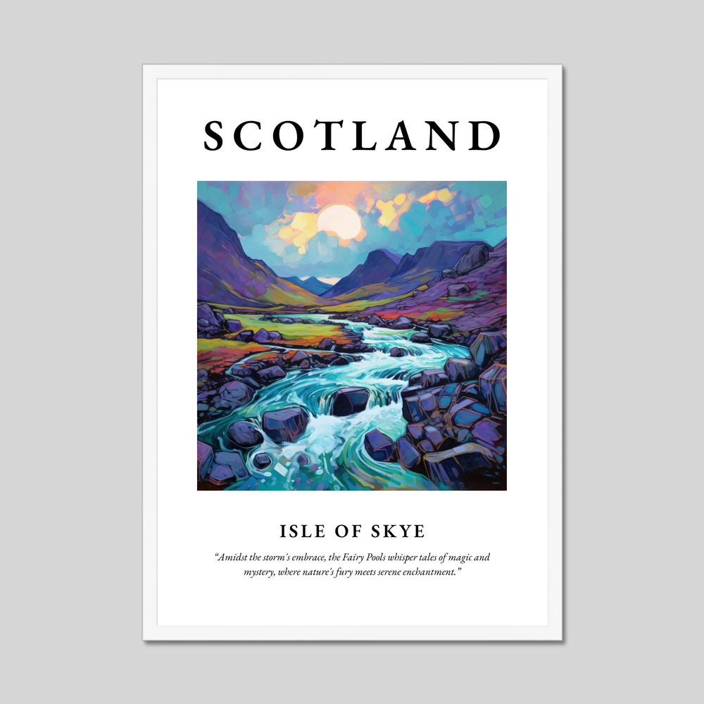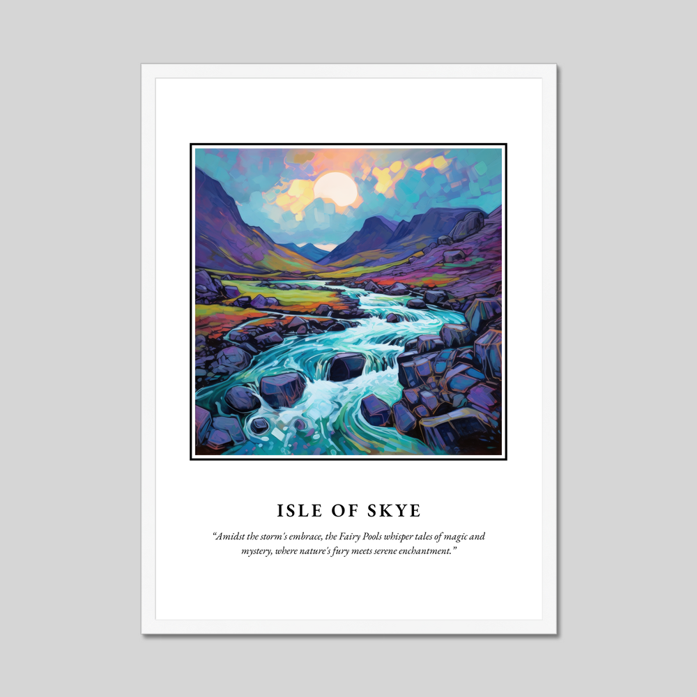 At the heart of this enticing artwork is a modern impressionistic rendering of the Isle of Skye. The vibrant swirls of colour capture the island’s enchanting landscape, while broad brushstrokes vividly depict a scene that feels both dynamic and peaceful. Above the painting, “SCOTLAND” stands proudly in bold lettering, making it a striking focal point for lovers of this magnificent land. Below the artwork, the evocative quote, “Amidst the storm's embrace, the Fairy Pools whisper tales of magic and mystery, where nature's fury meets serene enchantment,” invites viewers to lose themselves in the magic of Skye’s natural wonders.