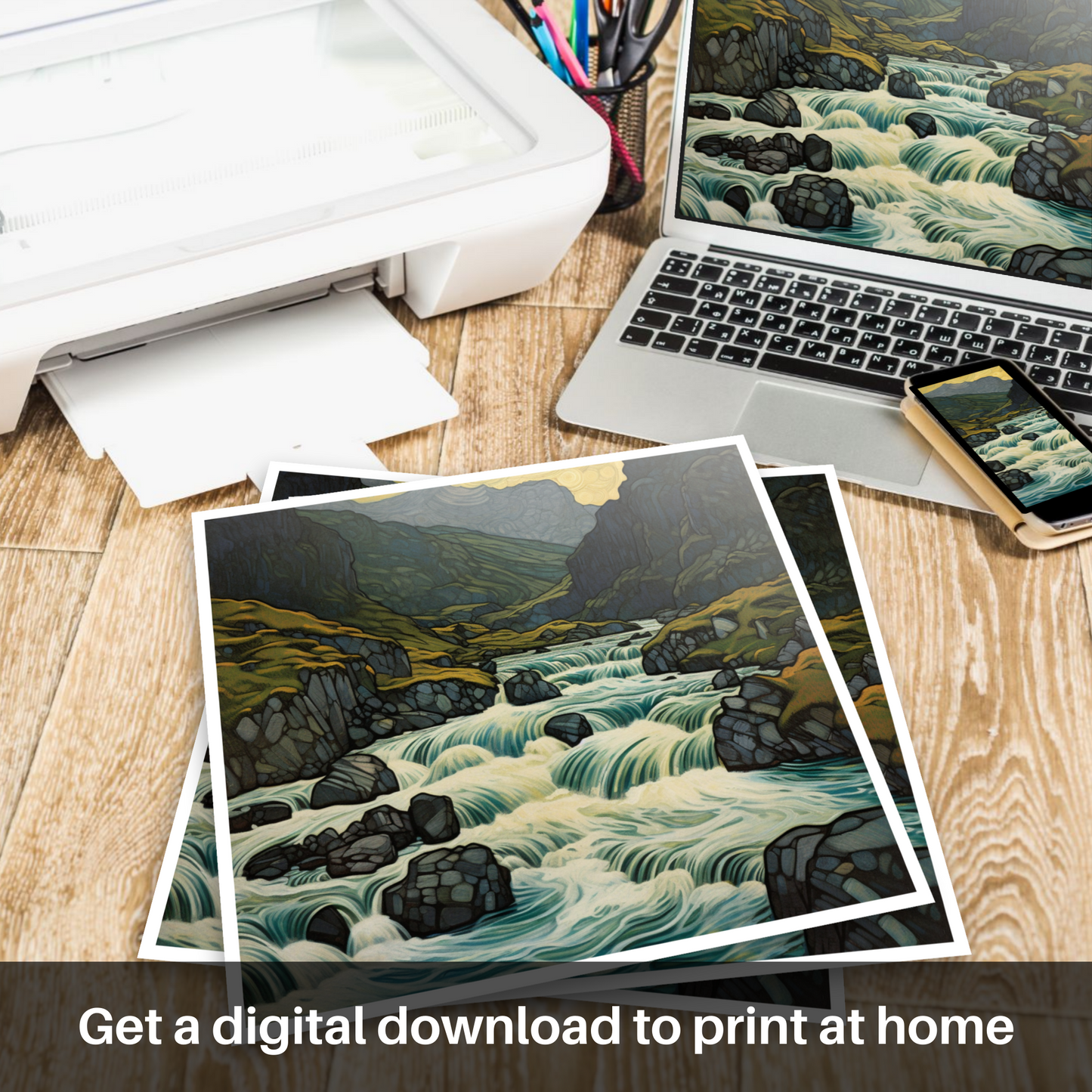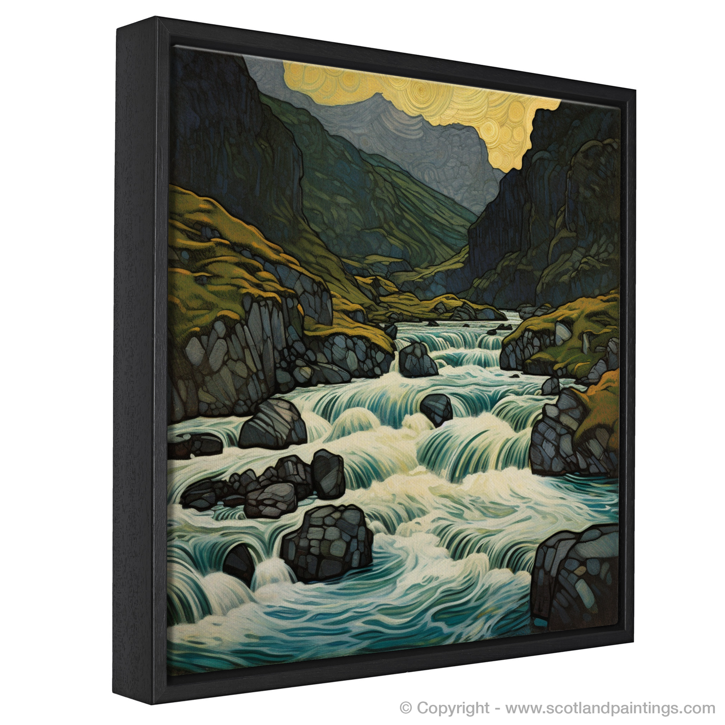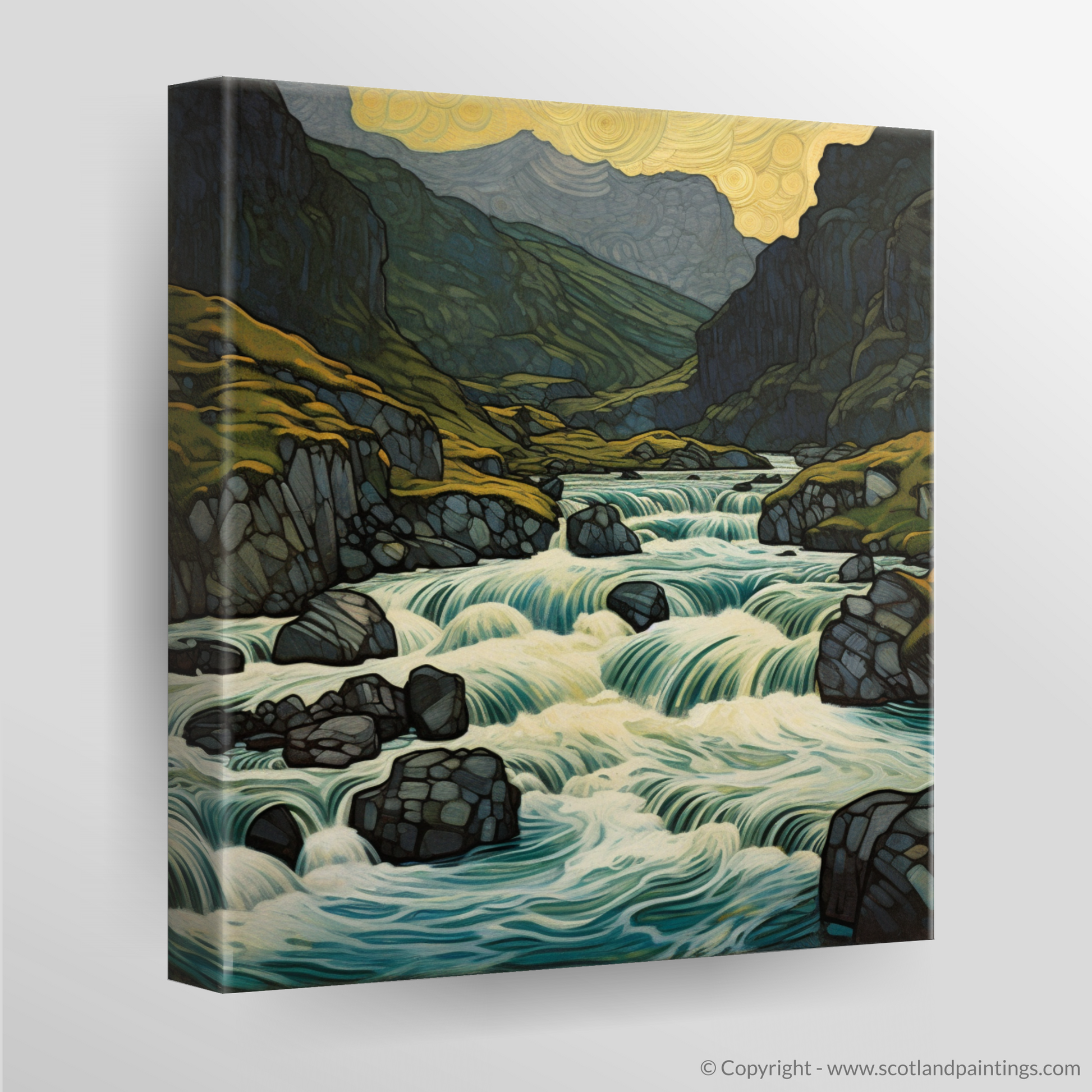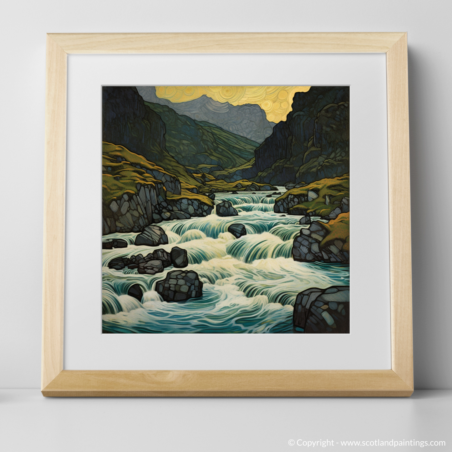 Immerse yourself in the magical ambiance of the Scottish Highlands with this enchanting print, inspired by the famed Fairy Pools on the Isle of Skye. This unique artwork exquisitely captures the bewitching allure of this natural wonder, imbuing it with an Art Nouveau flair that accentuates the flowing forms and sinuous lines of the landscape.