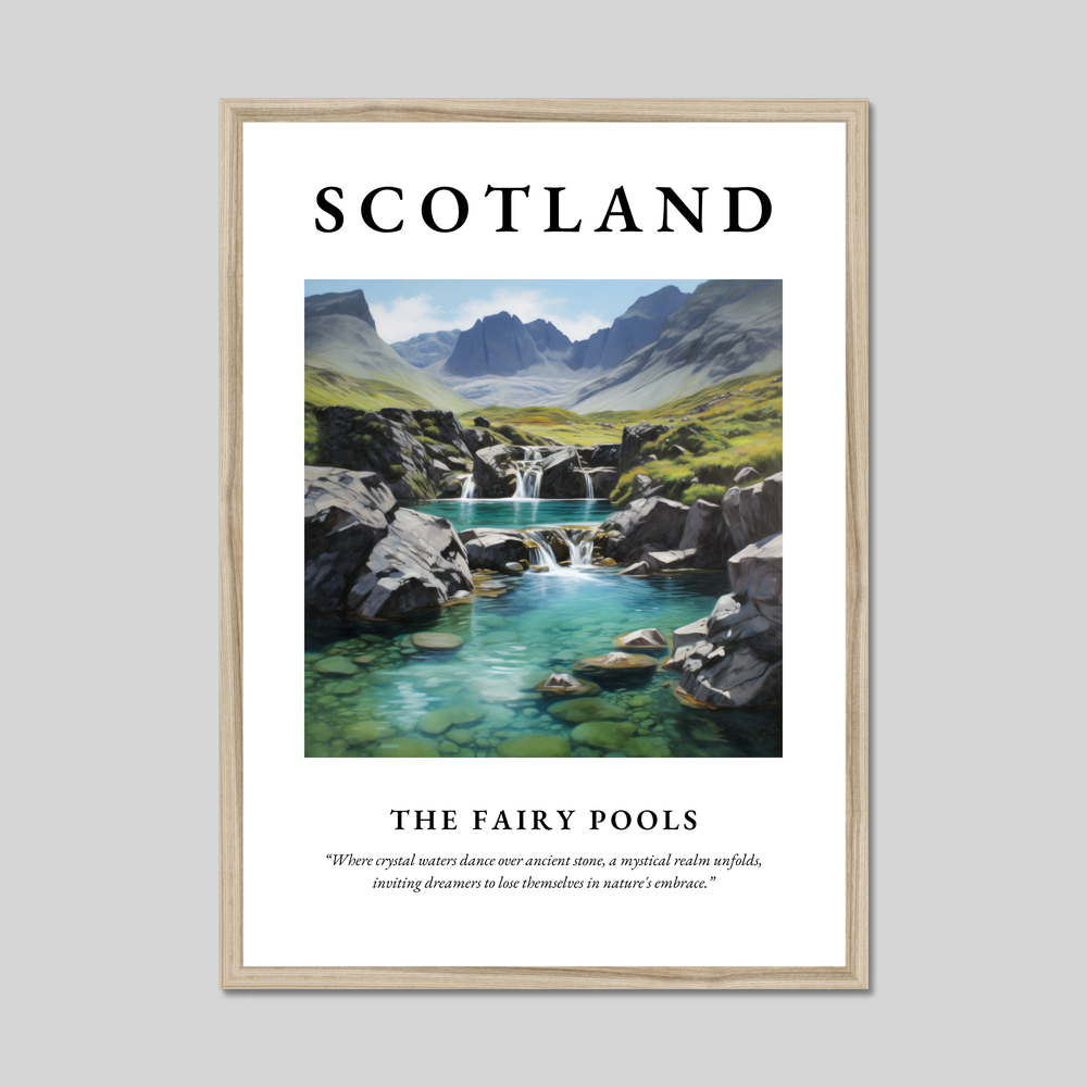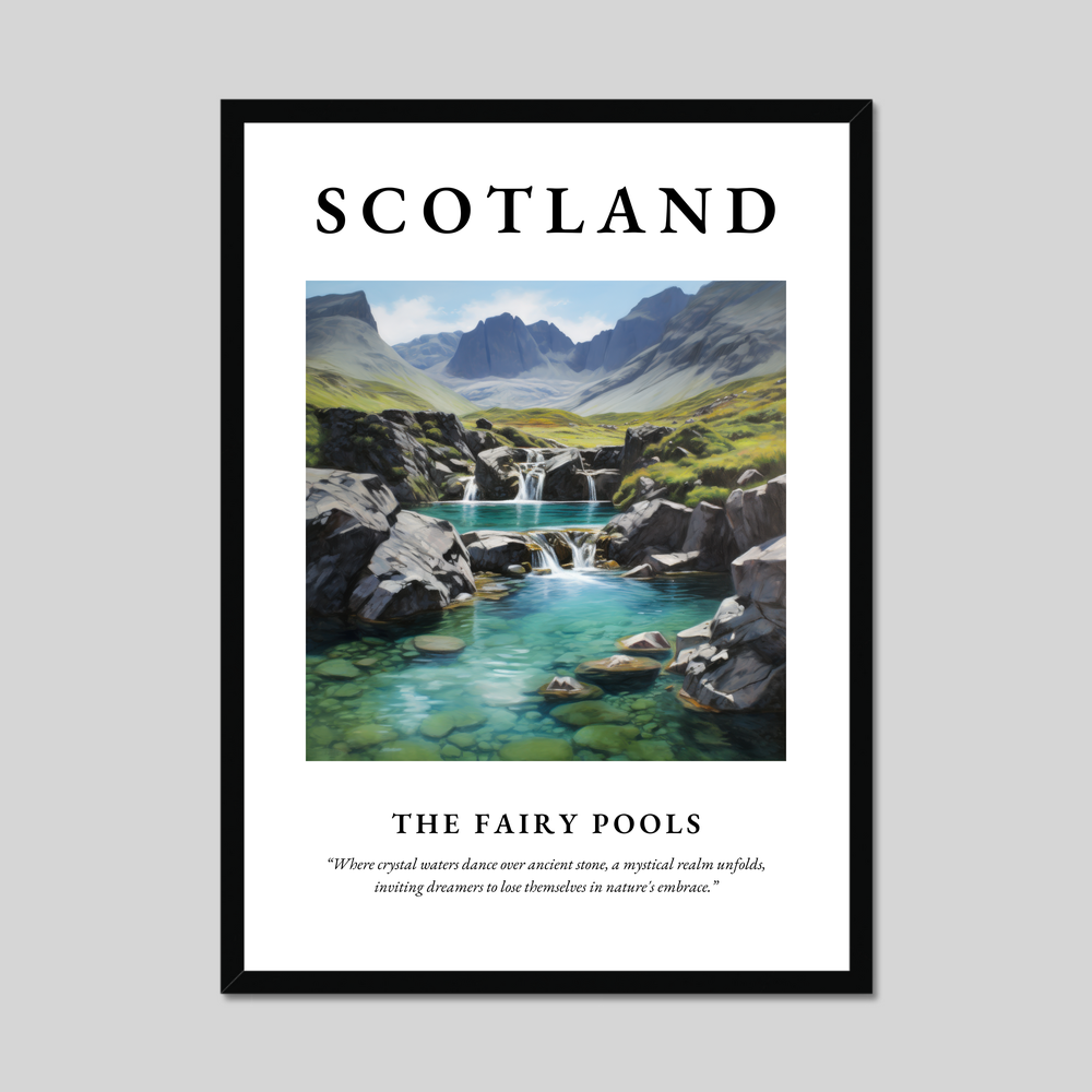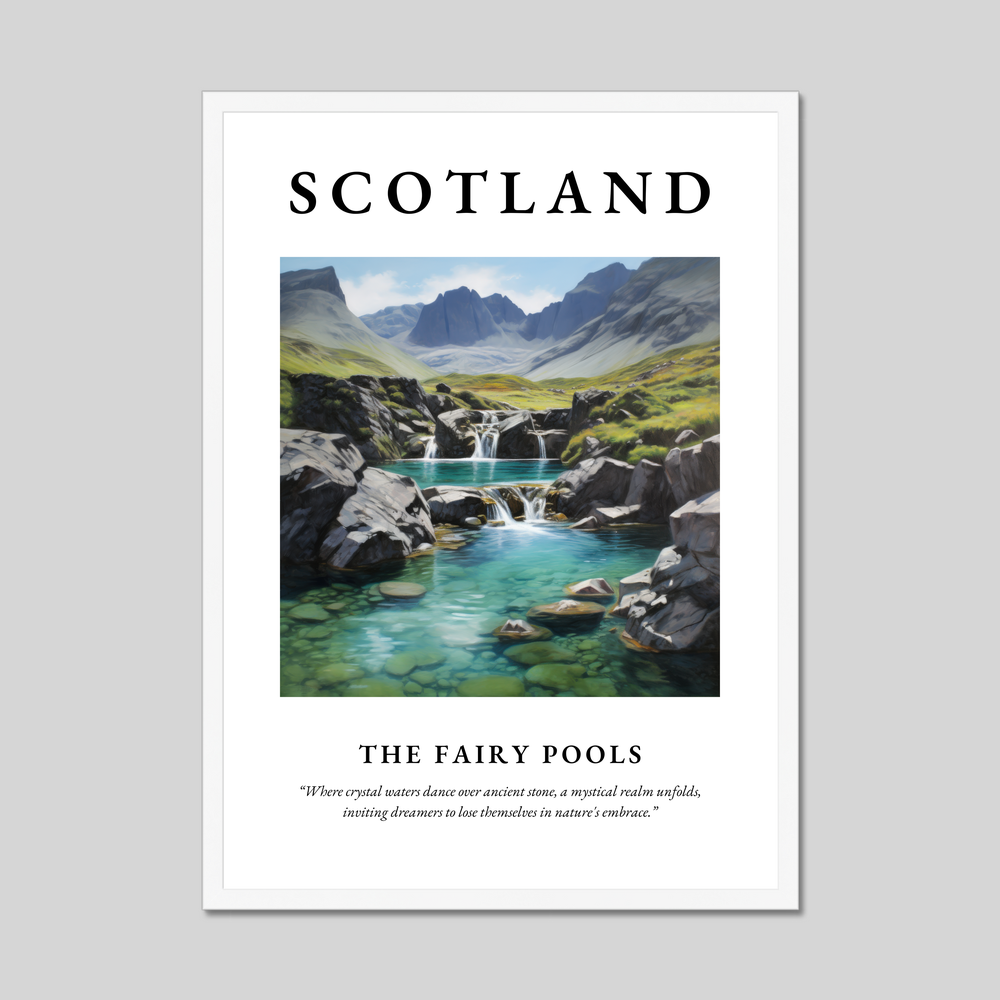 The poster’s design places “SCOTLAND” in bold lettering at the top, a proud nod to the country’s natural wonders. Below, a stunning Impressionist portrayal of The Fairy Pools unfolds, capturing the serene beauty of this magical Scottish site. The vibrant hues and dynamic brushstrokes convey the playful dance of crystal-clear waters over ancient stones, evoking a world where nature and fantasy intertwine. Beneath the visual splendour lies a thoughtful quote: “Where crystal waters dance over ancient stone, a mystical realm unfolds, inviting dreamers to lose themselves in nature's embrace.” This poetic touch is sure to resonate with art enthusiasts, nature lovers, and anyone with a heartfelt connection to Scotland.
