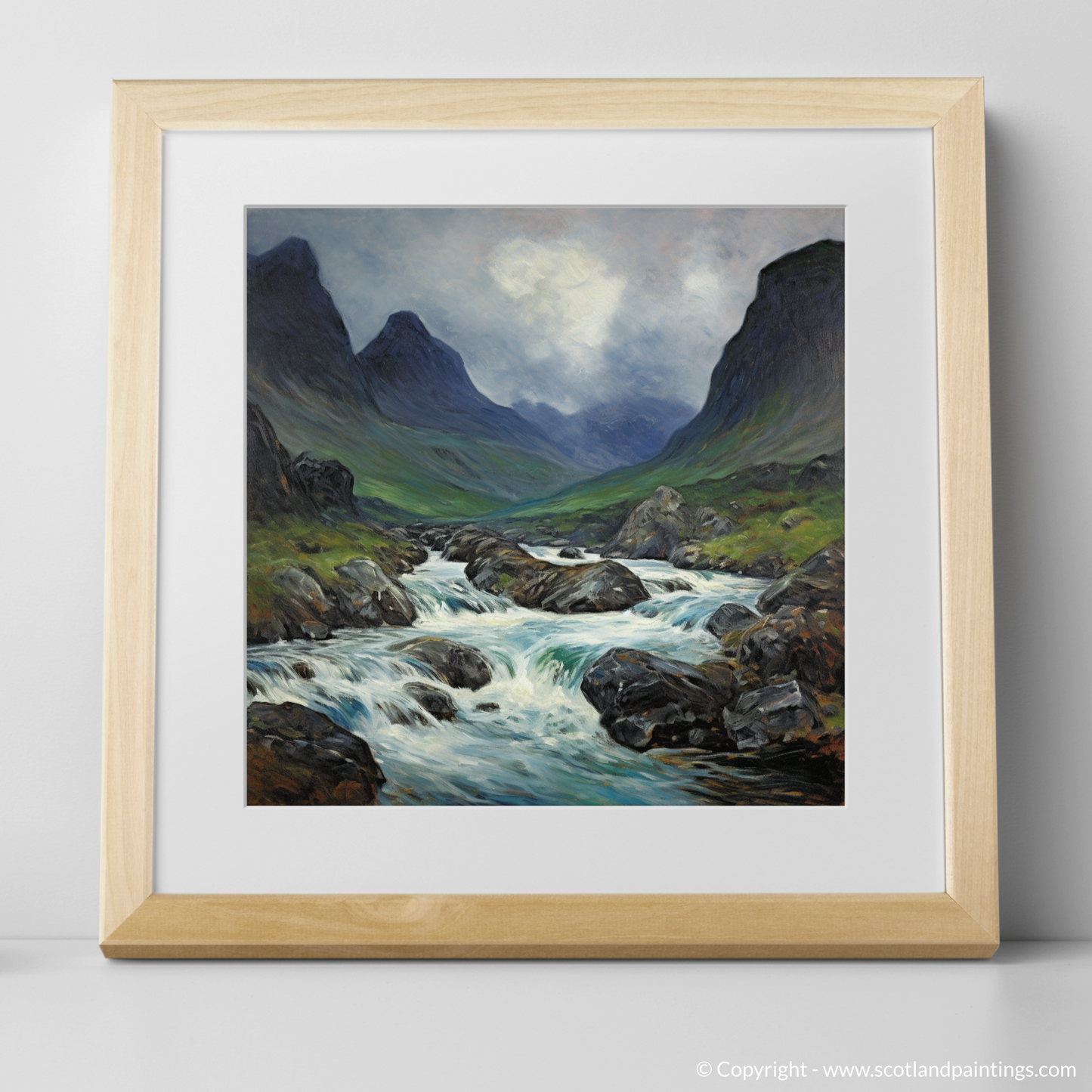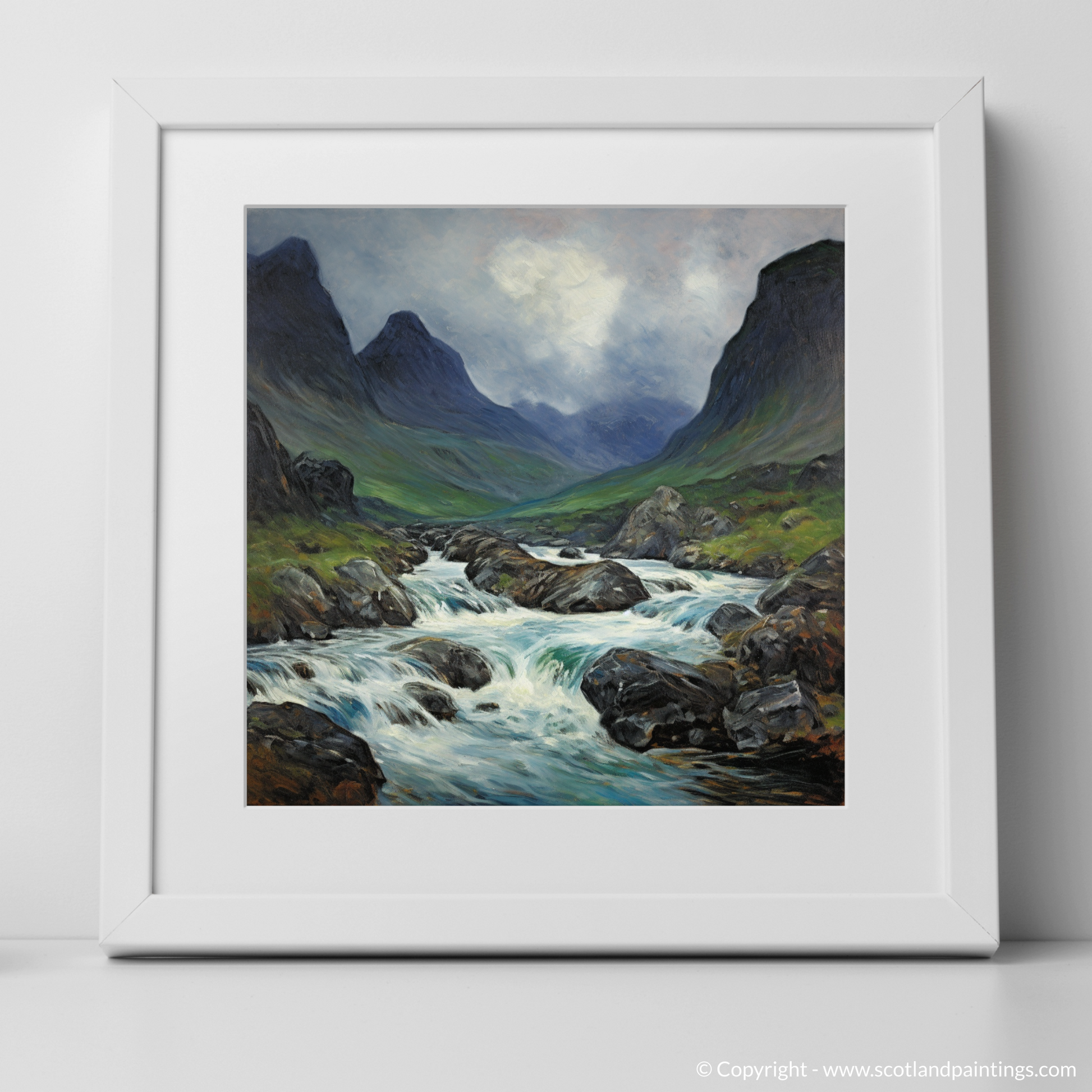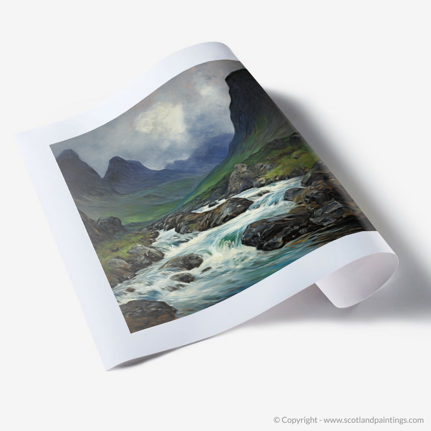 Allow yourself to be swept away by the dynamic energy and brooding atmosphere of this exquisite impressionist print that captures the untamed beauty of the Isle of Skye's famed Fairy Pools. The turbulent waters dance and swirl, realistically rendered with a myriad of expressive brushstrokes that convey the wild spirit of this Scottish wonder. Storm-laden skies loom overhead, their darkness broken by a hopeful glow that bathes the rugged landscape in a soft, ethereal light.