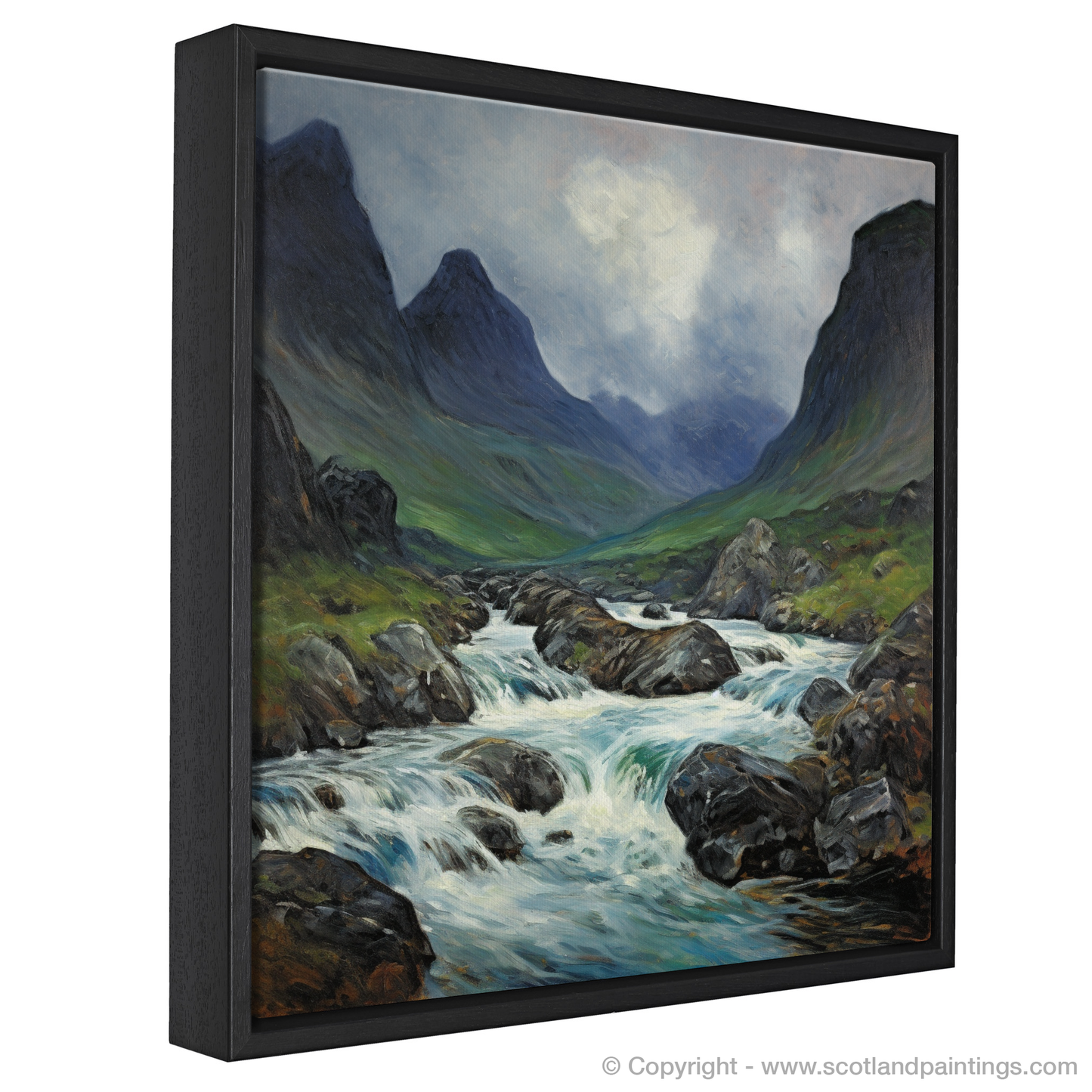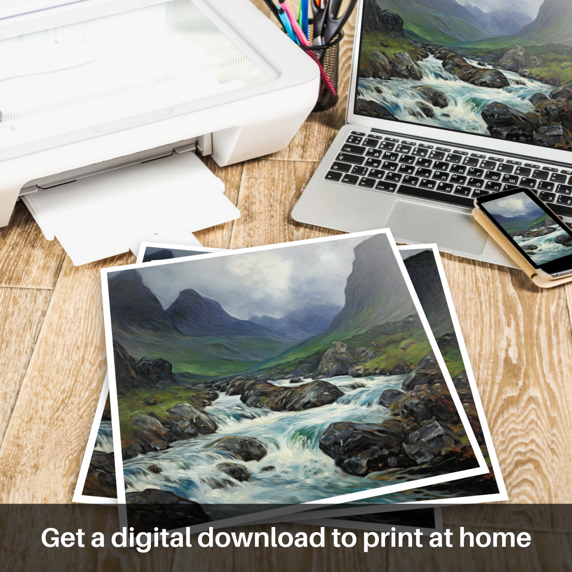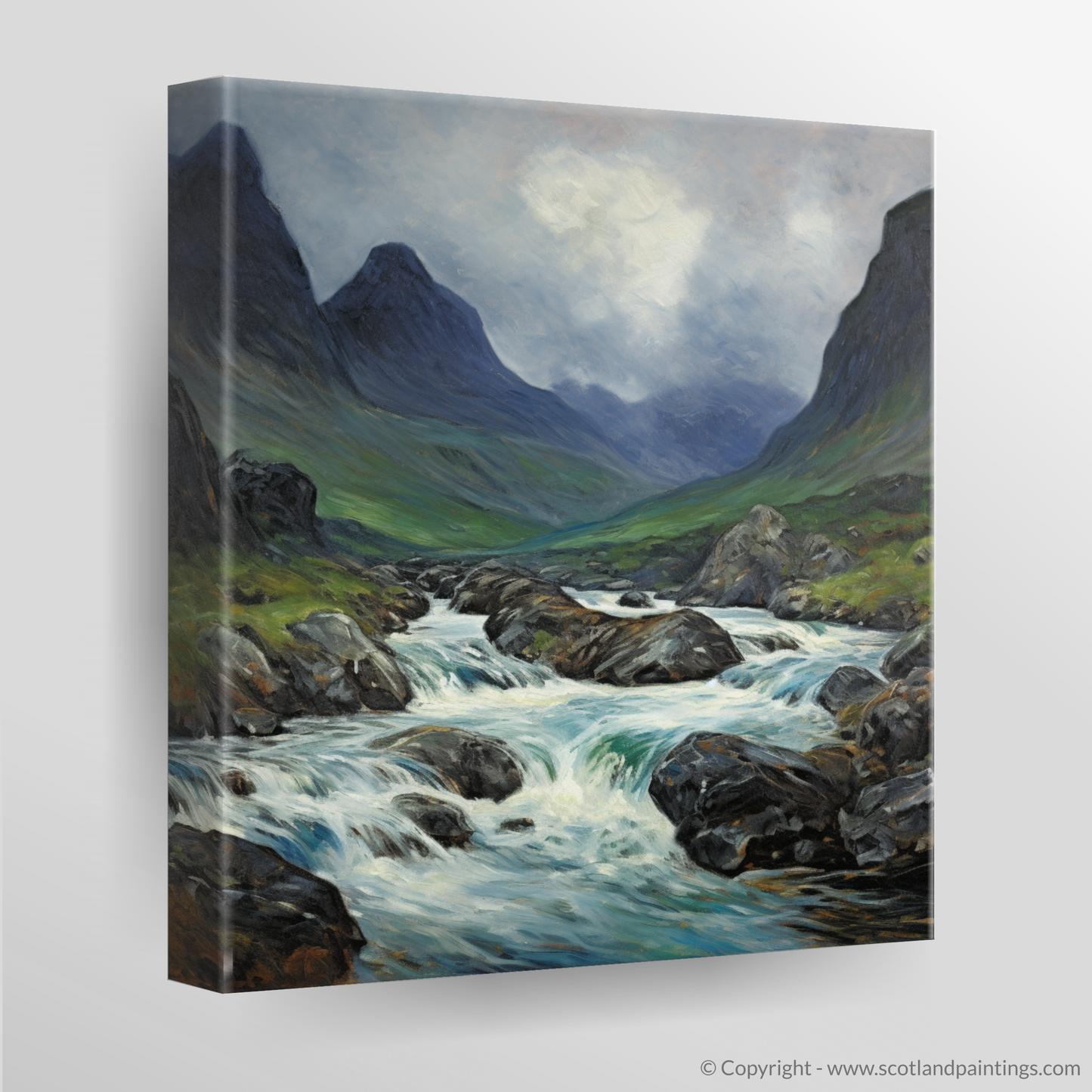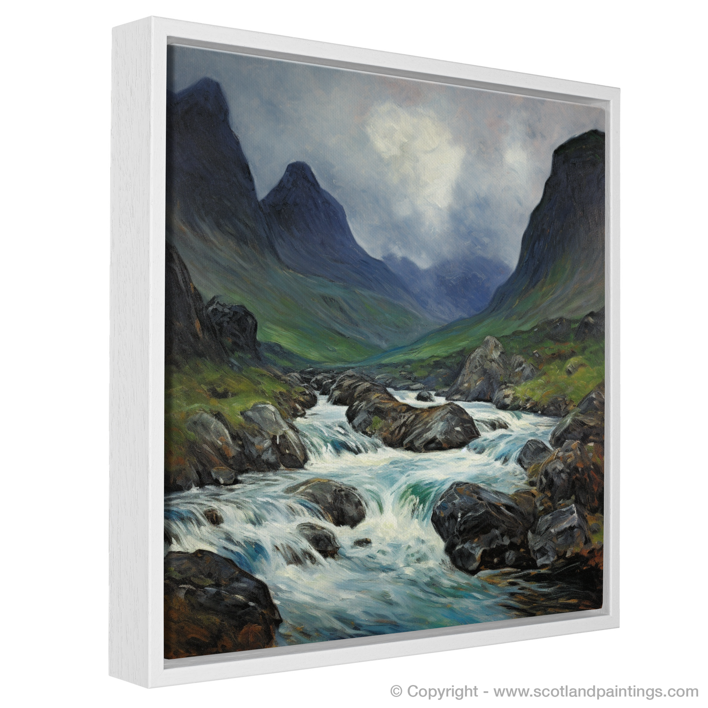 Allow yourself to be swept away by the dynamic energy and brooding atmosphere of this exquisite impressionist print that captures the untamed beauty of the Isle of Skye's famed Fairy Pools. The turbulent waters dance and swirl, realistically rendered with a myriad of expressive brushstrokes that convey the wild spirit of this Scottish wonder. Storm-laden skies loom overhead, their darkness broken by a hopeful glow that bathes the rugged landscape in a soft, ethereal light.