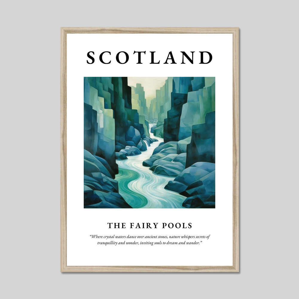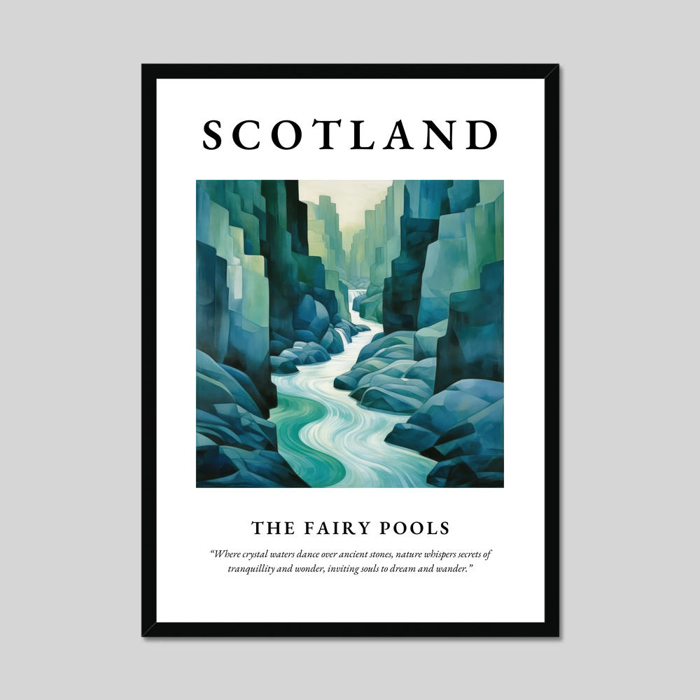Introducing our stunning framed poster print, perfect for those who cherish the ethereal beauty of Scotland. Measuring a generous 50cm x 70cm, this poster features the word "SCOTLAND" emblazoned at the top in bold lettering, guiding your gaze to a mesmerising painting of The Fairy Pools. Printed in a captivating Cubism style, the artwork transforms natural beauty into geometric wonder, invoking a sense of both modern artistry and timeless nature.