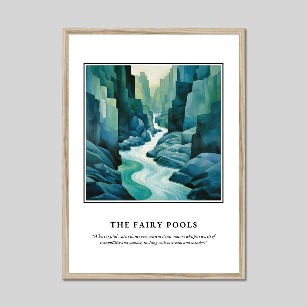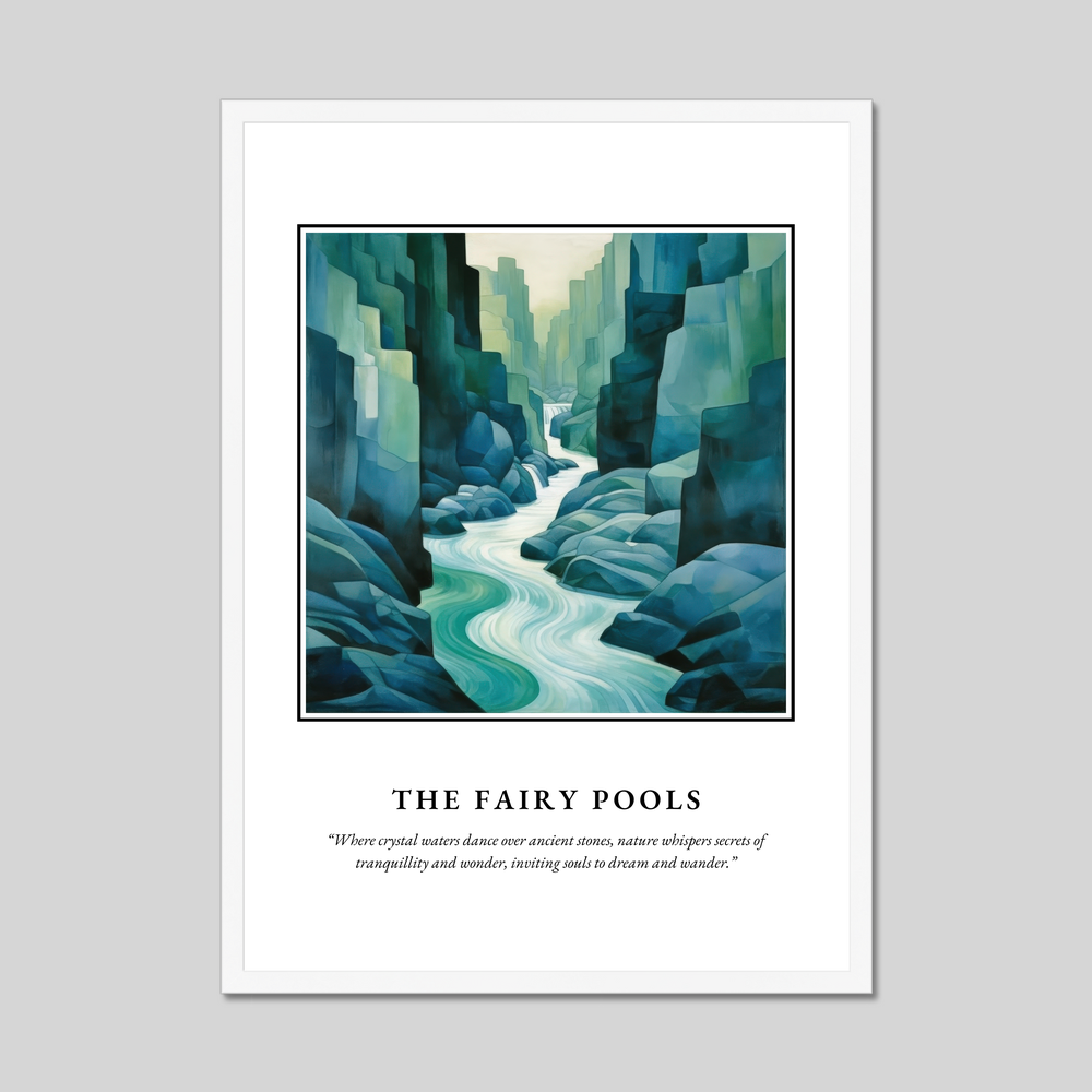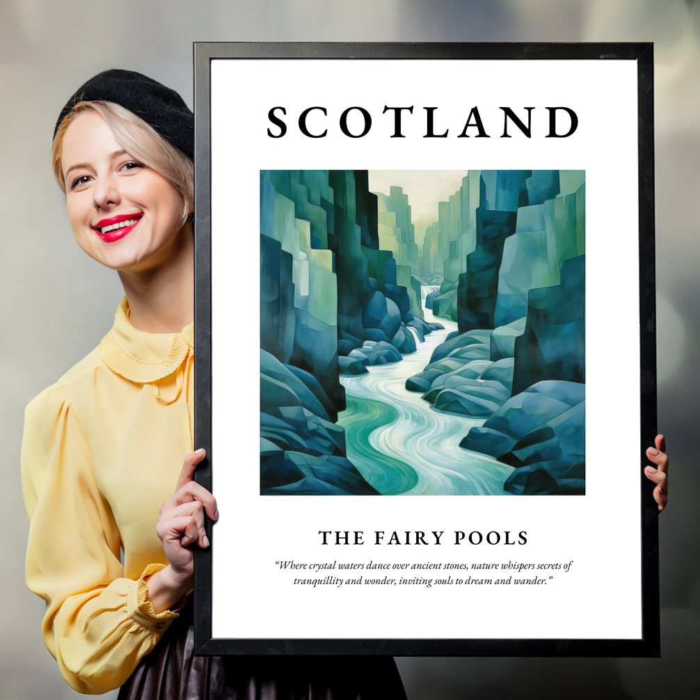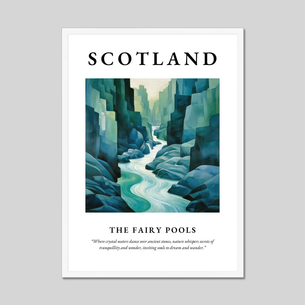 The poster's depiction of The Fairy Pools showcases a landscape where cascading waters weave through rocky canyons, rendered in serene shades of blue and green. The Cubist elements break down the landscape into abstract forms, offering a unique perspective to lovers of art and Scotland alike. It's perfect for those who have explored the rugged beauty of the Isles, wish to relive the memories, or are drawn to the enchanting whispers of nature.