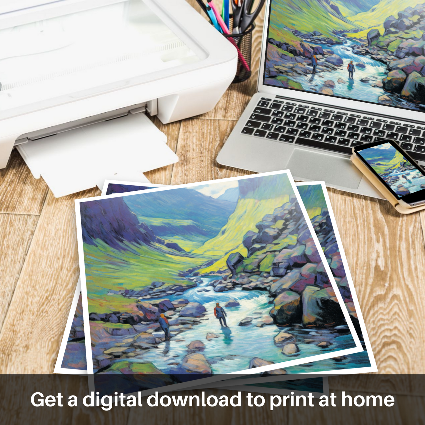 Embark on a visual journey through the rugged beauty of the Isle of Skye with this enchanting print. Captured in an Impressionist style, the piece evokes the tranquility and splendour of the Fairy Pools, a natural wonder revered by hikers and nature lovers alike.