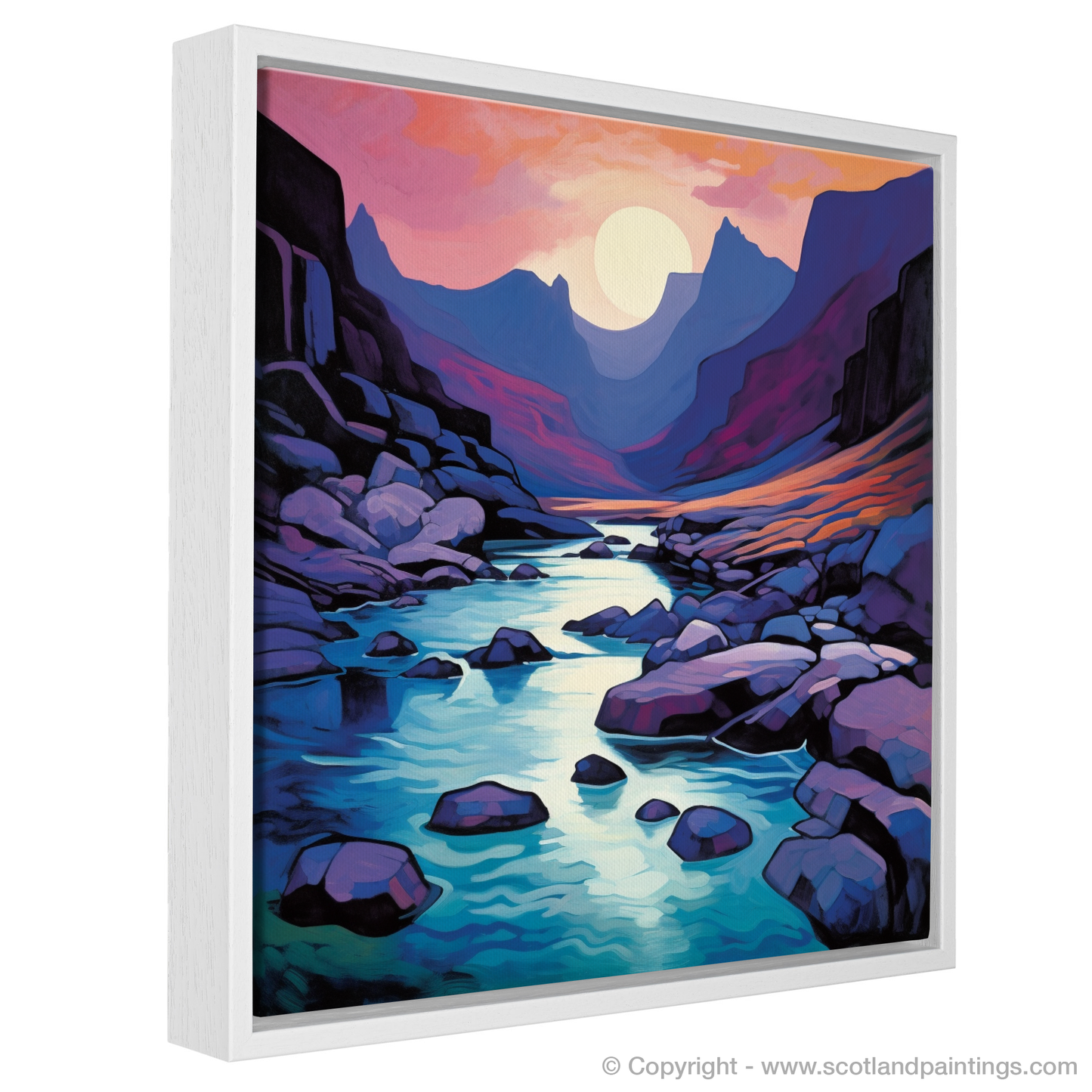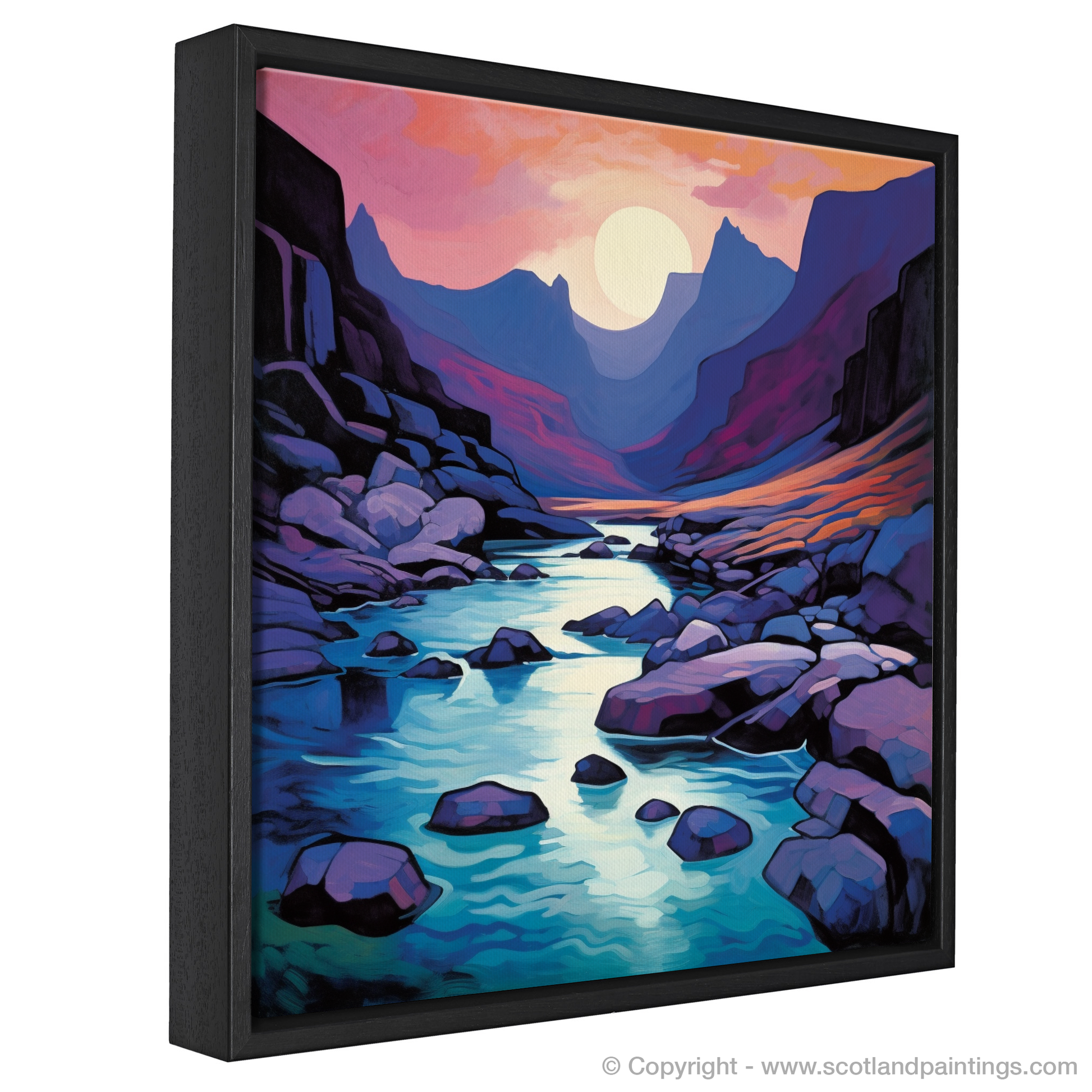 This evocative piece is not merely a depiction but a sensory journey that calls to those who yearn for the wild romance of the Scottish Isles. Whether this hangs in your home or workspace, it promises to transport you to a serene realm, where the magic of the Fairy Pools at the close of day is eternalised in a dance of colour and form.