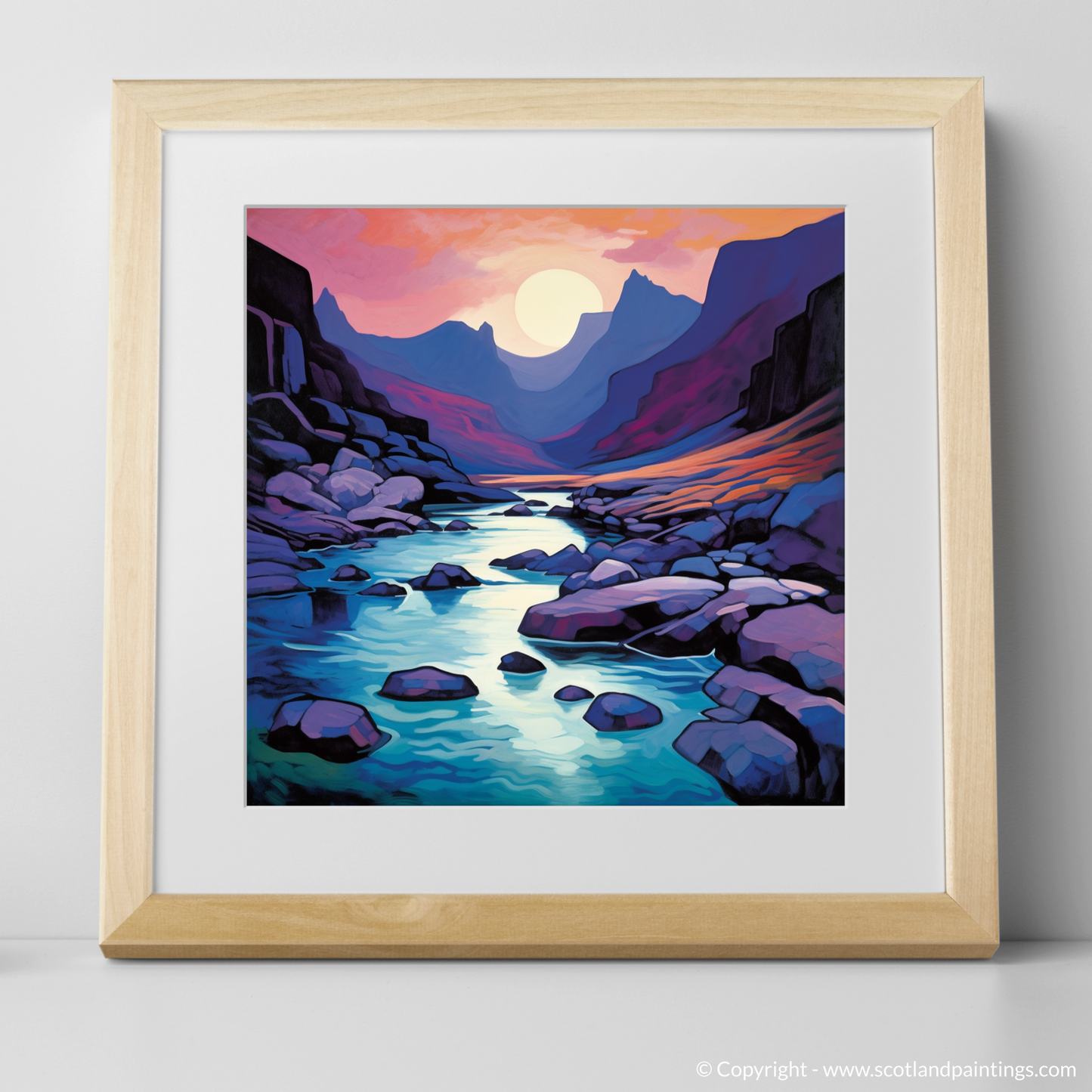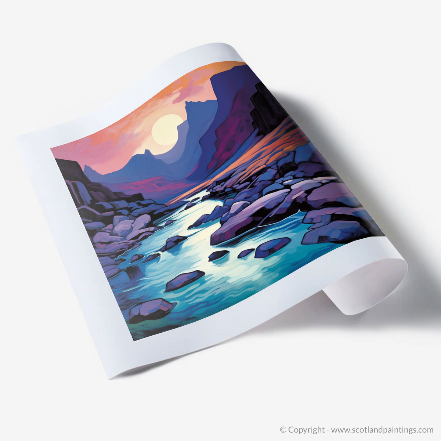 Immerse yourself in the vibrant energy of one of Scotland's natural wonders with this captivating print. The artwork celebrates the enchanting Fairy Pools of the Isle of Skye, rendered in a style reminiscent of the Fauvist movement, known for its bold colours and vigorous brushwork.