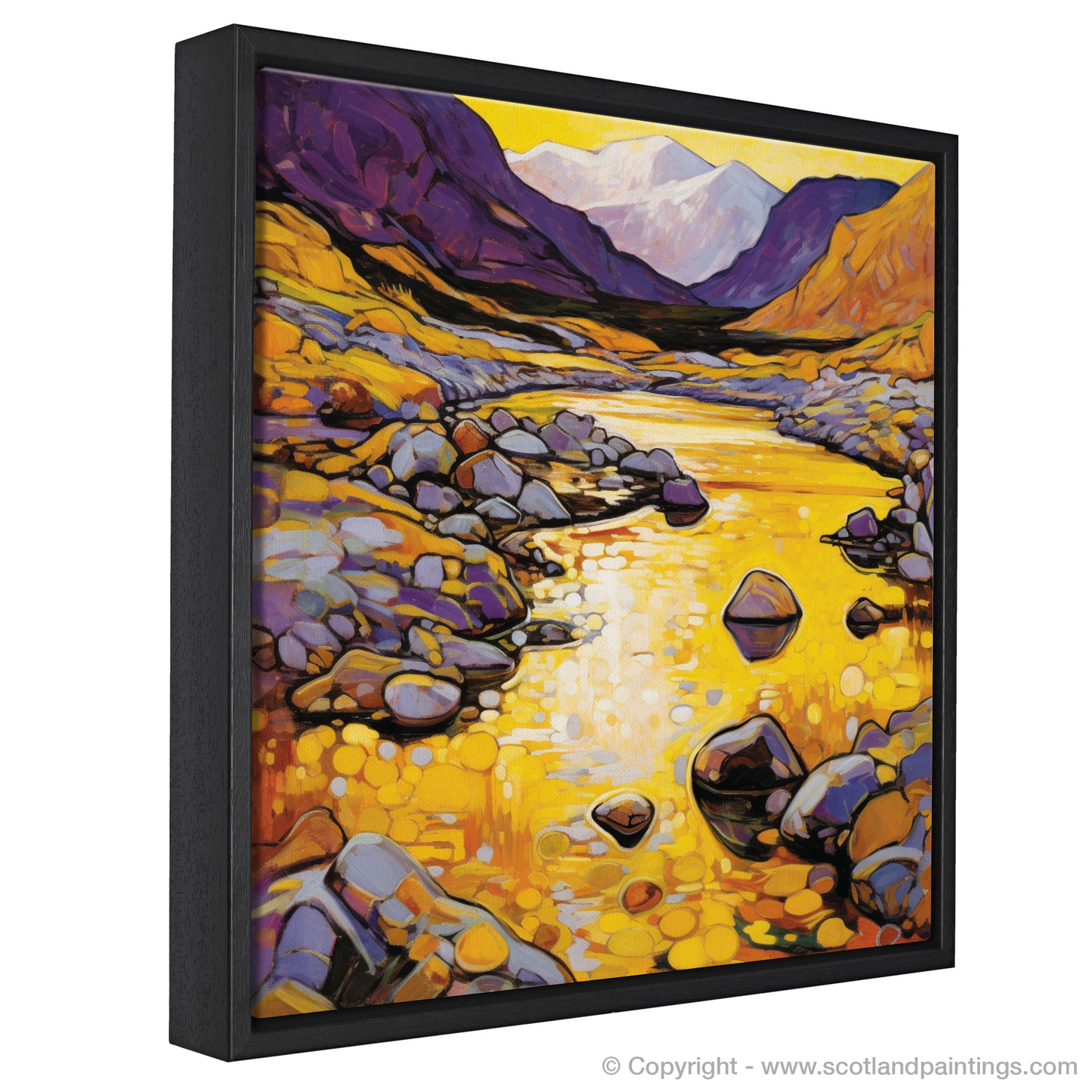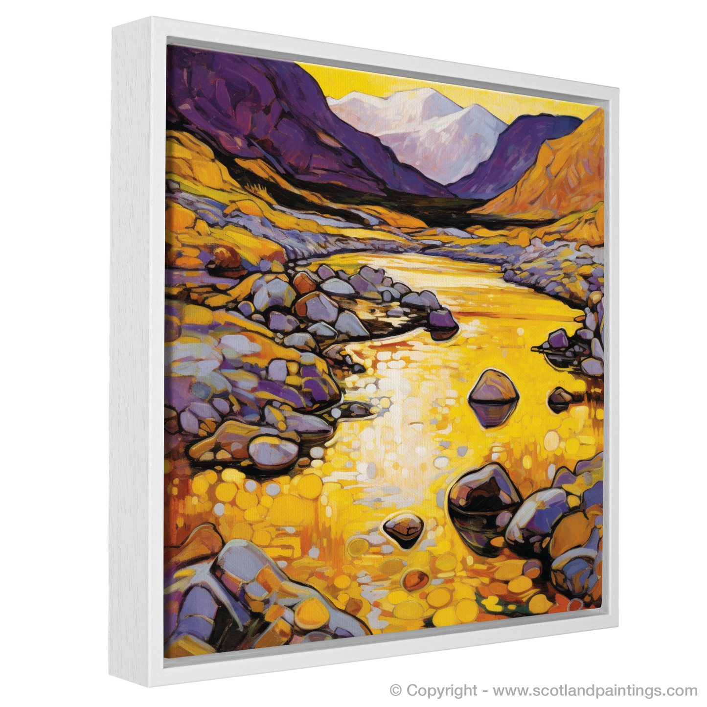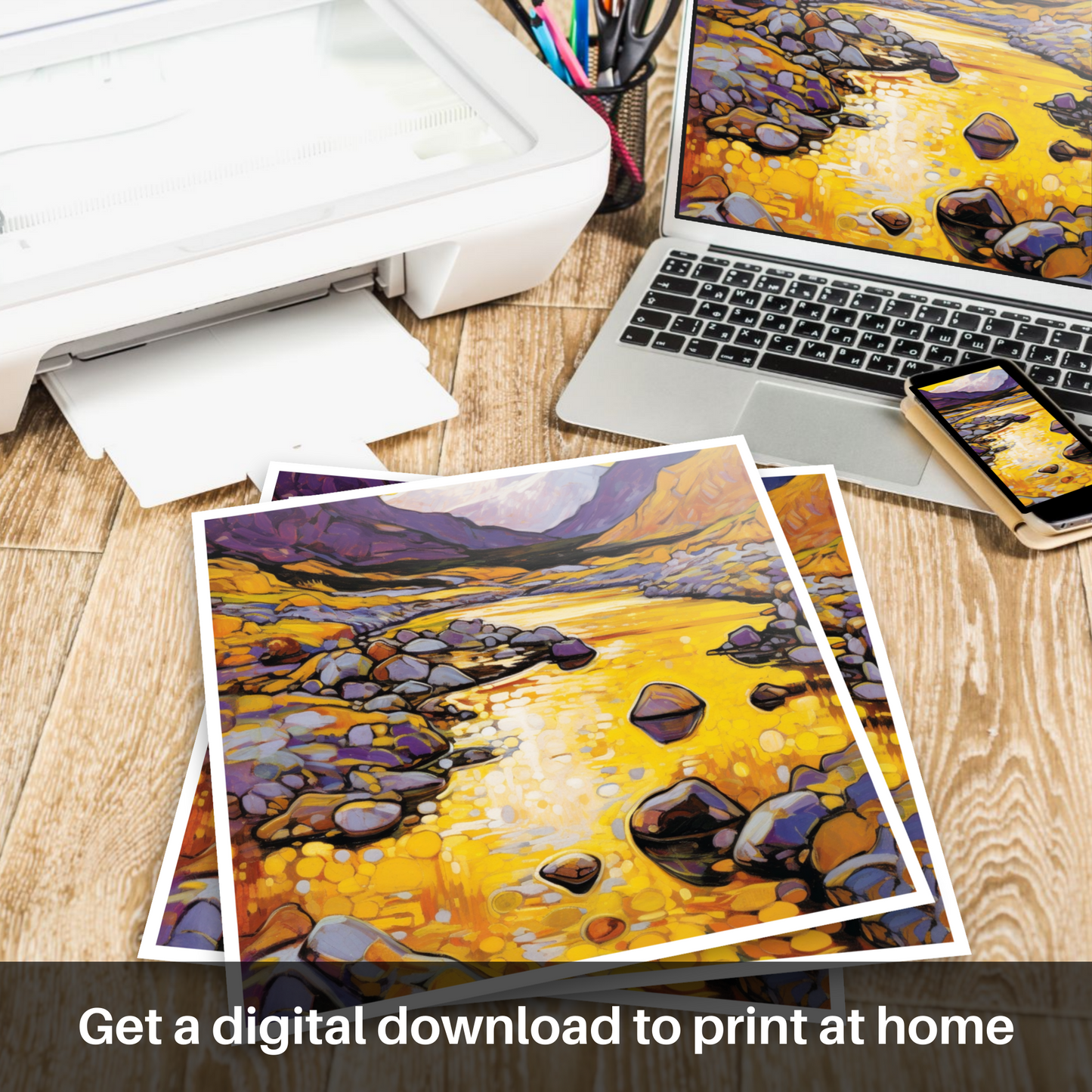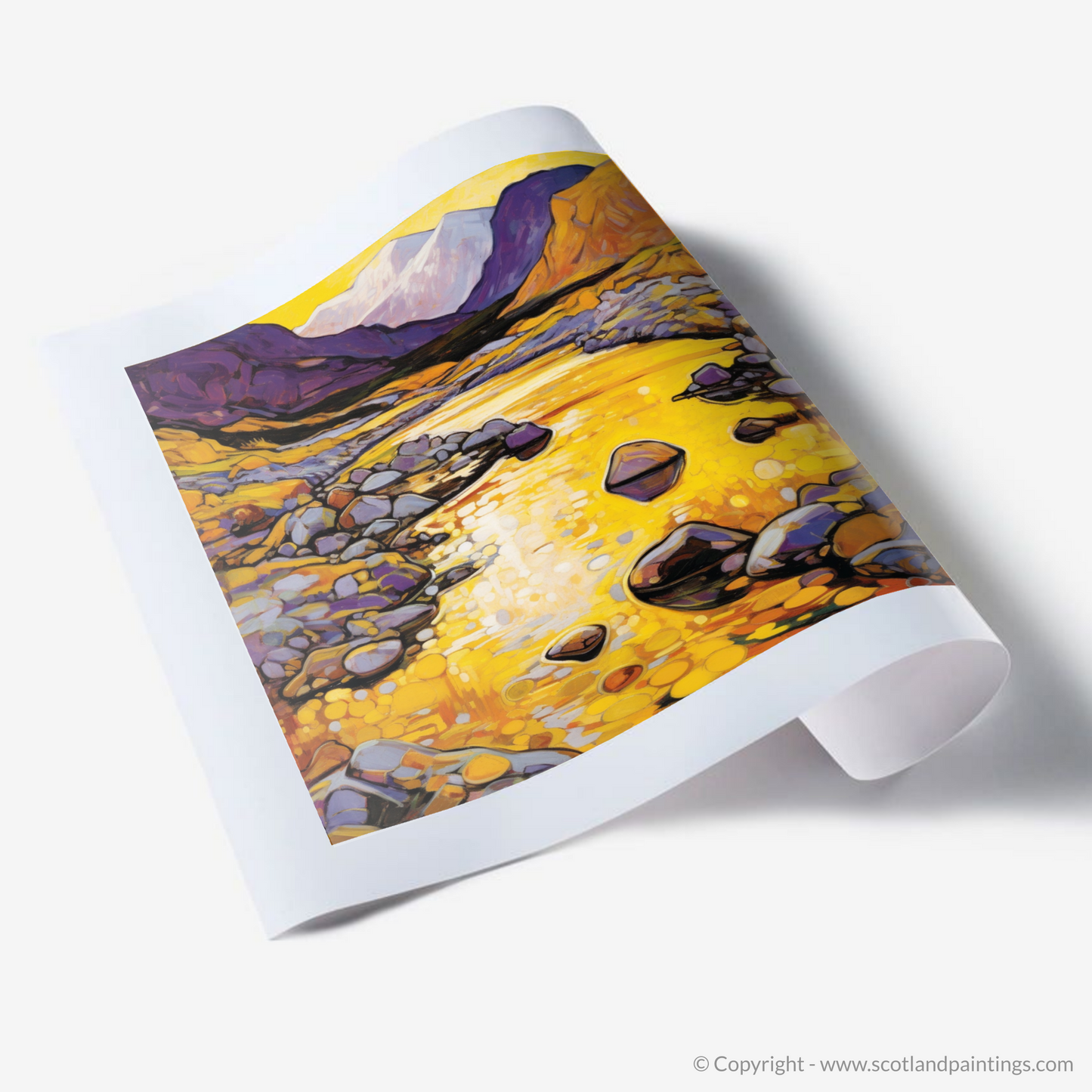 Let the allure of the Scottish Highlands beckon you closer through the vivid abstract interpretation of the Isle of Skye's enchanting Fairy Pools at the most magical time of day, the golden hour. This effervescent print awakens the senses with its mesmerising dance of colours that reflect the distinctive and captivating light of sunset cascading over this mystical landscape.