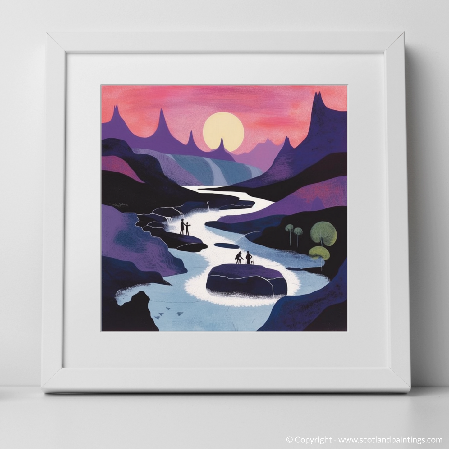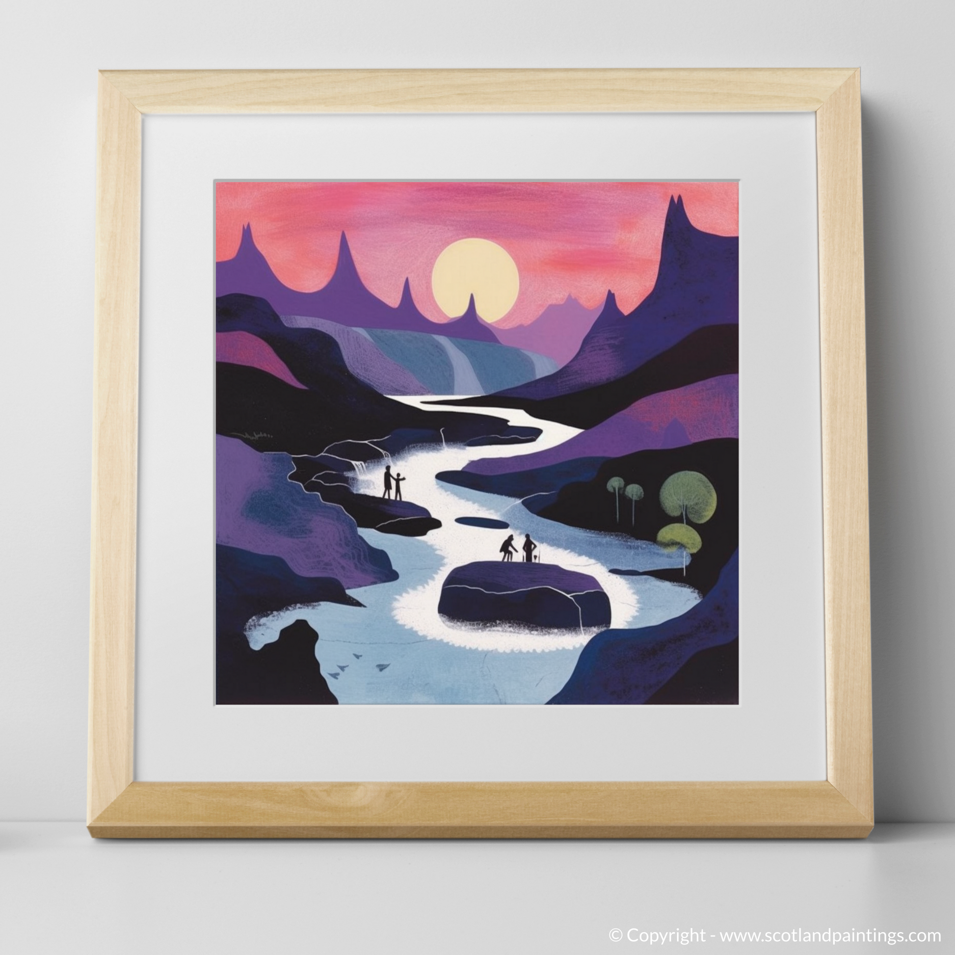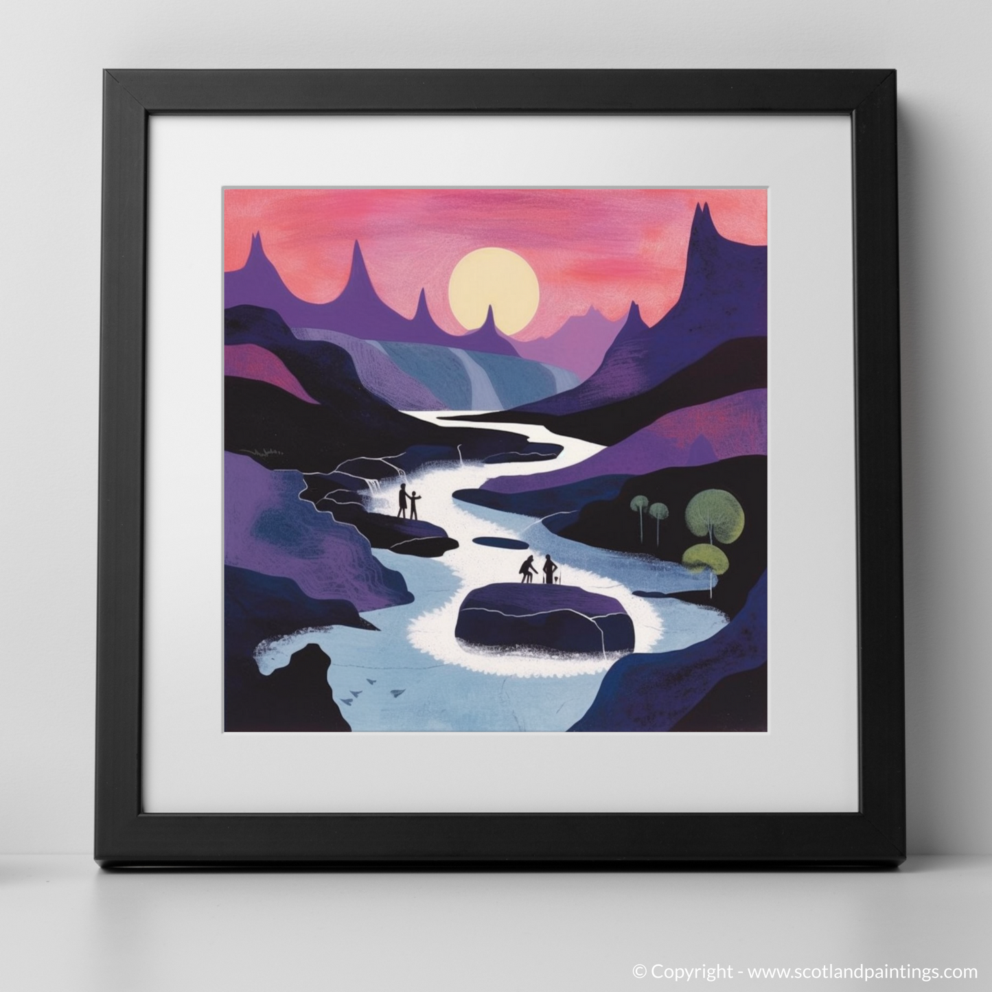 Capture the enchanting serenity of the Isle of Skye's Fairy Pools with this captivating print, which exudes the charm and simplicity of naive art. Embrace the tranquil beauty of Scotland's natural wonders through bold colour palettes and a playful perspective.