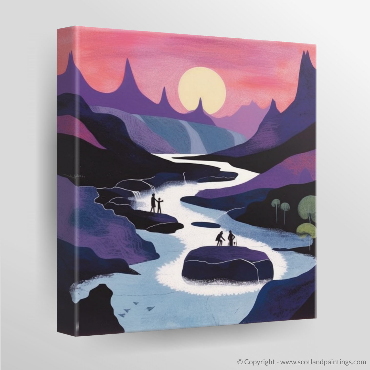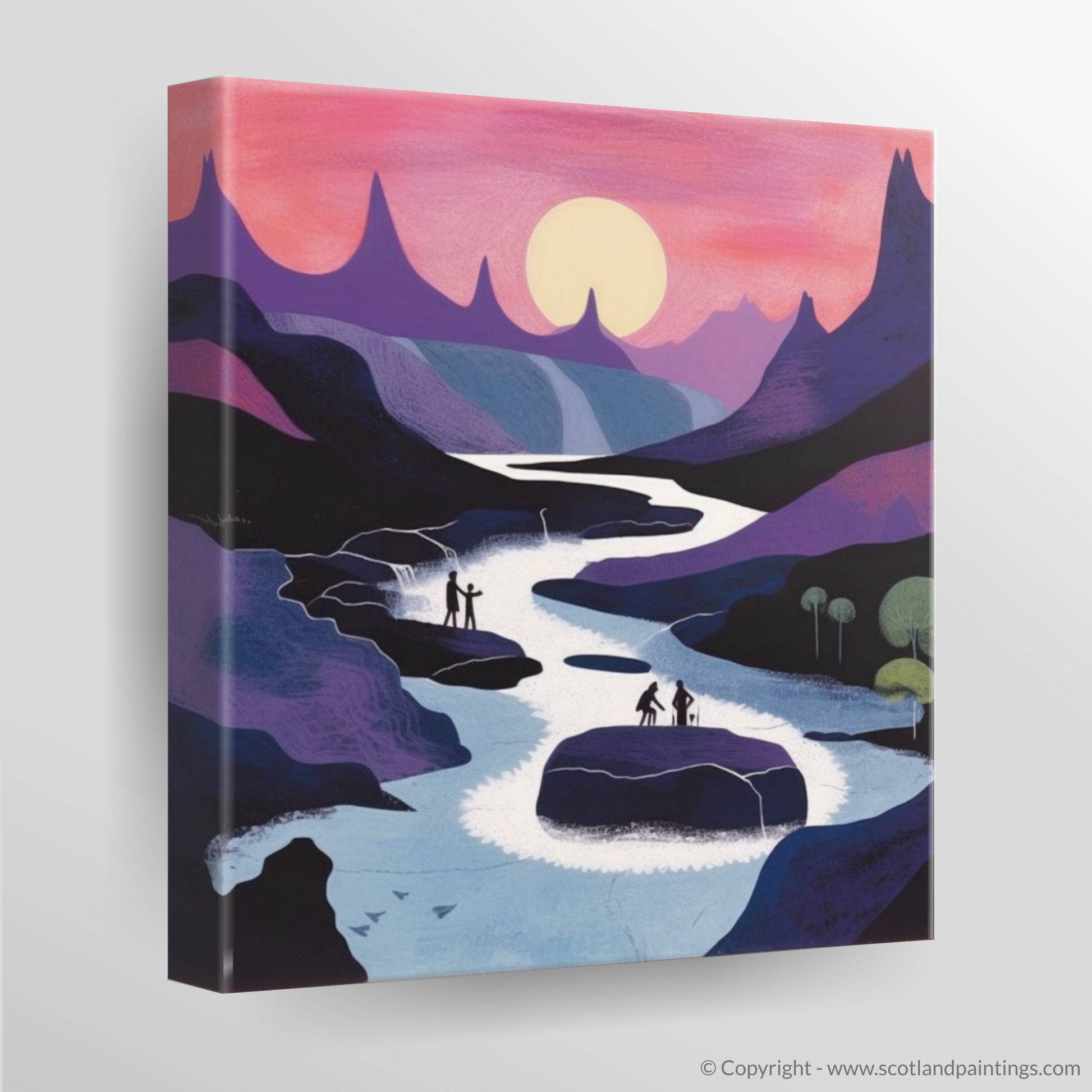 This art piece brings to life the dusky hues of twilight at the Fairy Pools, where undulating hills cascade into glossy, mirror-like waters. Beholders of this print will find themselves transfixed by the striking contrast between the warm, glowing orb of a setting sun and the cool, mysterious tones of the surrounding landscape.