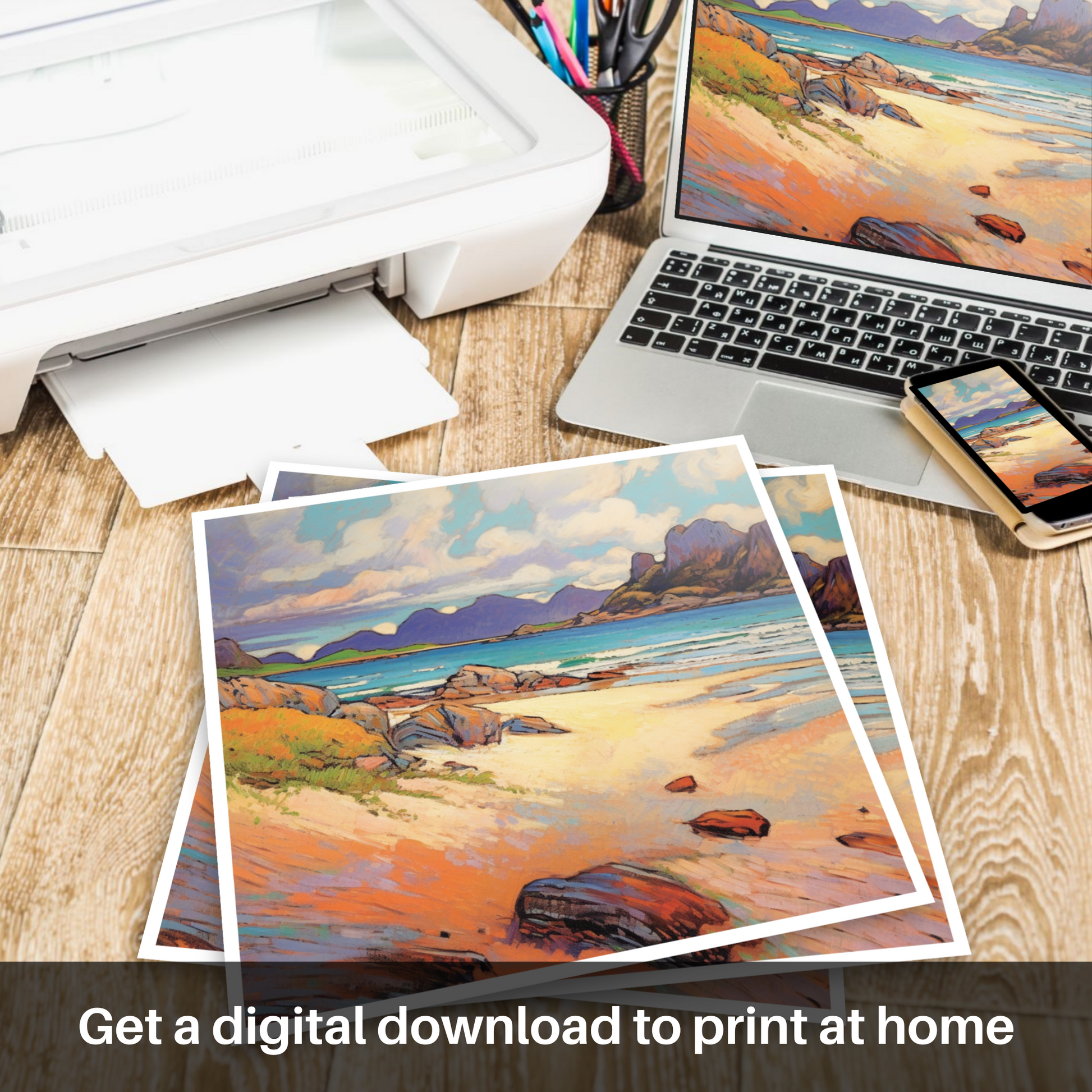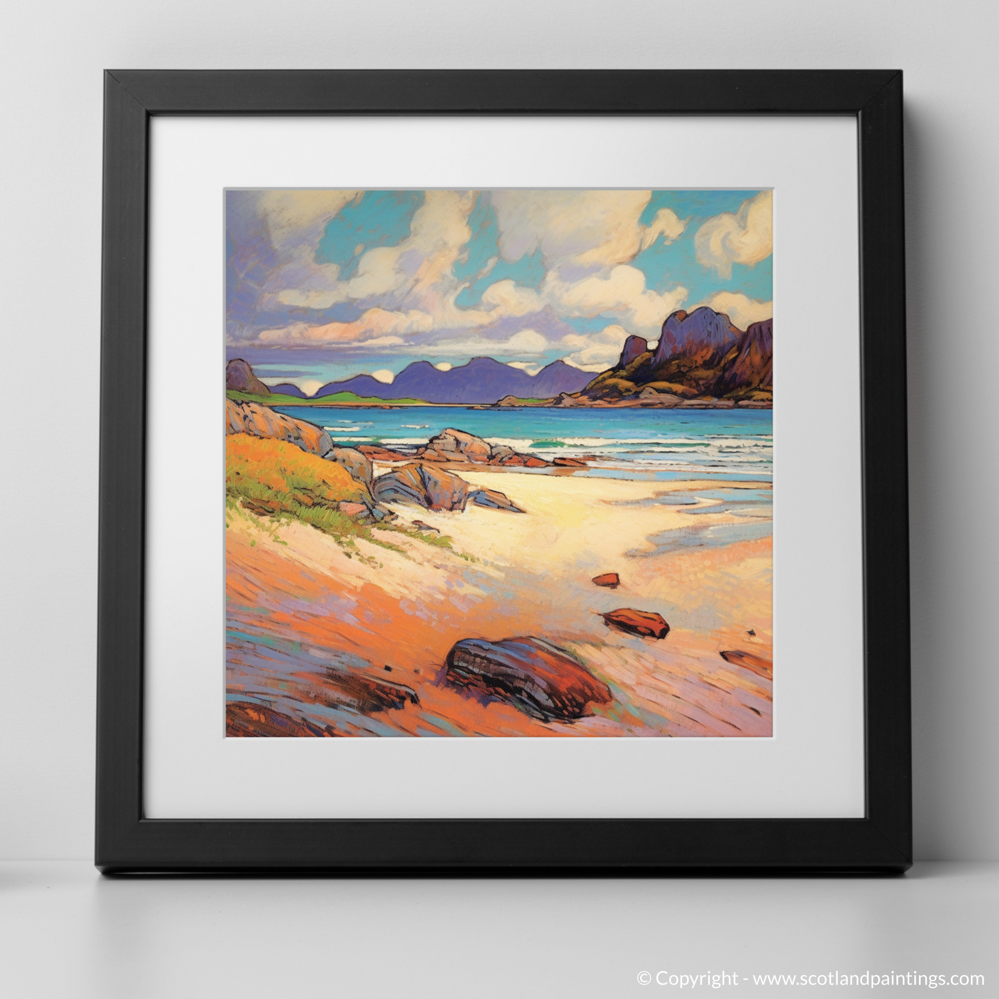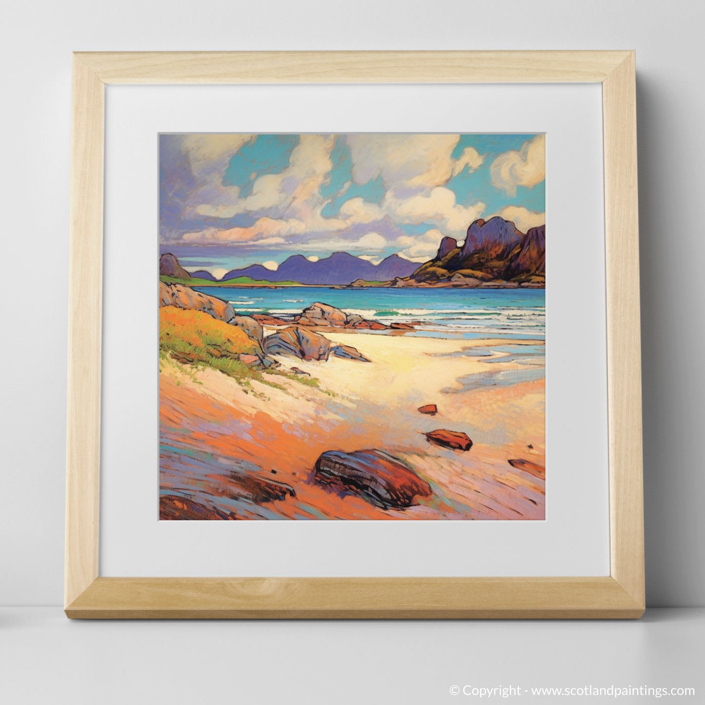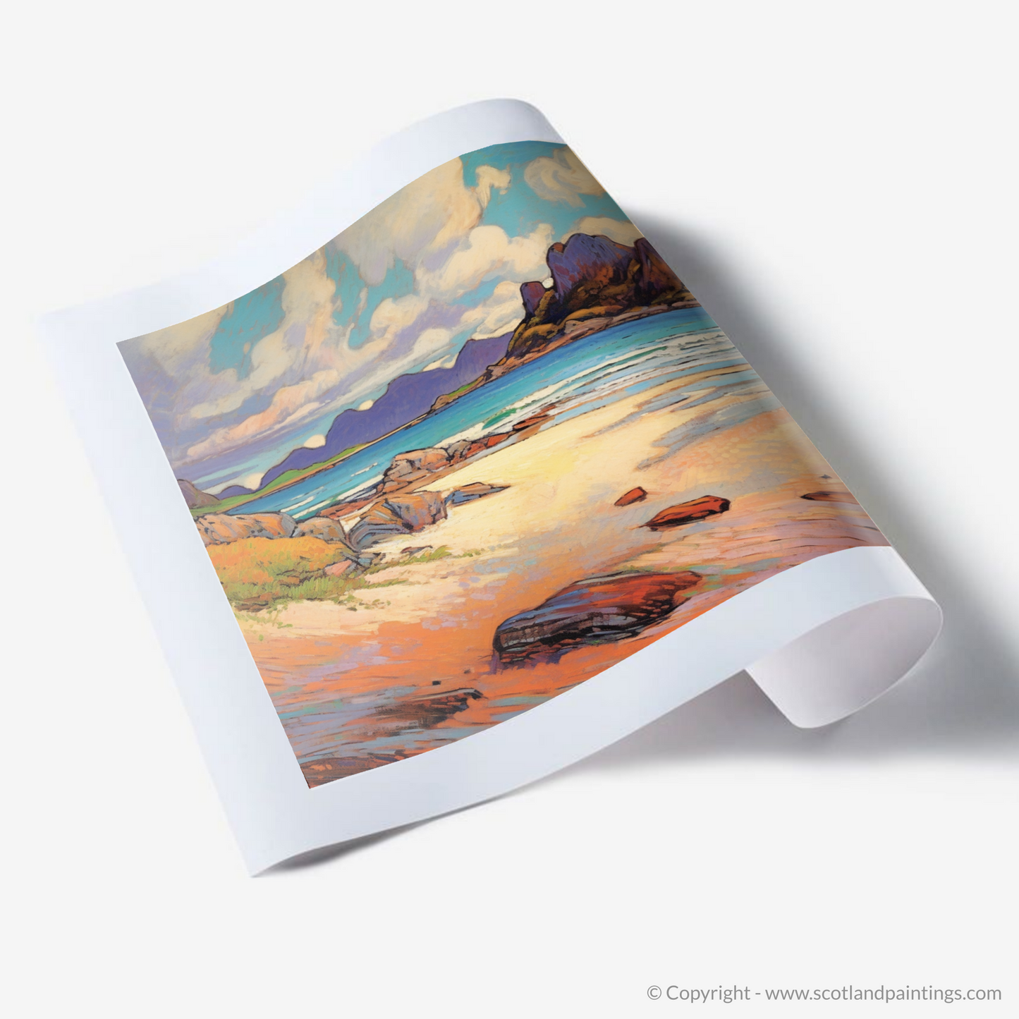 Capturing the ephemeral glow of the golden hour, this impressionistic print depicts the untamed beauty of Silver Sands of Morar. The artwork evokes a sense of tranquility, with the warm hues of the setting sun illuminating the landscape and reflecting off the shallow, crystalline waters. Brushstrokes merge harmoniously to craft a scene that is both vibrant and serene, drawing the viewer's eye to the soft, golden sands that give this beloved beach its name.
