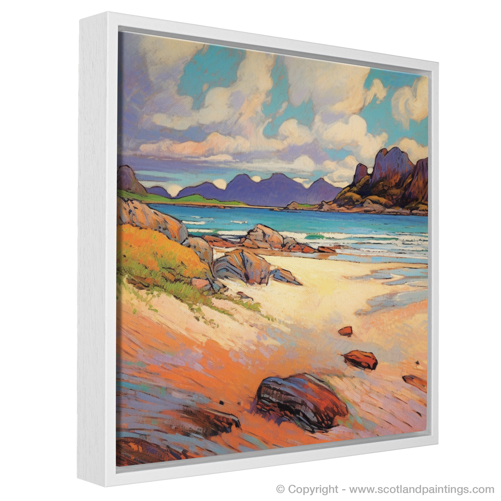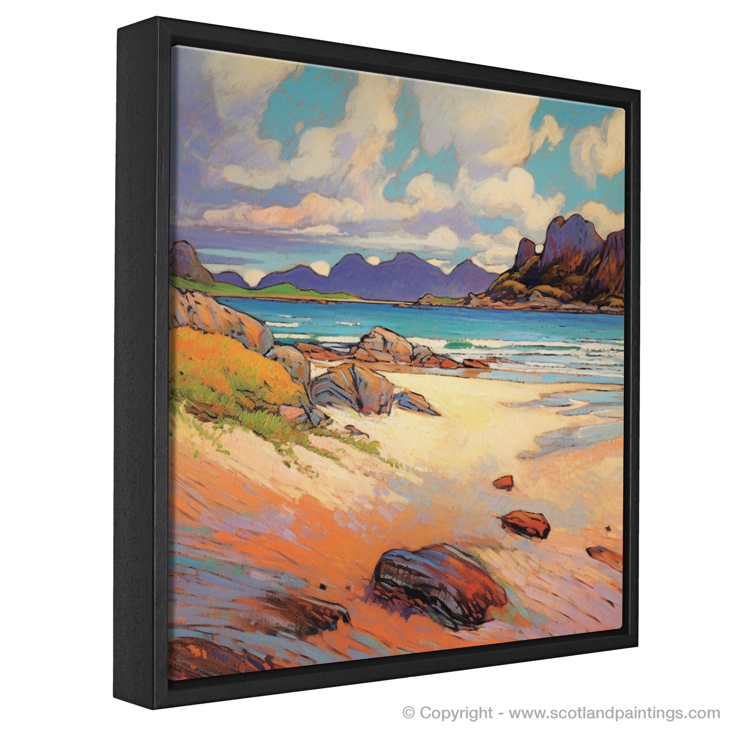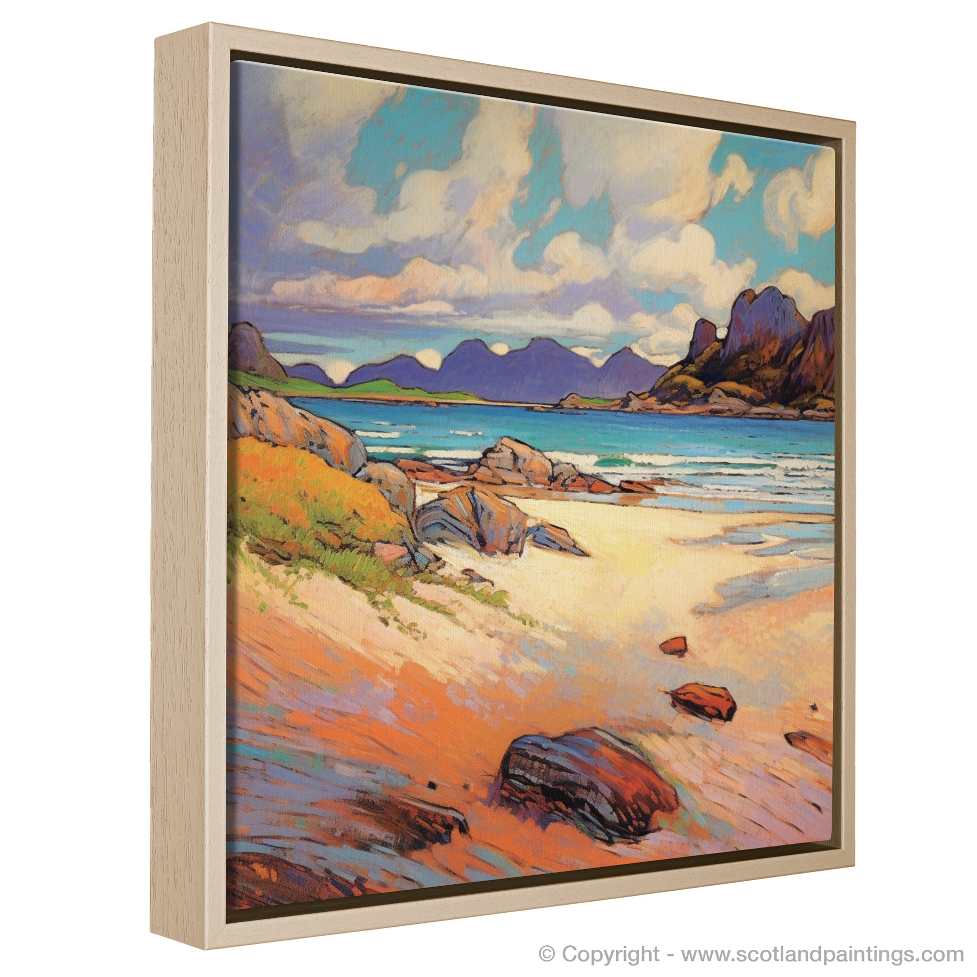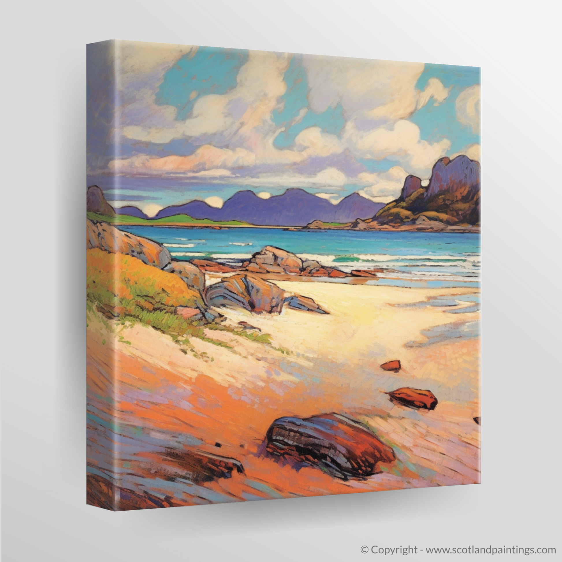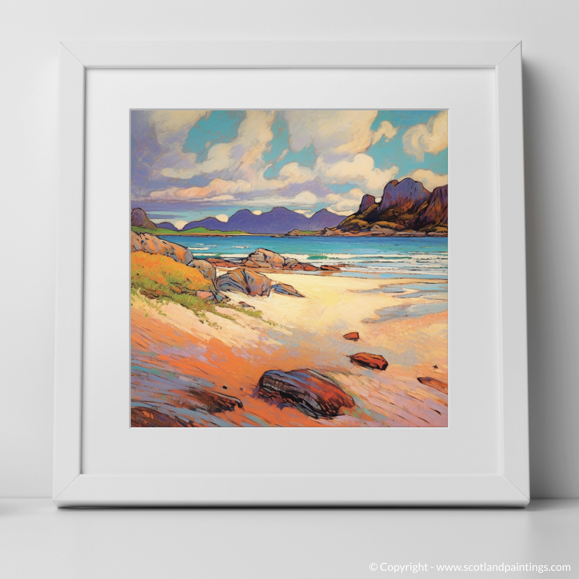 Capturing the ephemeral glow of the golden hour, this impressionistic print depicts the untamed beauty of Silver Sands of Morar. The artwork evokes a sense of tranquility, with the warm hues of the setting sun illuminating the landscape and reflecting off the shallow, crystalline waters. Brushstrokes merge harmoniously to craft a scene that is both vibrant and serene, drawing the viewer's eye to the soft, golden sands that give this beloved beach its name.