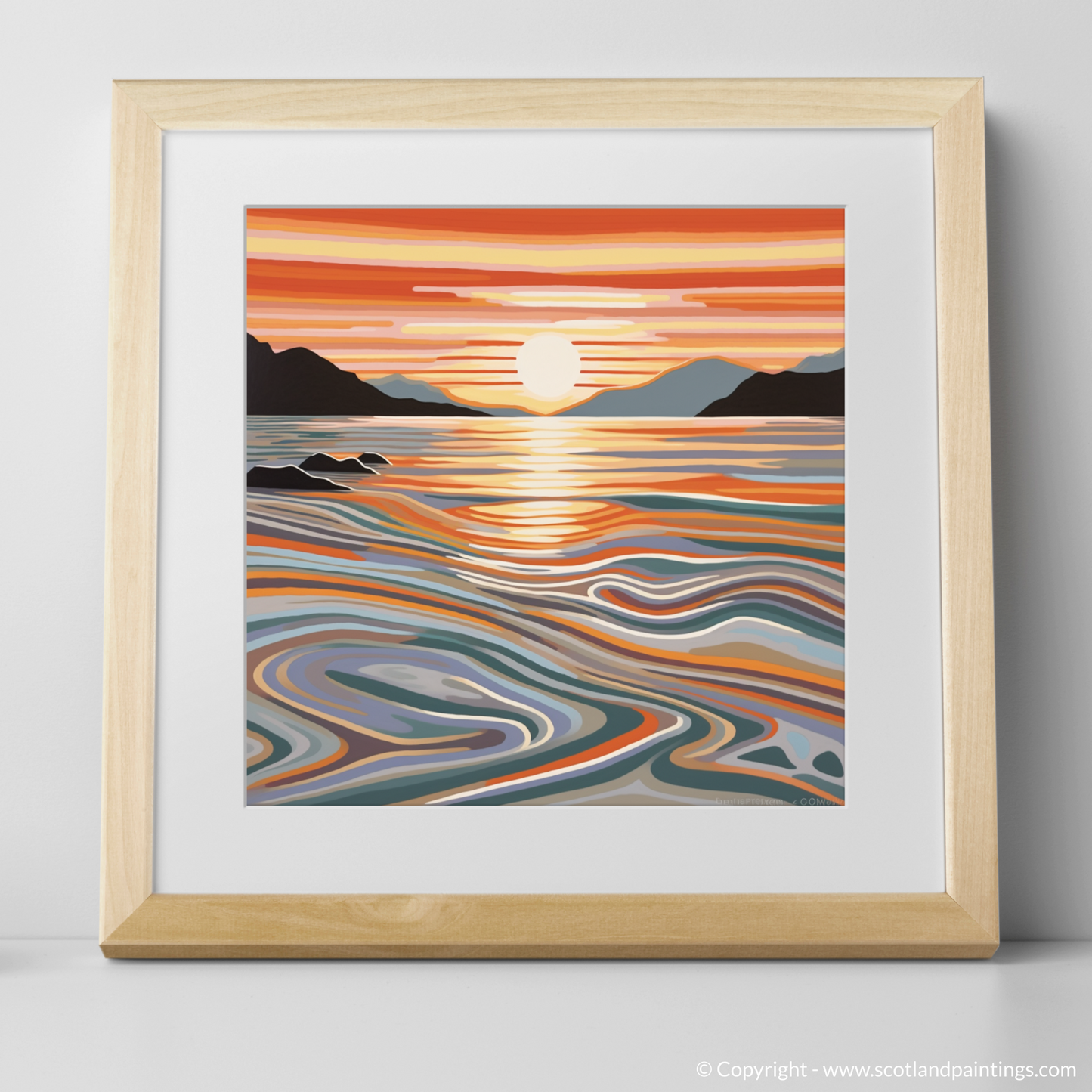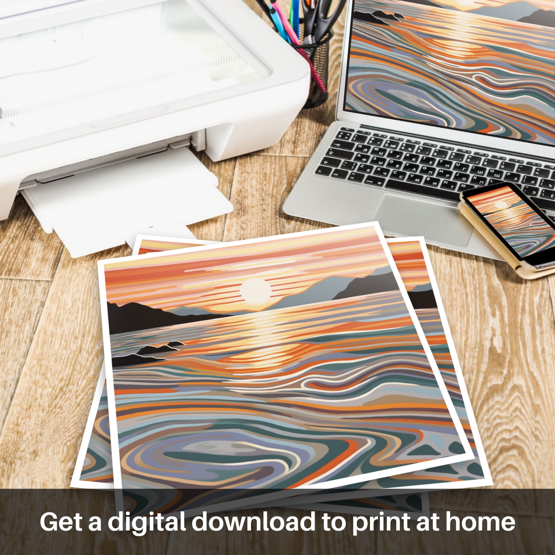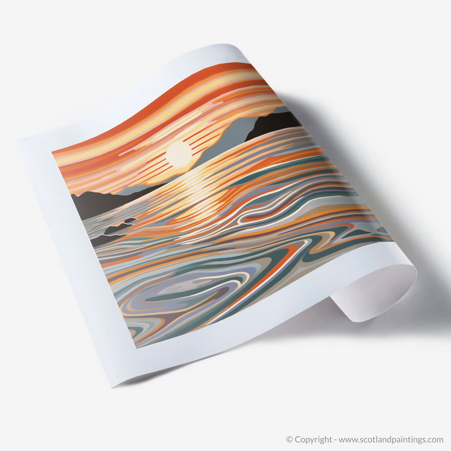 As the day comes to a close, the tranquil beauty of the Silver Sands of Morar is captured in this enthralling abstract print, a celebration of the rugged charm of Scottish beaches. Swirls of colour dance across the canvas, creating a visual symphony that mirrors the fluidity of the sea and the warmth of the sinking sun. The vivid hues of orange, red, and yellow in the sky contrast with the cooler tones of the sea, offering a spectacle of nature's palette at the magic hour of twilight.