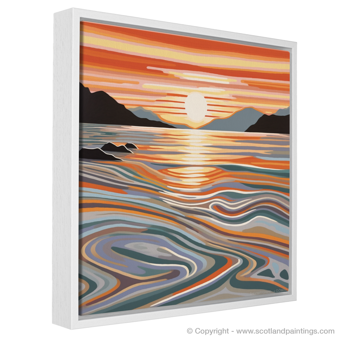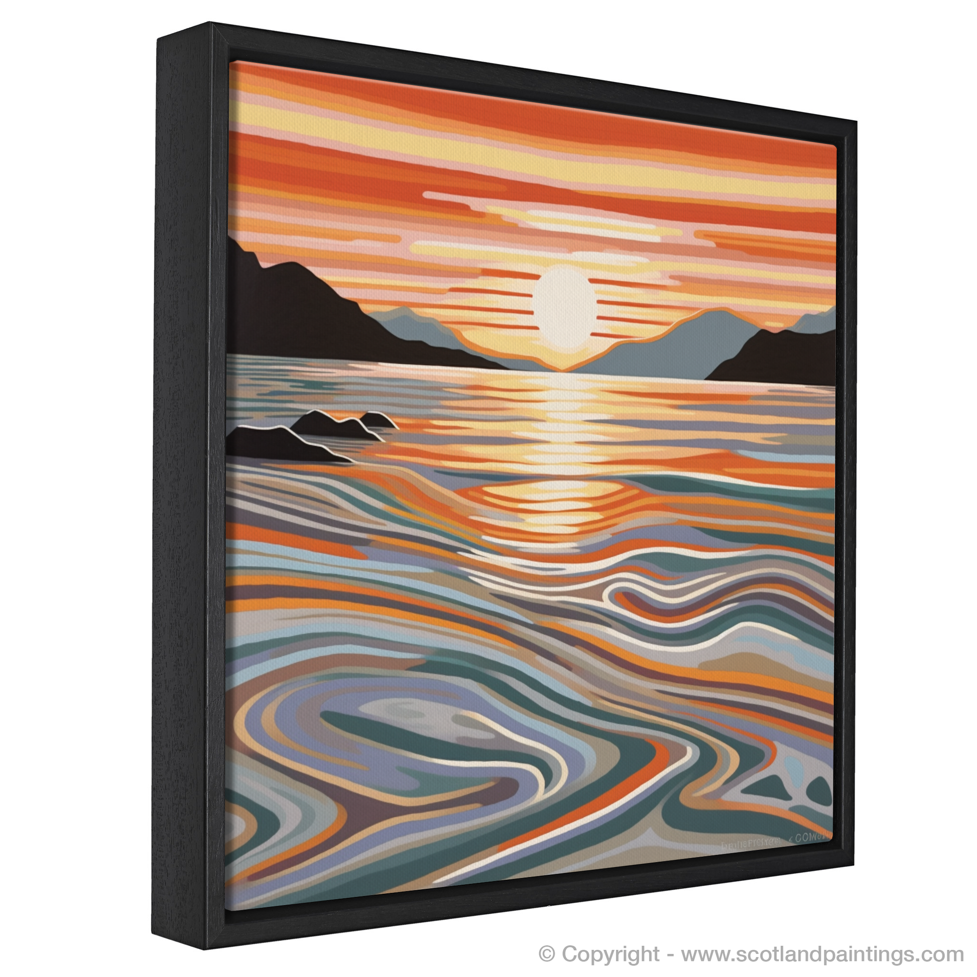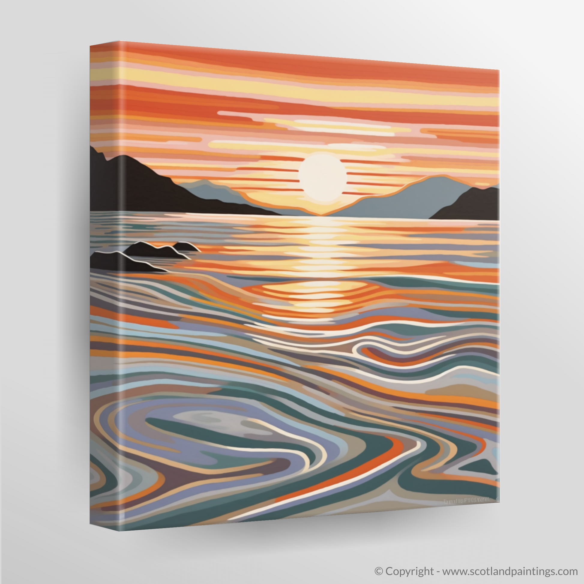 As the day comes to a close, the tranquil beauty of the Silver Sands of Morar is captured in this enthralling abstract print, a celebration of the rugged charm of Scottish beaches. Swirls of colour dance across the canvas, creating a visual symphony that mirrors the fluidity of the sea and the warmth of the sinking sun. The vivid hues of orange, red, and yellow in the sky contrast with the cooler tones of the sea, offering a spectacle of nature's palette at the magic hour of twilight.