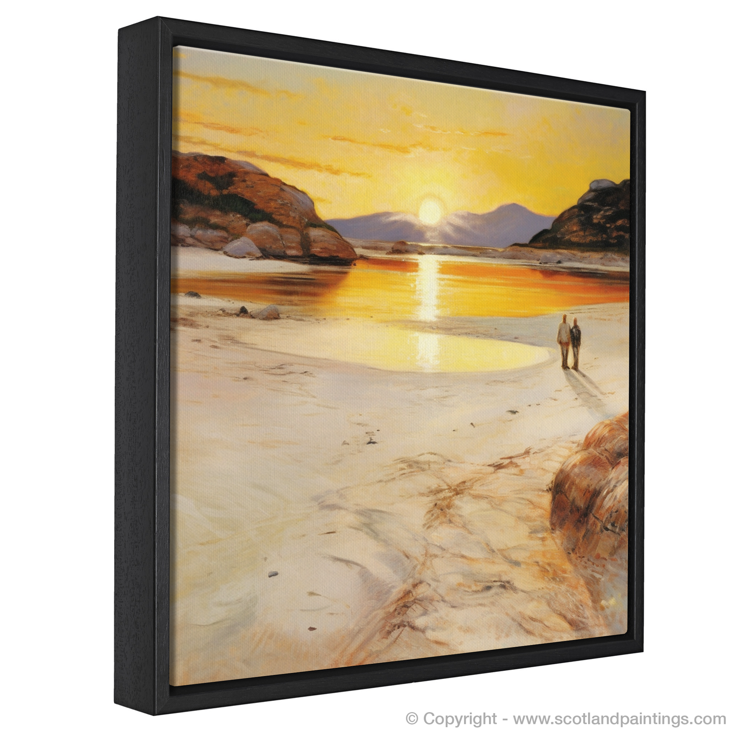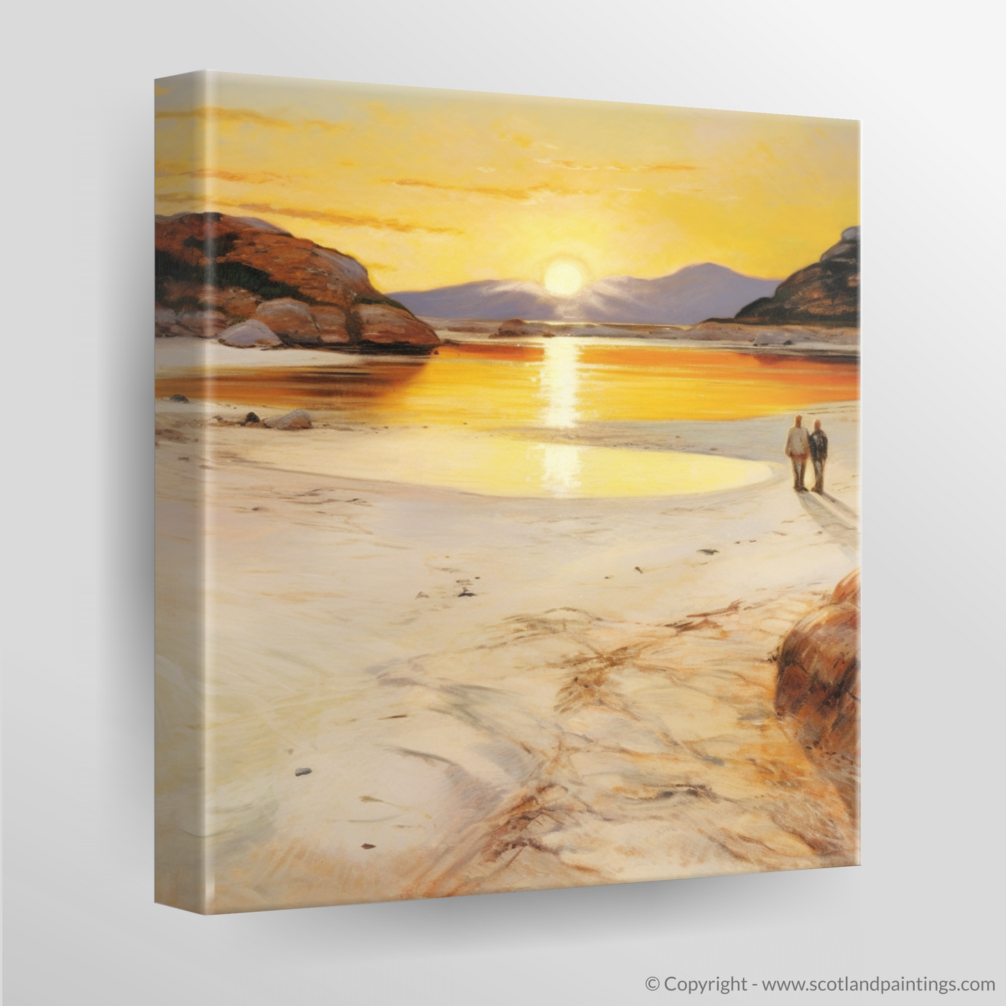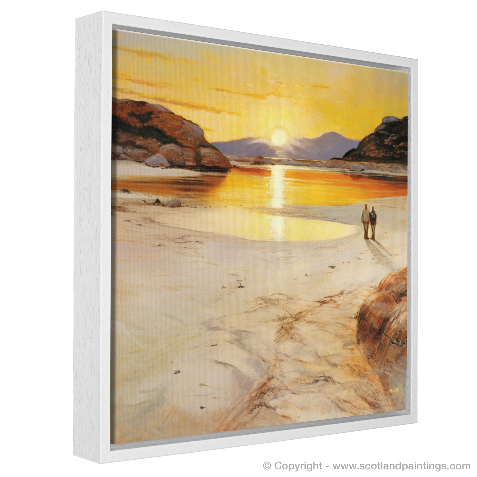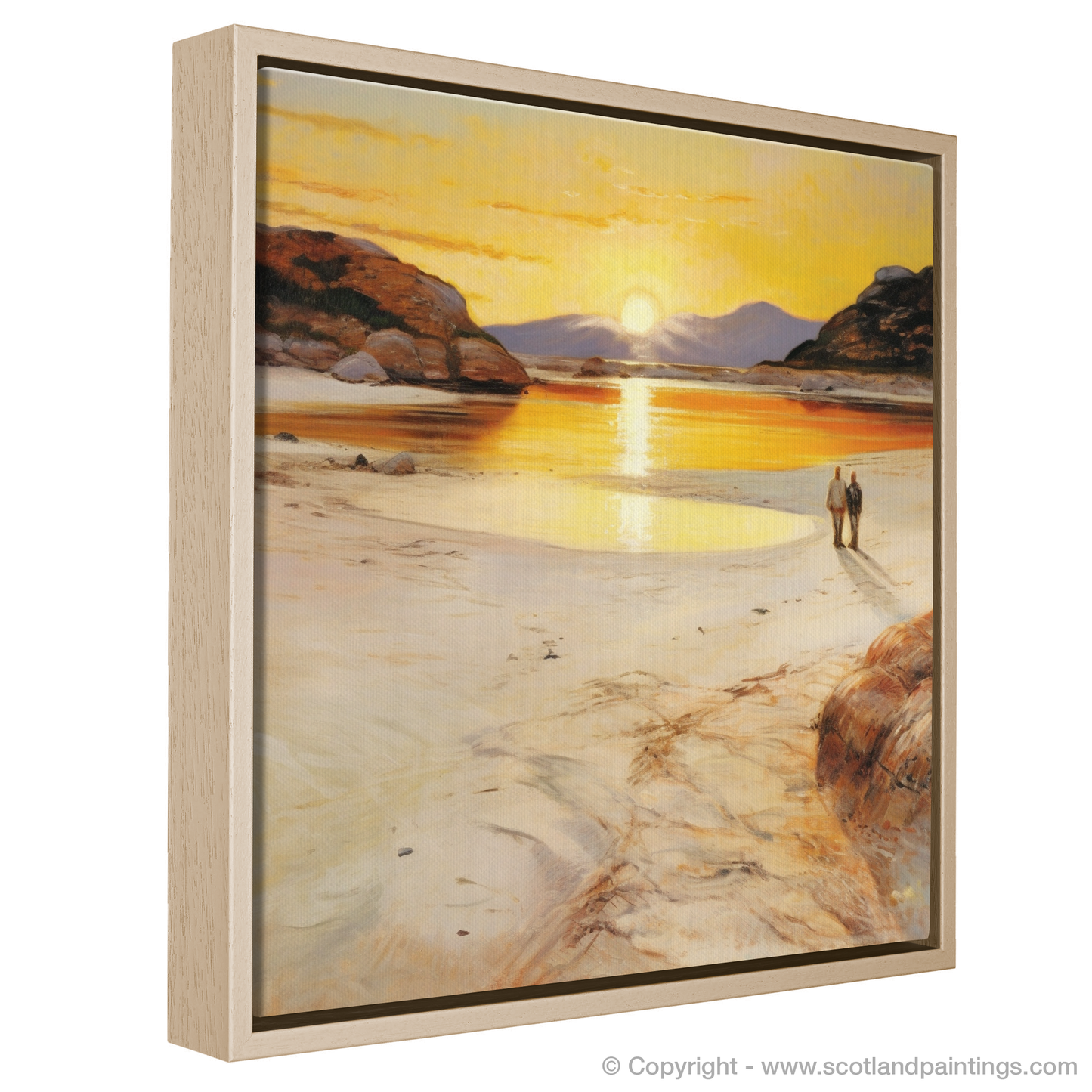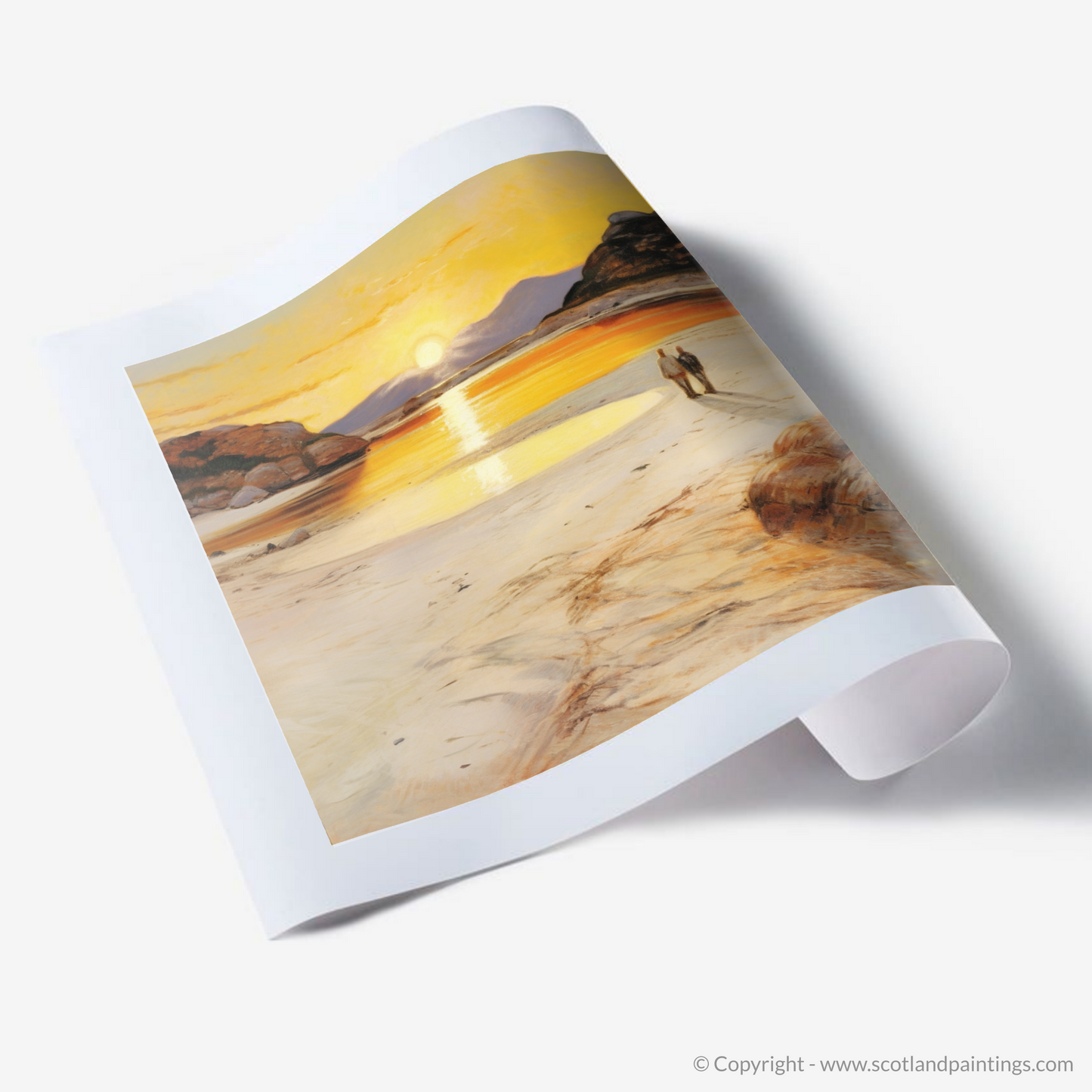 As the sun dips towards the horizon, bathing the world in a warm golden light, the Silver Sands of Morar come to life in this enchanting print from our 'Scottish Beaches' collection. Evocative of the Impressionist style, this piece captures the serene beauty of twilight on Scotland's coast, with ephemeral brushstrokes that convey the transient moment of day's end.