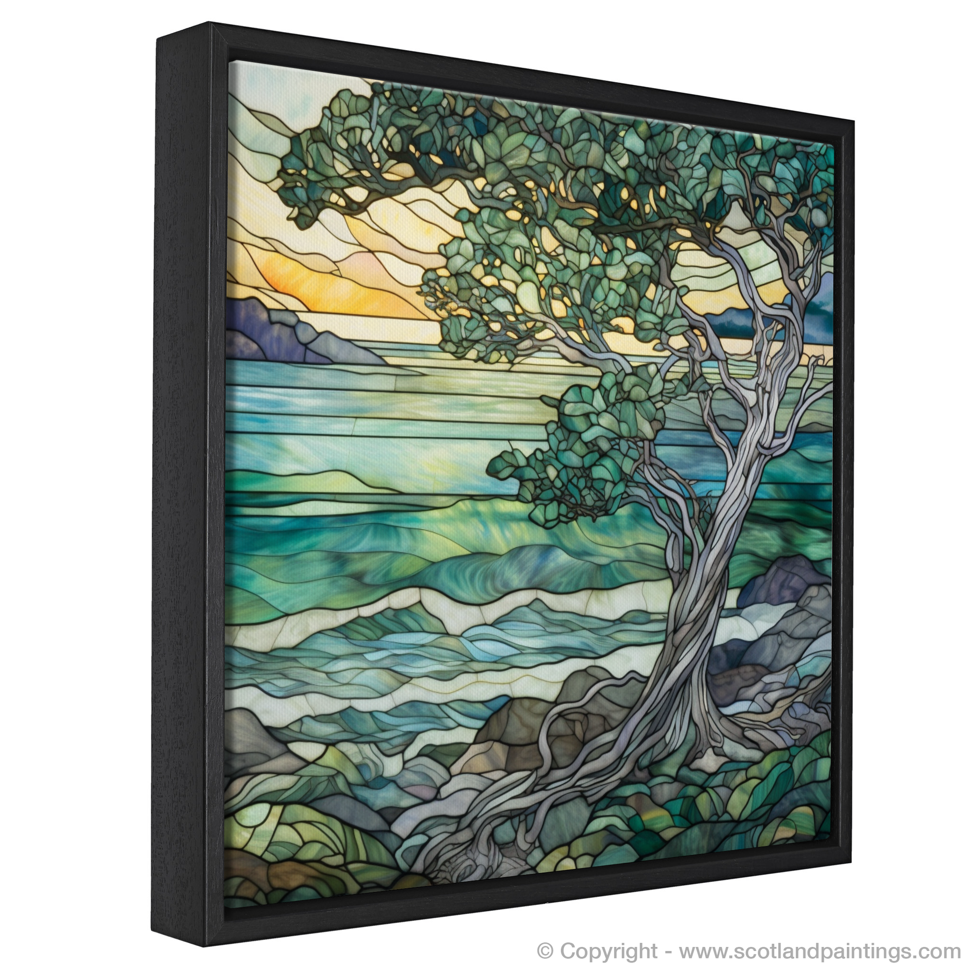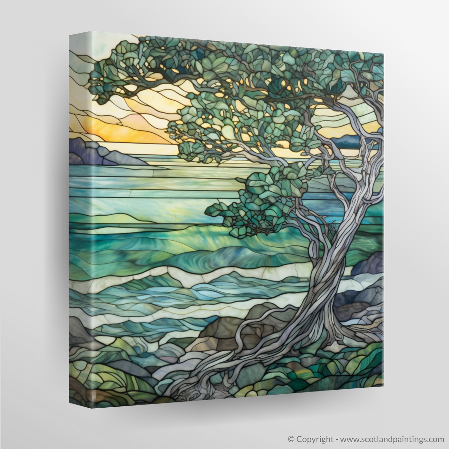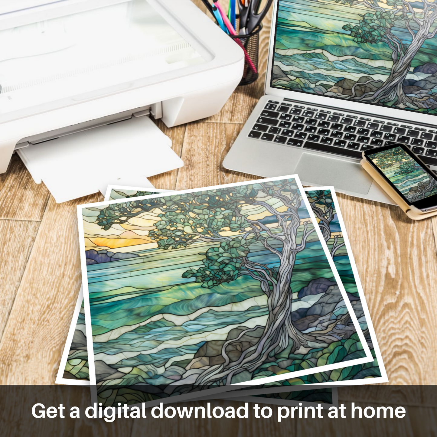 Beneath this sentinel-like tree, the waters glisten in a symphony of blue and turquoise, with the gentle undulations suggesting a serene and rhythmic movement. The overlapping tones create a sense of depth and tranquility, inviting the viewer's gaze to wander into the distance where the sea meets the golden sunset.