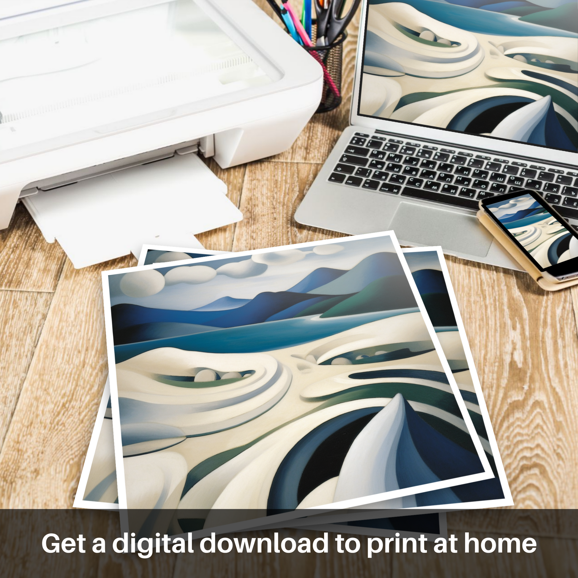 Stark contrasts are fluidly married with the gentle undulations of the landscape; the sinuous shapes meander gracefully, drawing the eye along the natural crescendos and diminuendos of the terrain. Towering peaks rise in the distance, stylised in deep, verdant hues, their silhouetted forms against the sky creating a harmonious contrast.