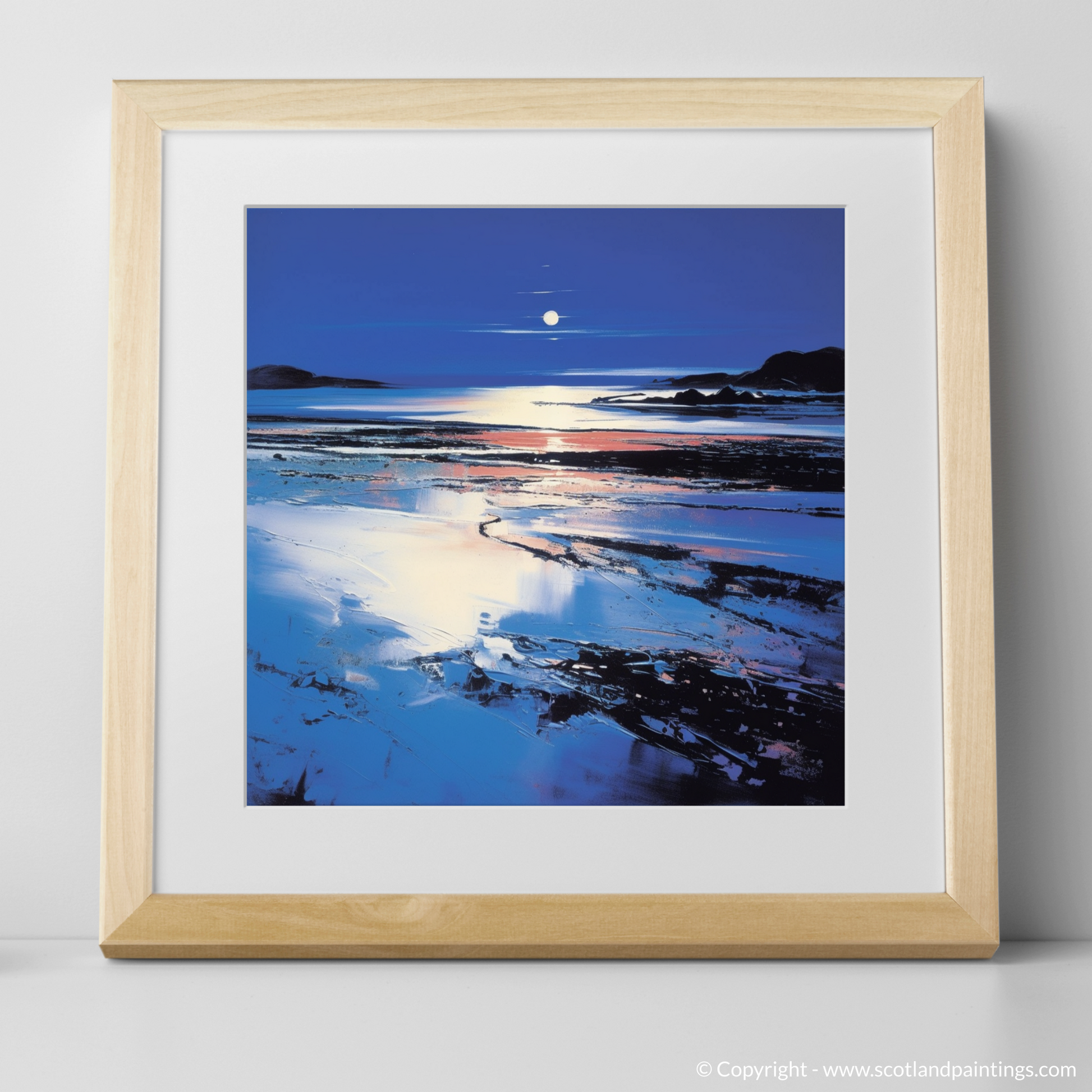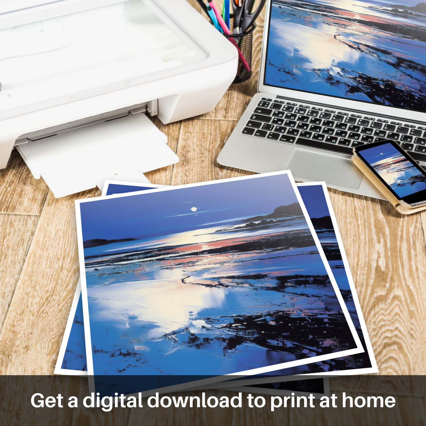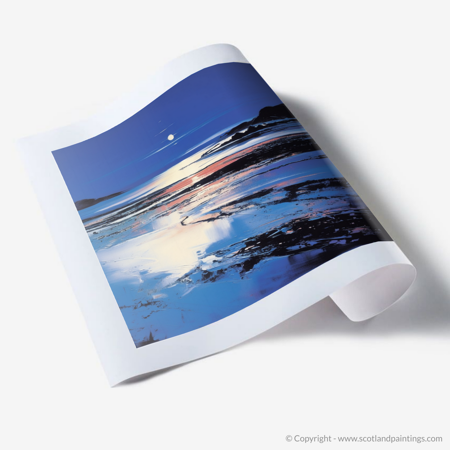 Embrace the ethereal glow of Scottish dusk with this captivating print, a visual ode to the Silver Sands of Morar. In this abstract expressionist piece, the artist masterfully captures the serene and fleeting moments of twilight as it kisses the rugged, scenic coastline. Shades of sapphire and midnight blue dominate the upper expanses, suggesting the vast and deepening sky as daylight wanes, punctuated by a luminous full moon that casts a serene light across the scene.