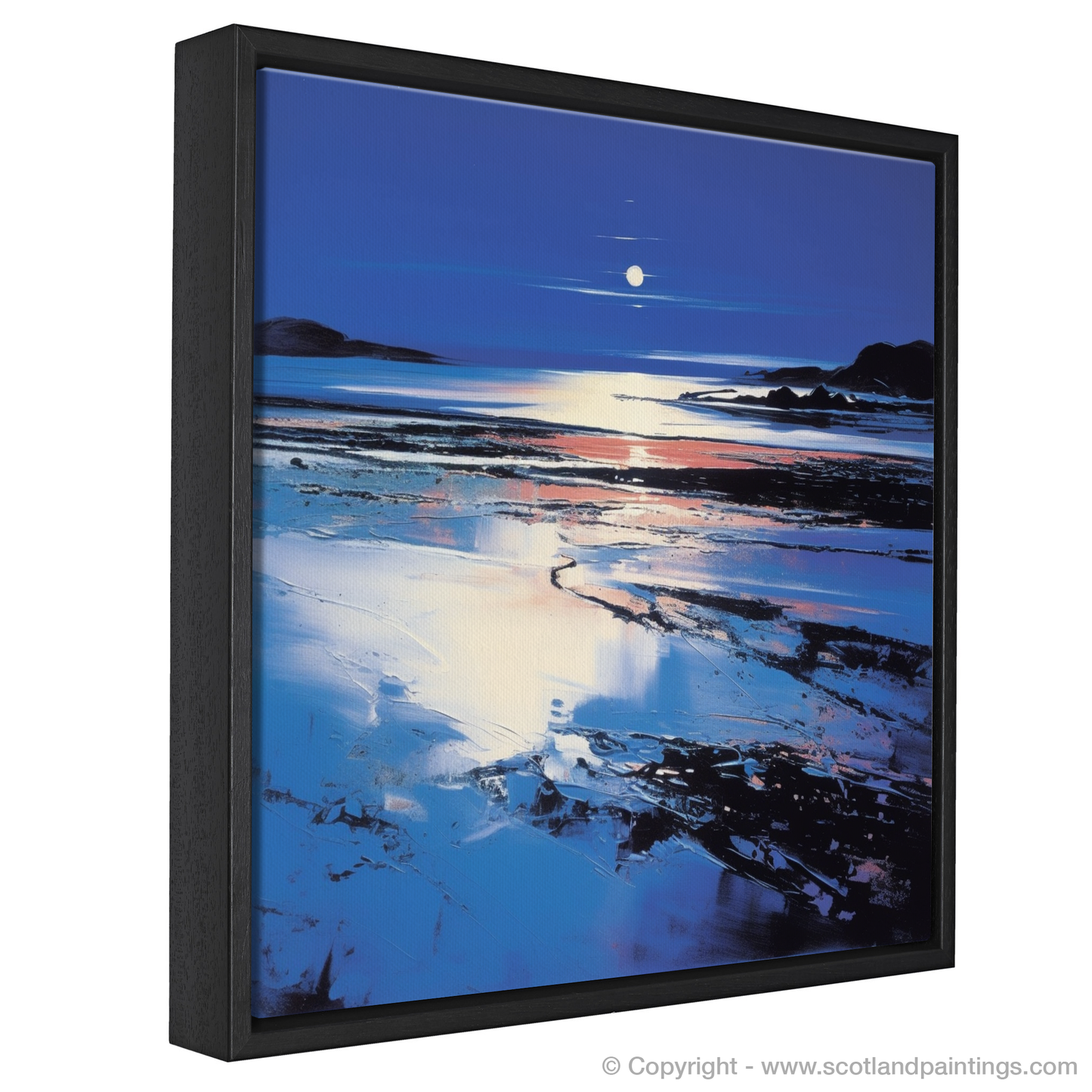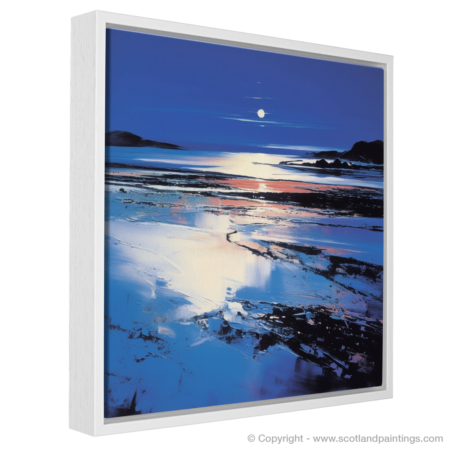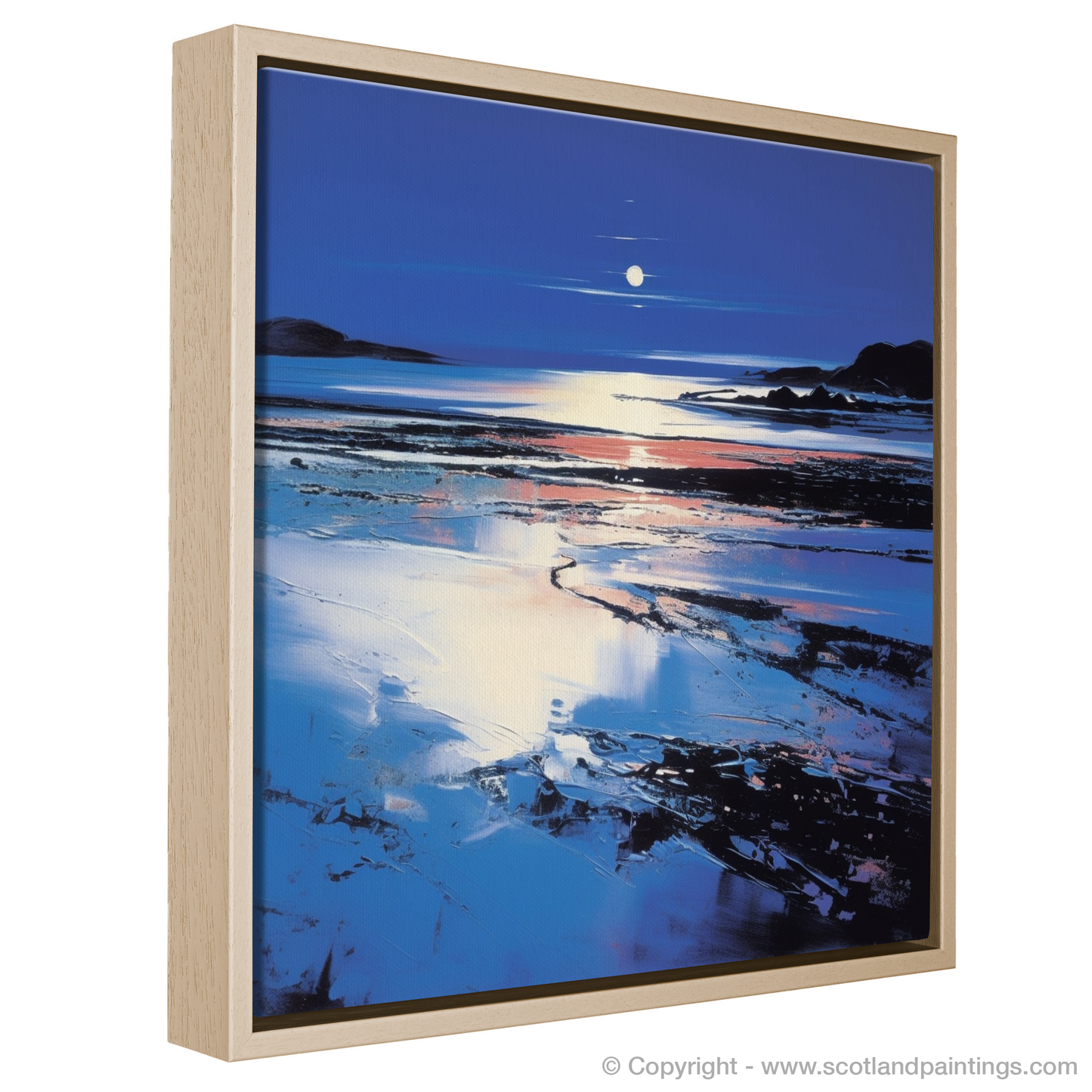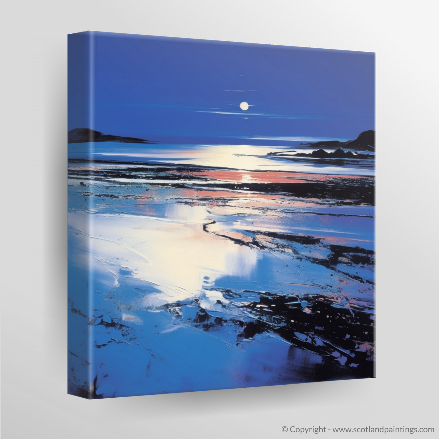Embrace the ethereal glow of Scottish dusk with this captivating print, a visual ode to the Silver Sands of Morar. In this abstract expressionist piece, the artist masterfully captures the serene and fleeting moments of twilight as it kisses the rugged, scenic coastline. Shades of sapphire and midnight blue dominate the upper expanses, suggesting the vast and deepening sky as daylight wanes, punctuated by a luminous full moon that casts a serene light across the scene.