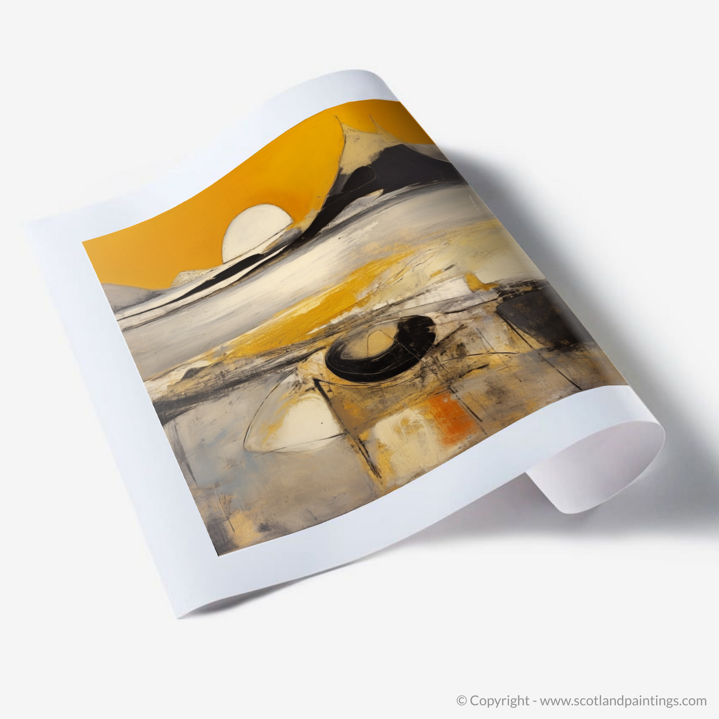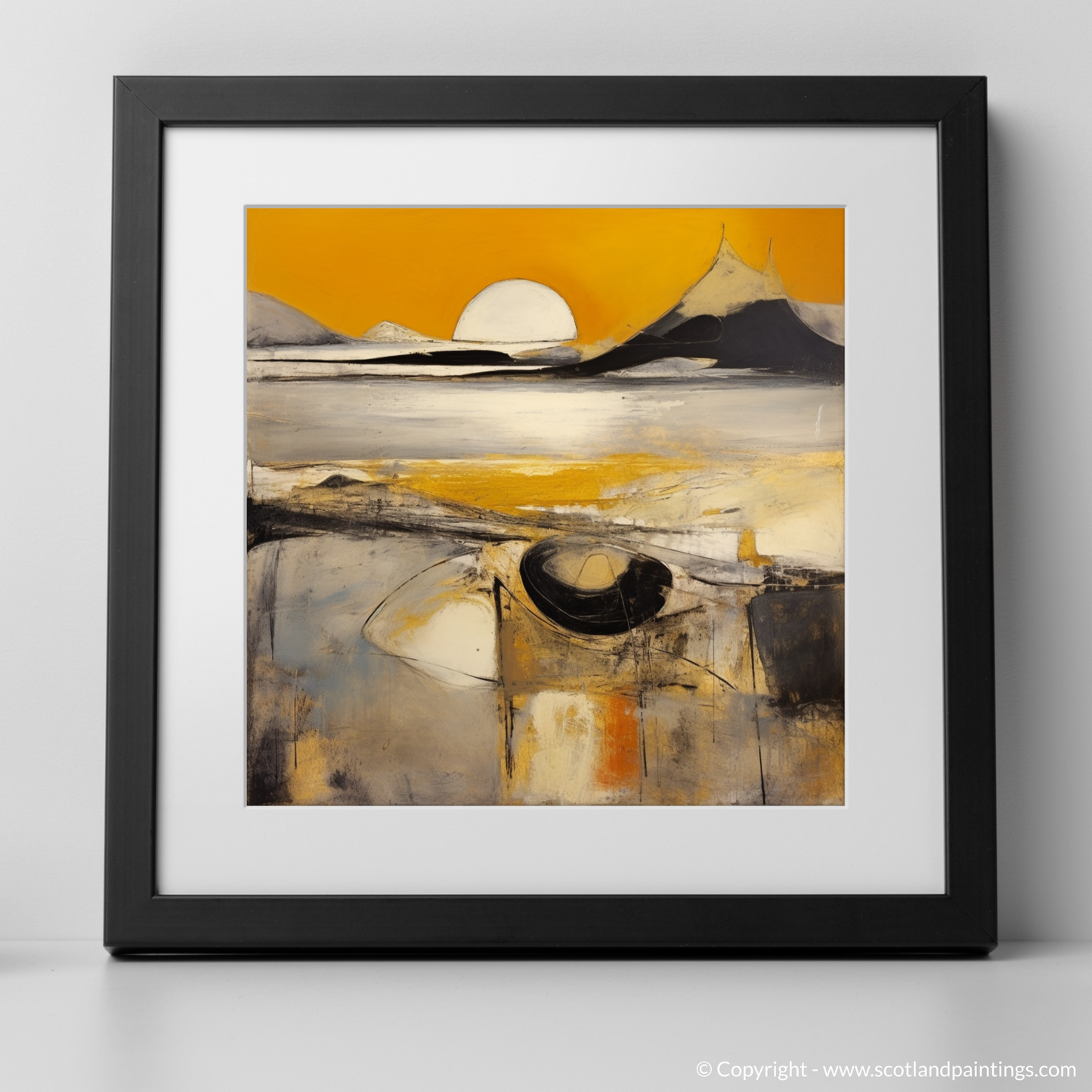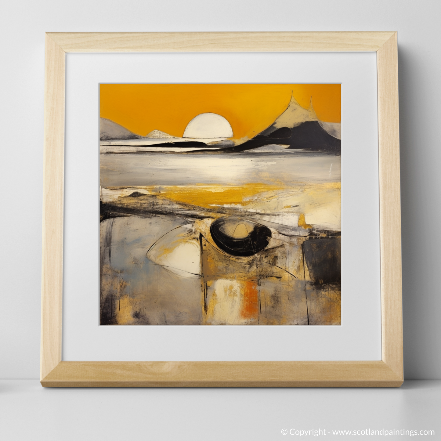 Capturing the ephemeral beauty of the Silver Sands of Morar at golden hour, this evocative print transports the viewer to a realm where colour and form merge in a dance of abstract expression. Bold strokes of white and yellow suggest the glimmering sands, set against a backdrop of dramatic peaks that appear to pierce the horizon. A large, orb-like sun hovers at the centre, emanating a serene, golden radiance mirrored in the tranquil waters below.