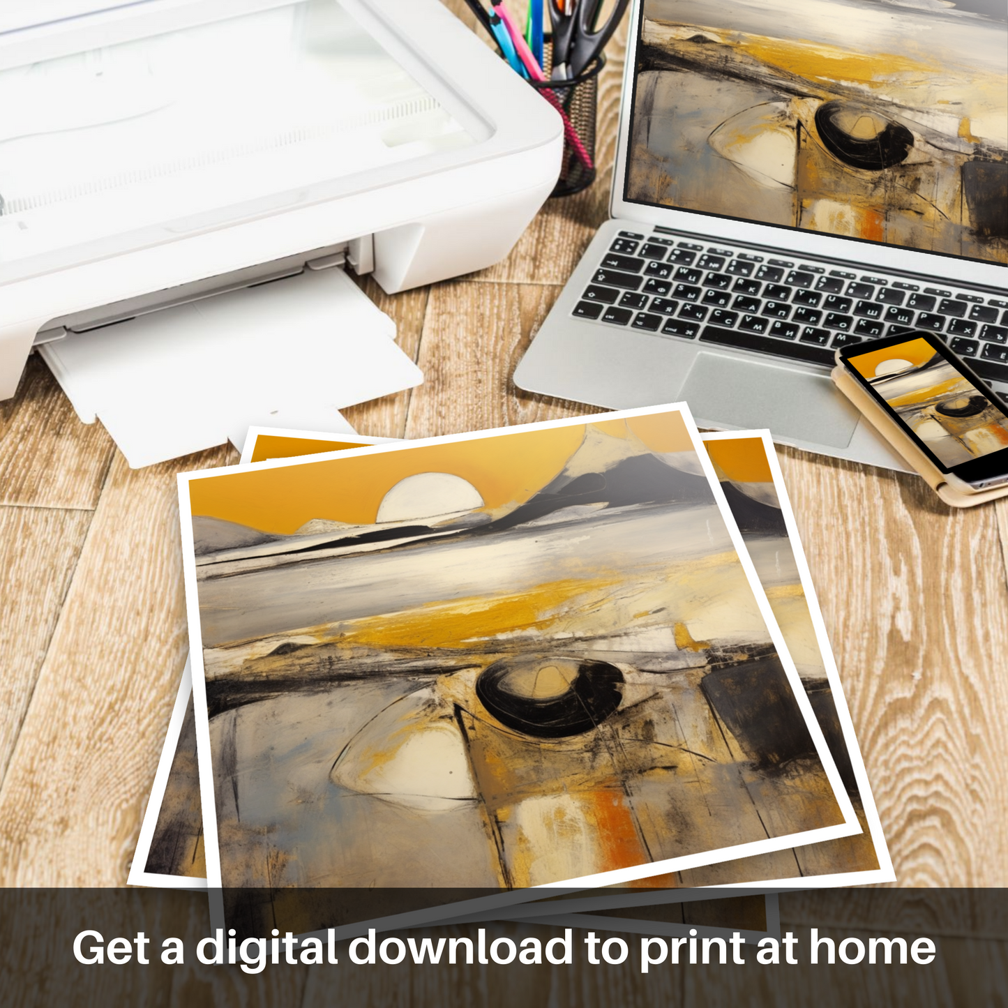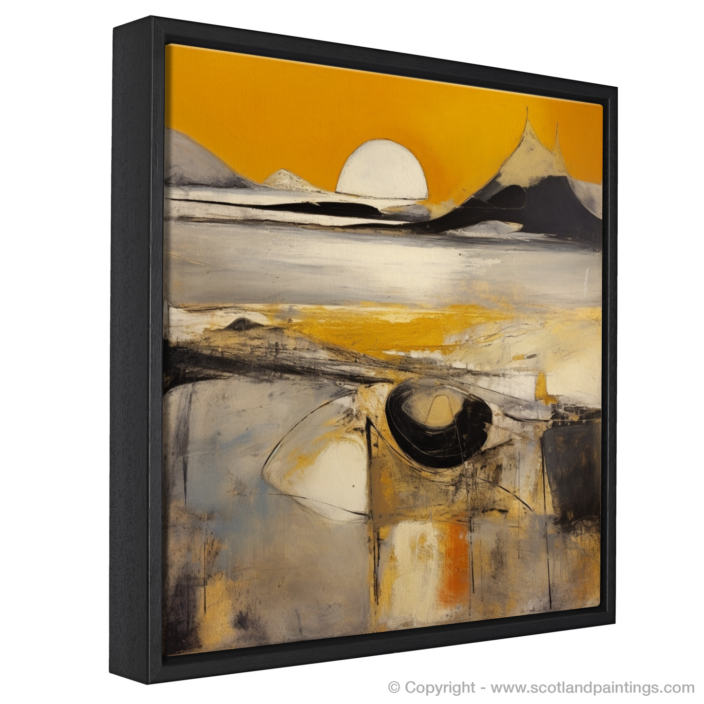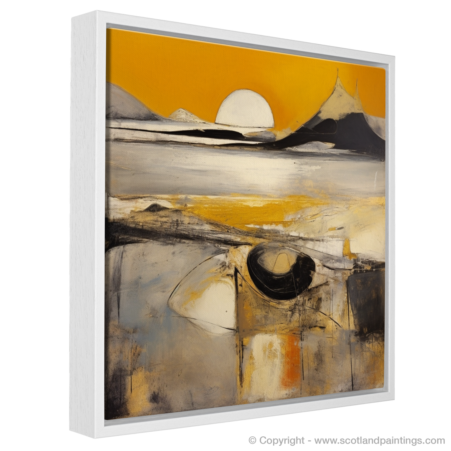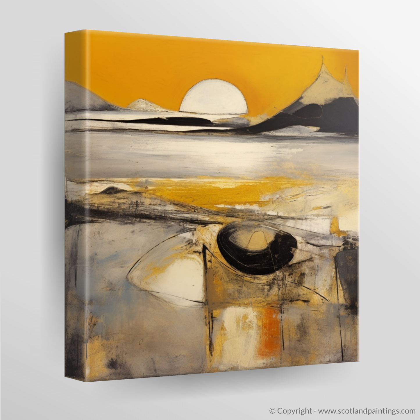 Capturing the ephemeral beauty of the Silver Sands of Morar at golden hour, this evocative print transports the viewer to a realm where colour and form merge in a dance of abstract expression. Bold strokes of white and yellow suggest the glimmering sands, set against a backdrop of dramatic peaks that appear to pierce the horizon. A large, orb-like sun hovers at the centre, emanating a serene, golden radiance mirrored in the tranquil waters below.
