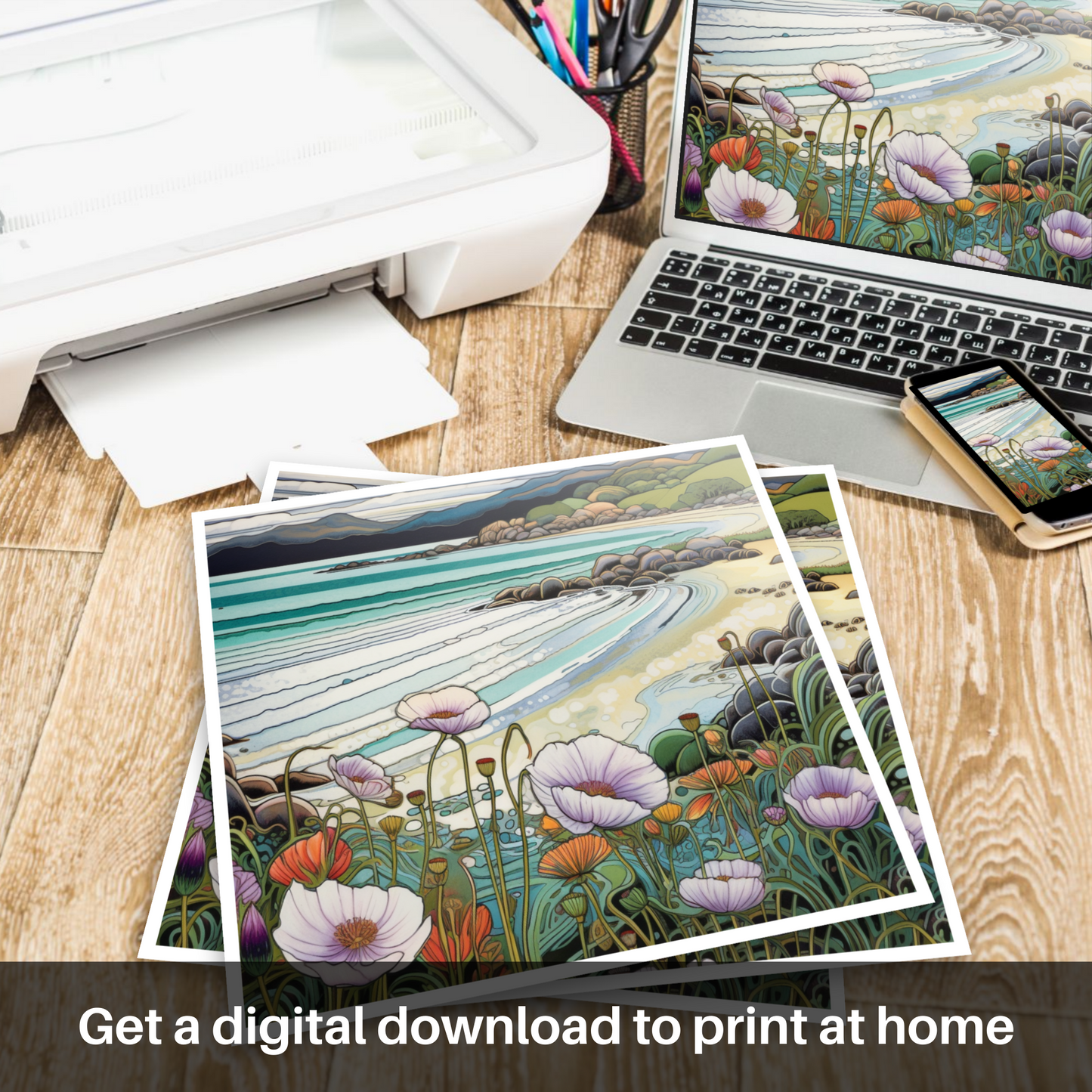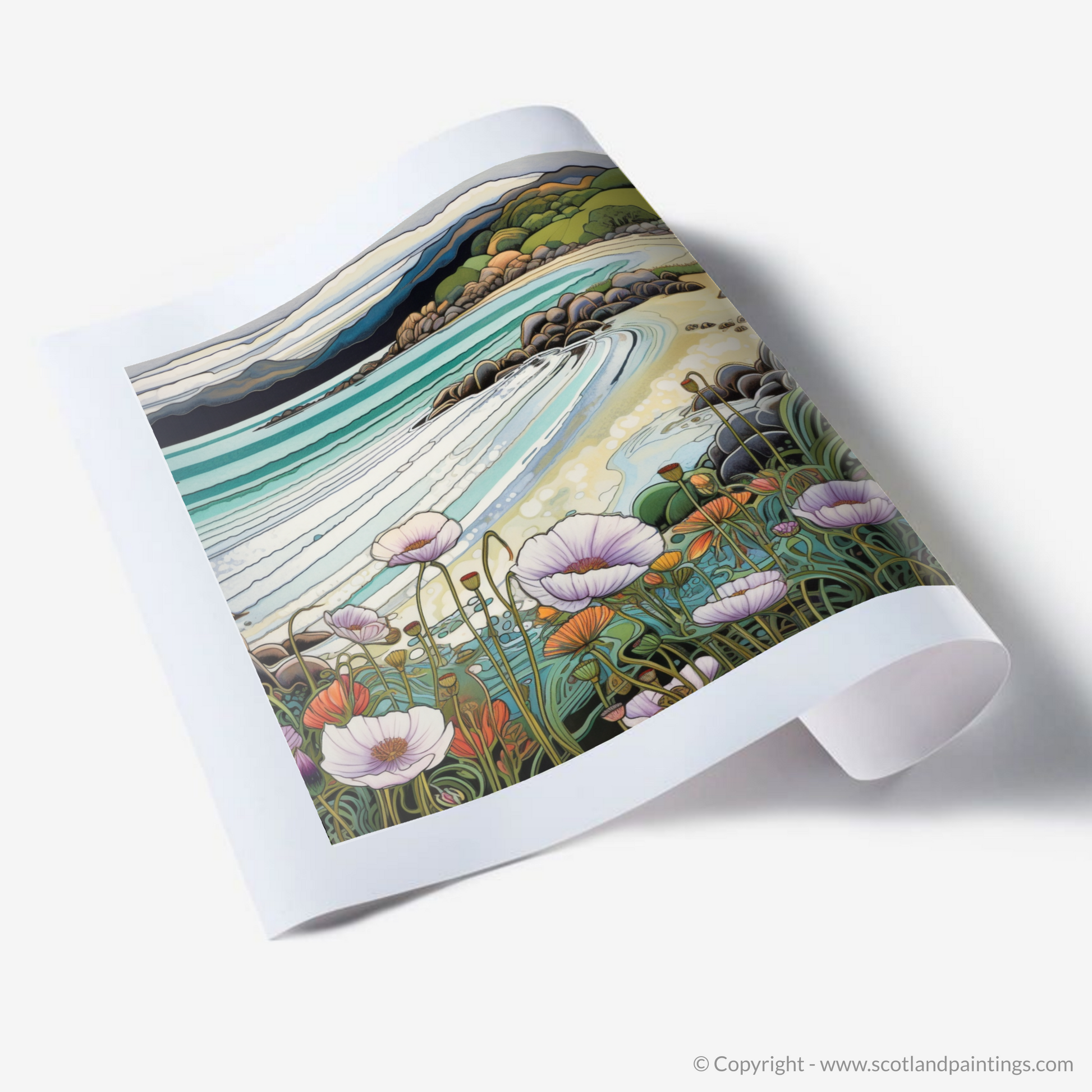 As if emerging from a dream of the Scottish coast, this exquisite print captures the serene beauty of the Silver Sands of Morar. The composition, reminiscent of the Art Nouveau era, boasts elegant curves and natural forms that seamlessly meld to showcase an almost ethereal representation of this beloved beach.