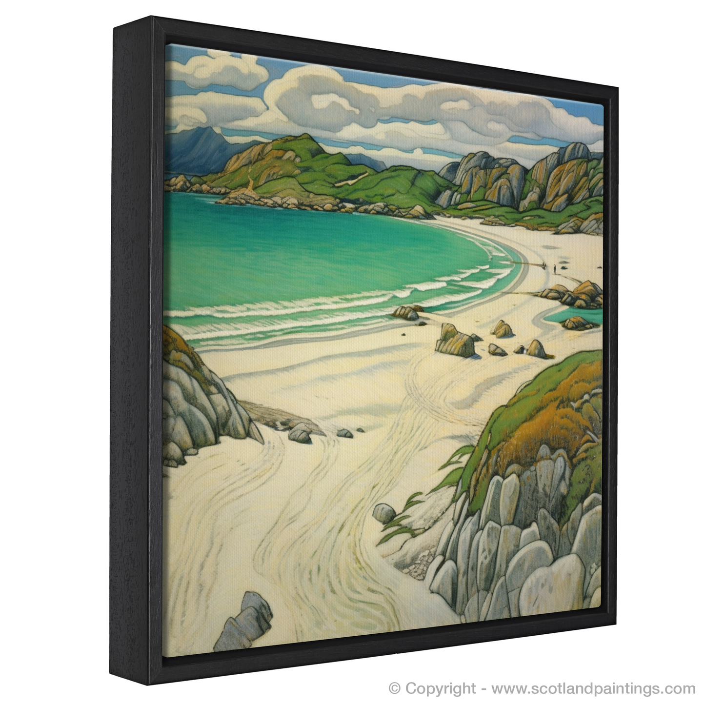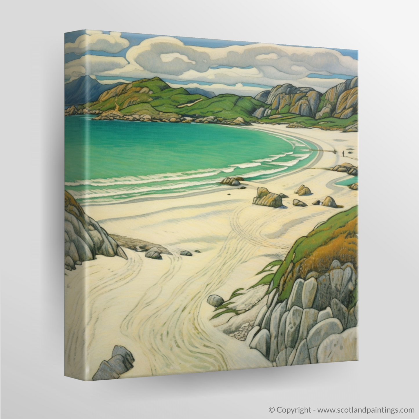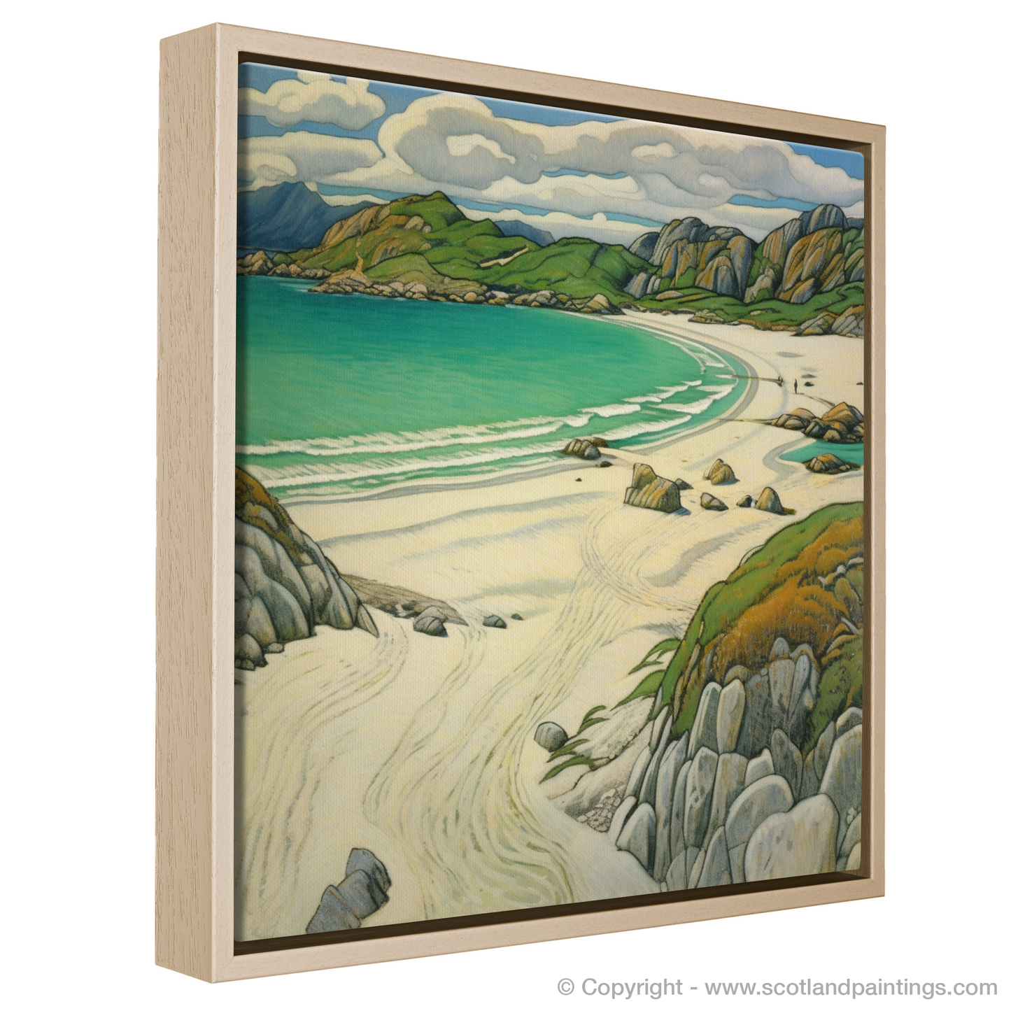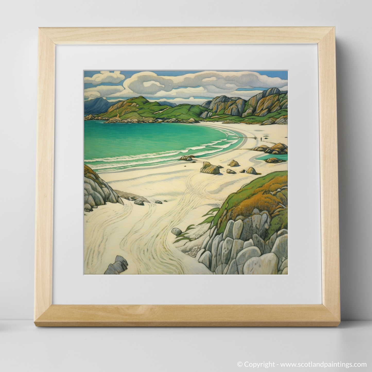 Embark on a visual journey to the serene shores of Scotland with this charming portrayal of the Silver Sands of Morar. With its roots in the Naive Art movement, the piece exudes a delightful simplicity and purity of vision that vividly captures the untouched beauty of this coastal gem.