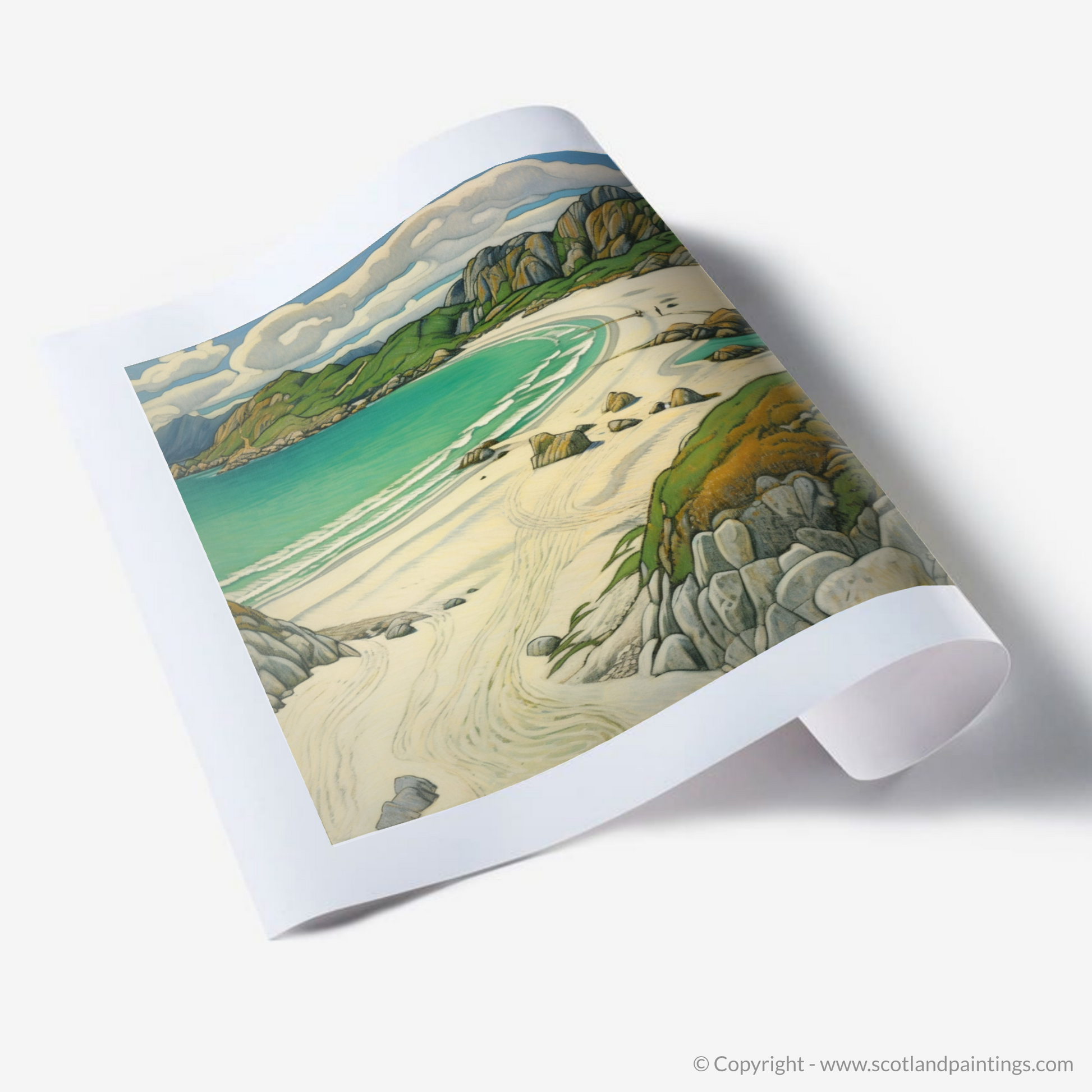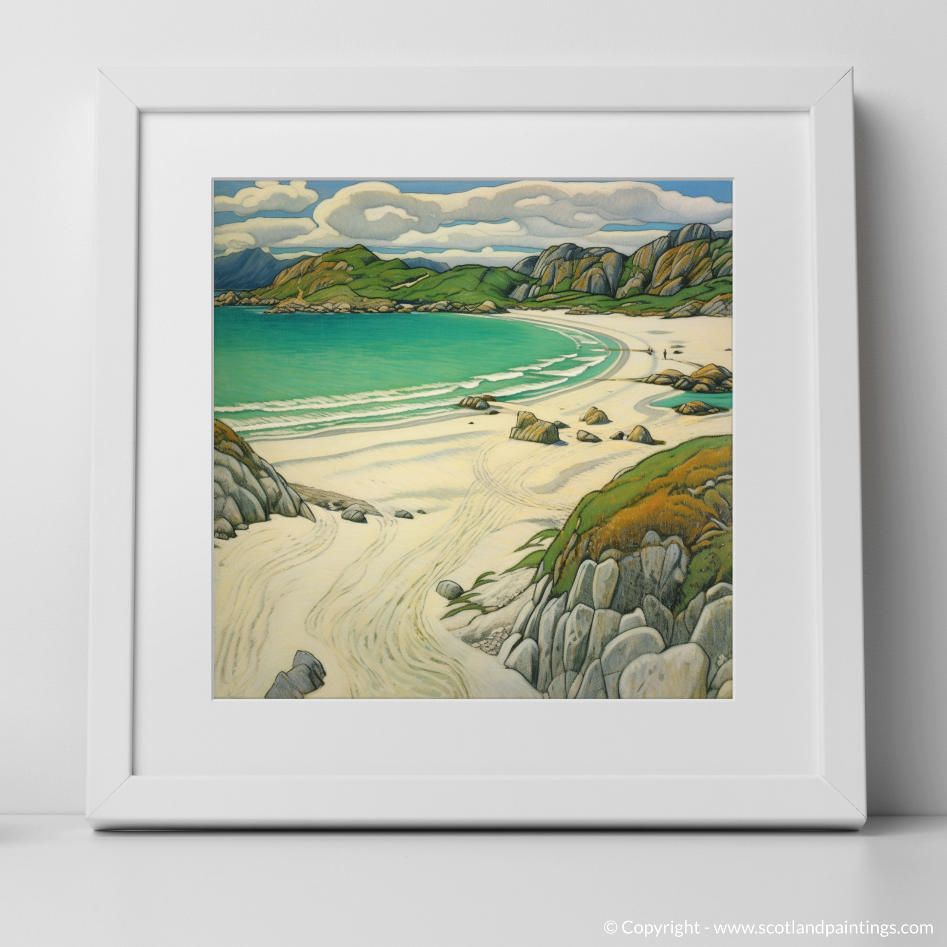 In this print, the viewer's eye is gently guided along the sweep of a pristine white sand beach, interrupted only by a playful scattering of smooth rocks and boulders. The water shimmers in various shades of turquoise and azure, evoking the calm and clear waters for which this part of Scotland is famed. As your gaze follows the undulating coastline, it curves around to reveal a distant group of figures, small and harmonious with the landscape, enjoying the sublime tranquillity of the beach.