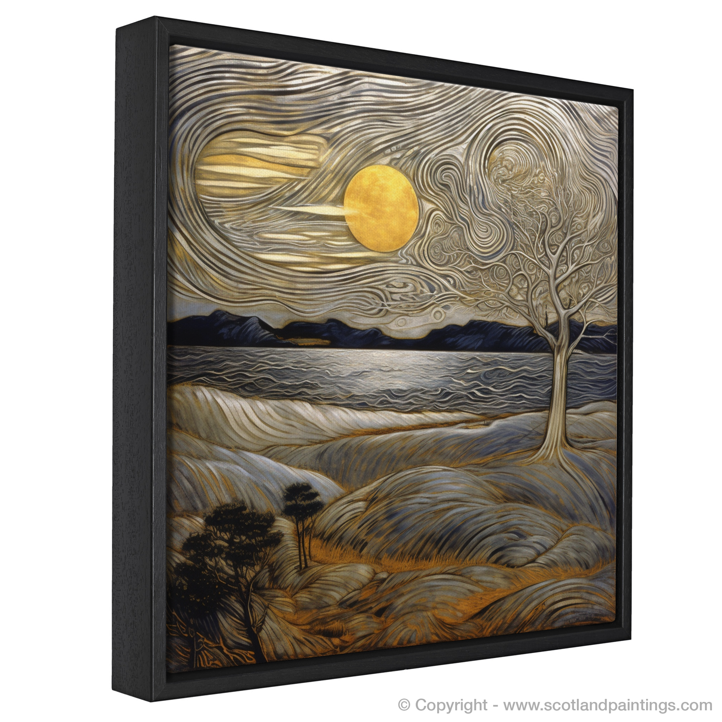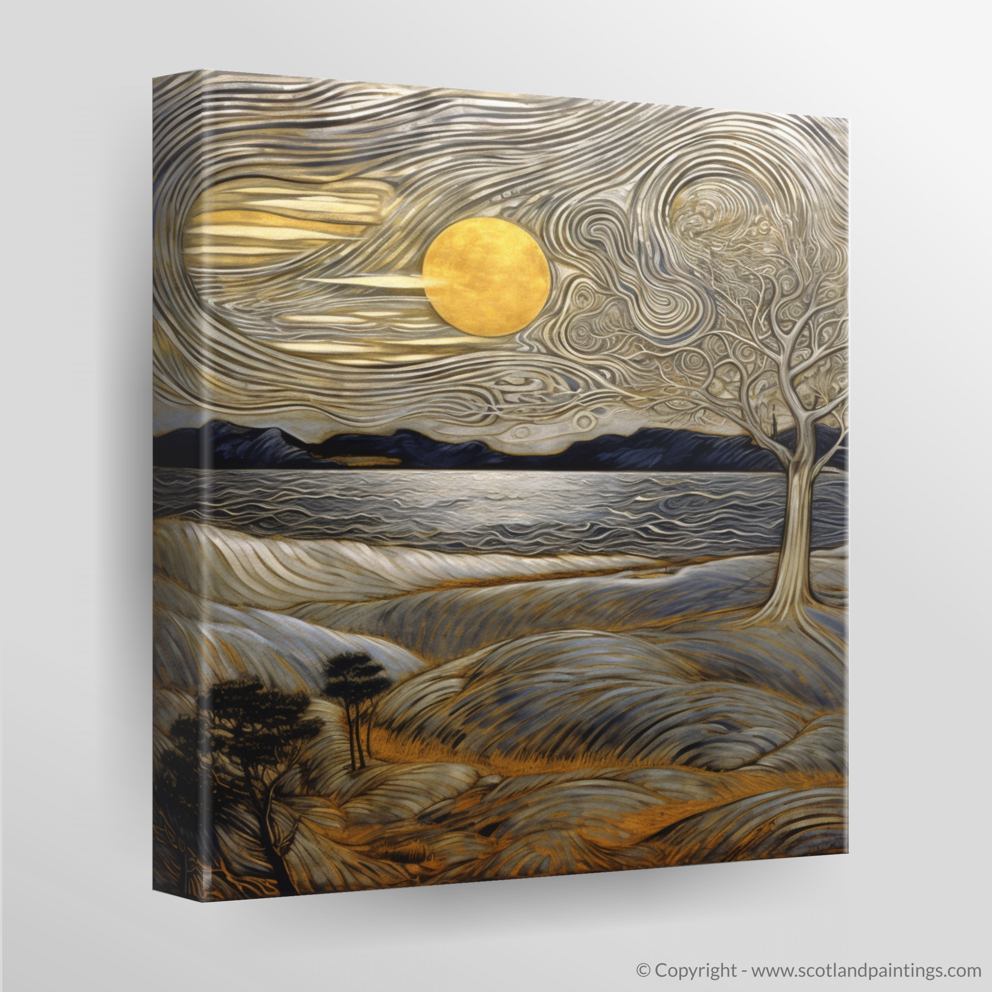 The artwork beckons with its striking contrast of a dark, brooding storm cloud palette and the electric vibrancy typical of pop art. Swirls of deep blue and grey dominate the sky, reminiscent of the dramatic, unpredictable Scottish weather, while the sea mirrors this moodiness with its own turbulent strokes and waves.